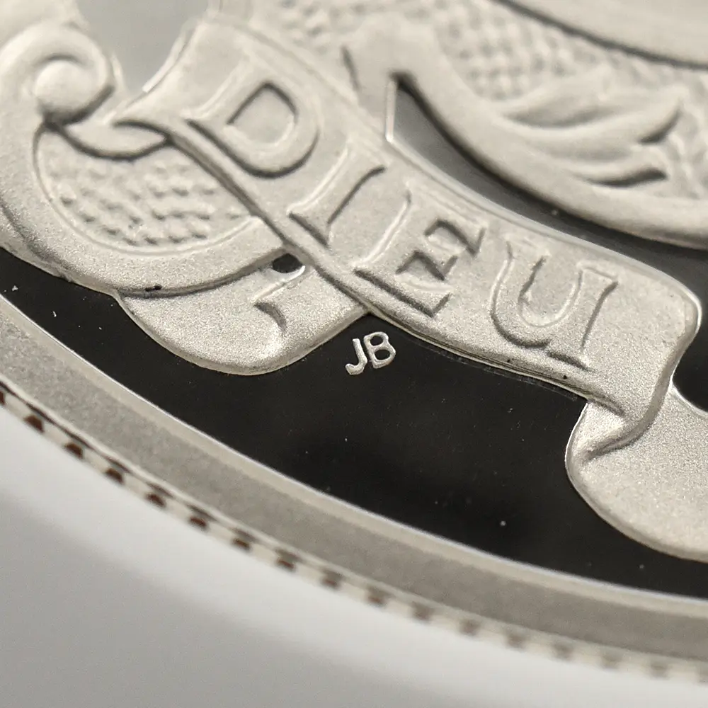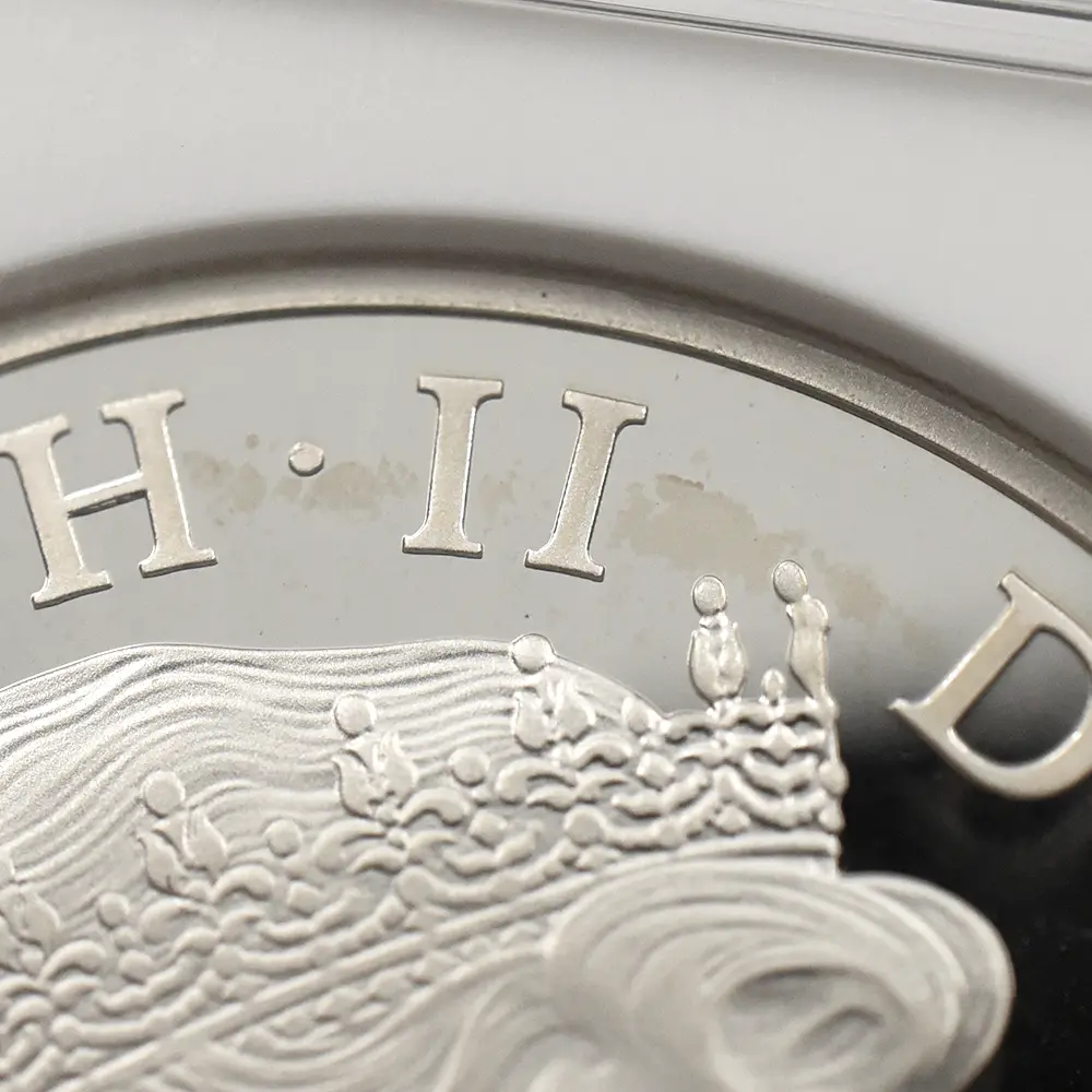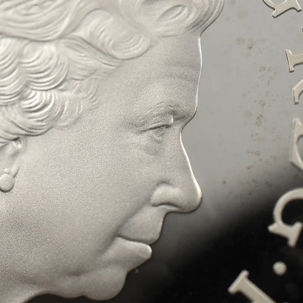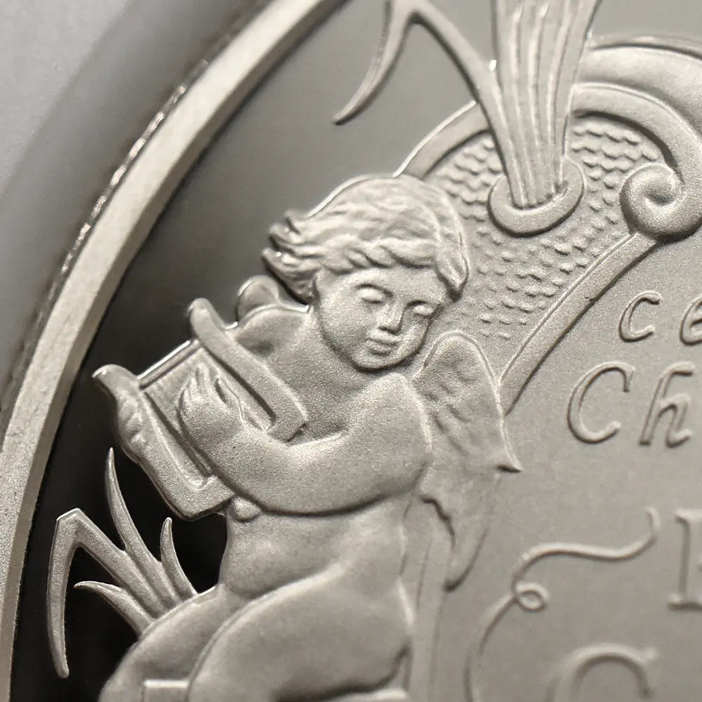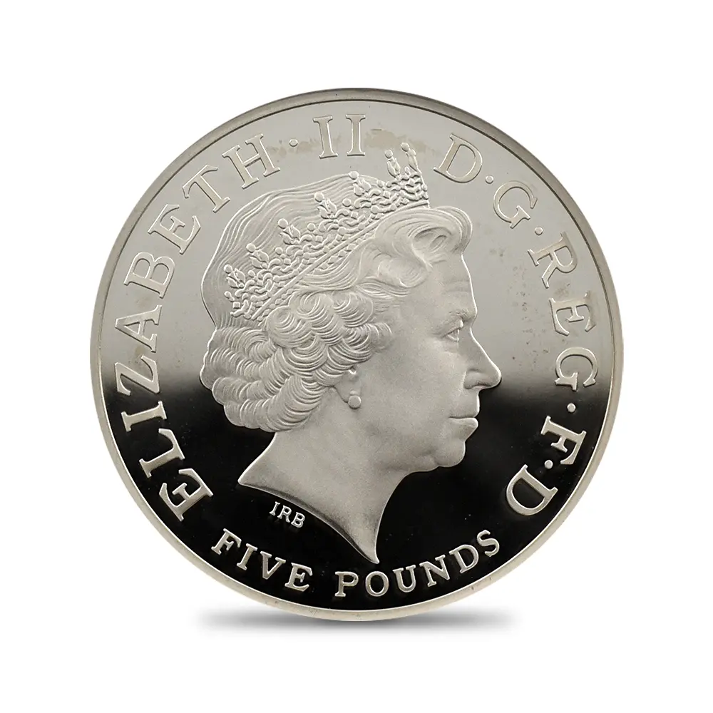 今回ご紹介のコインは、ジョージ王子の洗礼を記念して2013年にロイヤルミントが発表した5ポンド銀貨の珍しいピエフォータイプです。ピエフォーというのは通常のコインの約2倍の厚みを持つ貨幣のことで、何かの記念行事や特別の機会を祝して時折製造されるのみの珍しいタイプを指します。コイン裏面にはバロック様式を主軸とする装飾性豊かなカルトゥーシュが配置されていますが、その中には王子の名前と共に同年に洗礼を受けた旨などが独特の字体によって華麗に刻まれています。カルトゥーシュというのは元々古代エジプトで用いられていた飾りですが、ヨーロッパ諸国においては特別な碑文を掲げる背景として用いられることが多く、そのほとんどは極めてデコラティブなものです。カルトゥーシュの上部には将来王子が継承するであろう英国王位を象徴する大型の宝冠が見られます。そしてカルトゥーシュの両側には生き生きとした2人の天使が配されていますが、生まれたばかりの王子のかわいらしさを強調しているかのようです。コイン表面には王子にとって曾祖母に当たる故エリザベス2世の「公式第4コイン肖像」が掲げられています。現代英国を代表する名彫刻家イアン・ランク・ブロードリーの最高傑作との呼び声が高いこのコイン肖像は、前5作を数える女王の公式コイン肖像の中でも一際写実性に優れた作品として知られています。女王の頭上に輝く宝飾品は、「大英帝国とアイルランドの少女たちのティアラ」と呼ばれる英国王室屈指の秘宝で、1947年の女王とフィリップ王子の成婚の際に女王の祖母のメアリー王妃から伝授されたものです。この肖像には曾孫の誕生を心から喜ぶ曾祖母の会心の微笑みを間近に感じ取ることができます。将来の王位継承者と云えども一王子のためにこの様な特別な洗礼記念のコインが発行されることは極めて珍しいことです。それ故に当コインからは女王を始めとするウィンザー家の人々の王子の誕生に対する衷心からの喜びが伝わってきます。未来の君主の生涯一度の洗礼記念に捧げられる当コインは、英国王室のアニバーサリー関連作品の異色作として、長きにわたって愛されることでしょう。