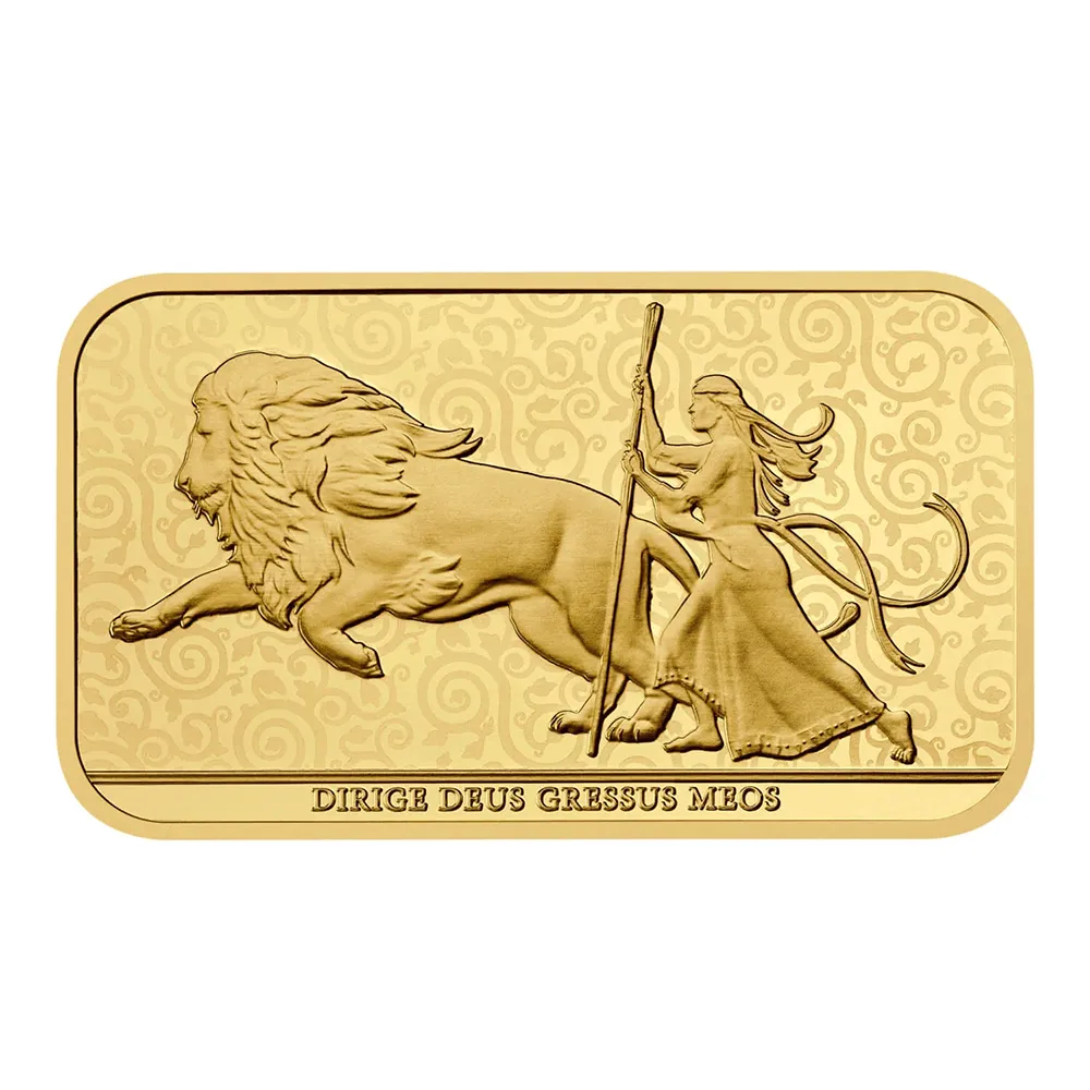 英国貨幣の金字塔として貨幣史上に君臨する1839年発行のオリジナル「ウナとライオン」。2019年にはロイヤルミントによって初のリマスター版が発行され、「偉大なる彫刻家シリーズ」の第1弾として新たなスタートを切りました。その前後にもイギリスの海外属領や連邦各国から同作品を扱った種々の作品がいずれも好評を博し、さながら「ウナとライオン・リバイバル」の様相を呈していた感があります。今回ご紹介させていただく作品は、新しいデザインによる「ウナとライオン」の1オンスゴールドバーです。同バーの裏面には空中を浮遊しているかのようなウナとライオンのたおやかな姿が描かれており、バーならではの長方形の形状が大いに活かされたデザインとなっています。天空を駆け巡る彼らの颯爽たる姿は、英国貨幣界にとっての新たな時代の象徴でもあります。デザインの下部には、1839年のオリジナル「ウナとライオン」に掲げられていたものと同じ碑文が刻まれており、「Dirige Deus Gressus Meos=神よ我が歩みを導き給え」と読むことができます。大英帝国の君主として臣民を導くヴィクトリア女王の王権の正当性を承認するこの文言は、これまでにも幾つかのモダンコイン上にて普遍的な碑文の形として転用されてきたものです。近年地金型コインと並んで注目を集めている一連の地金型バー。英国コインを愛する全てのコレクターにお勧めしたい新時代のウナの秀作が、地金型バーのコレクションにまた一つ加わったことは実に感慨深いことです。
