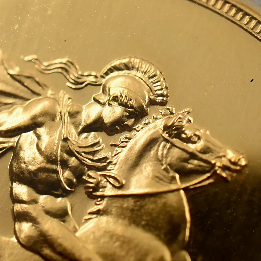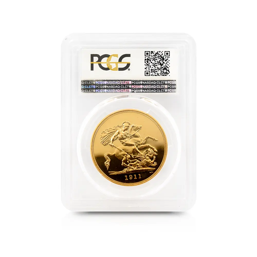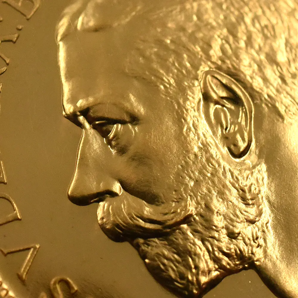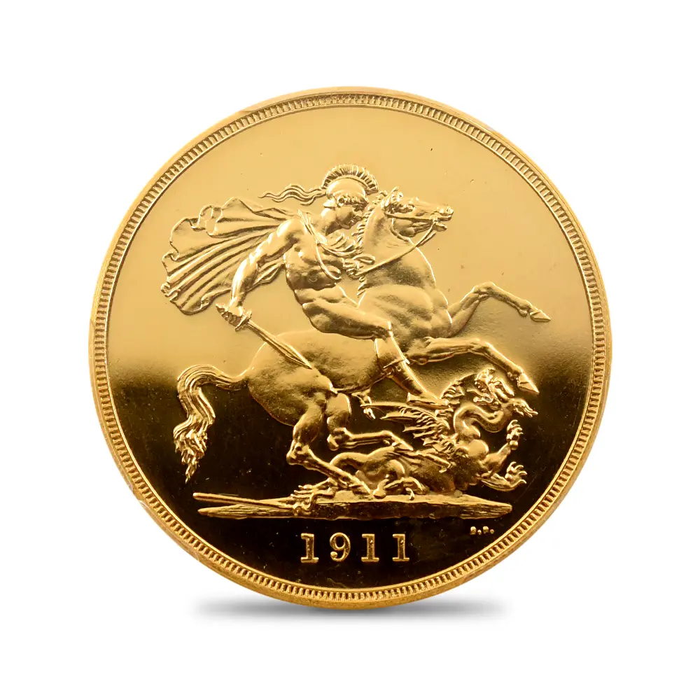その荘厳極まりない戴冠式の記念すべき年に発表された当コインは格別の趣で、表面に描かれた左向きのジョージ五世のポートレートは国王の堂々たる風格を感じさせる絶品です。重厚感のある王の肖像を囲むのはラテン語による格調高い碑文で、「神の恩寵によるグレートブリテン国王ジョージ五世。忠誠の擁護者にしてインドの皇帝」の文言がジョージ五世の至高の身位を物語っています。裏面にはマントを翻して駿馬に跨るセントジョージの雄姿が刻まれており、悪の象徴であるドラゴンを退治するその一途な姿は、命を賭して国を守る帝王の仮の姿と捉えることが出来ます。この一世一代の豪華絢爛たる戴冠式の記憶は1911年の年代とともにコイン上に深く刻まれ、後世に受け継がれるべき究極の記念品として不変の価値を有しているように思われます。