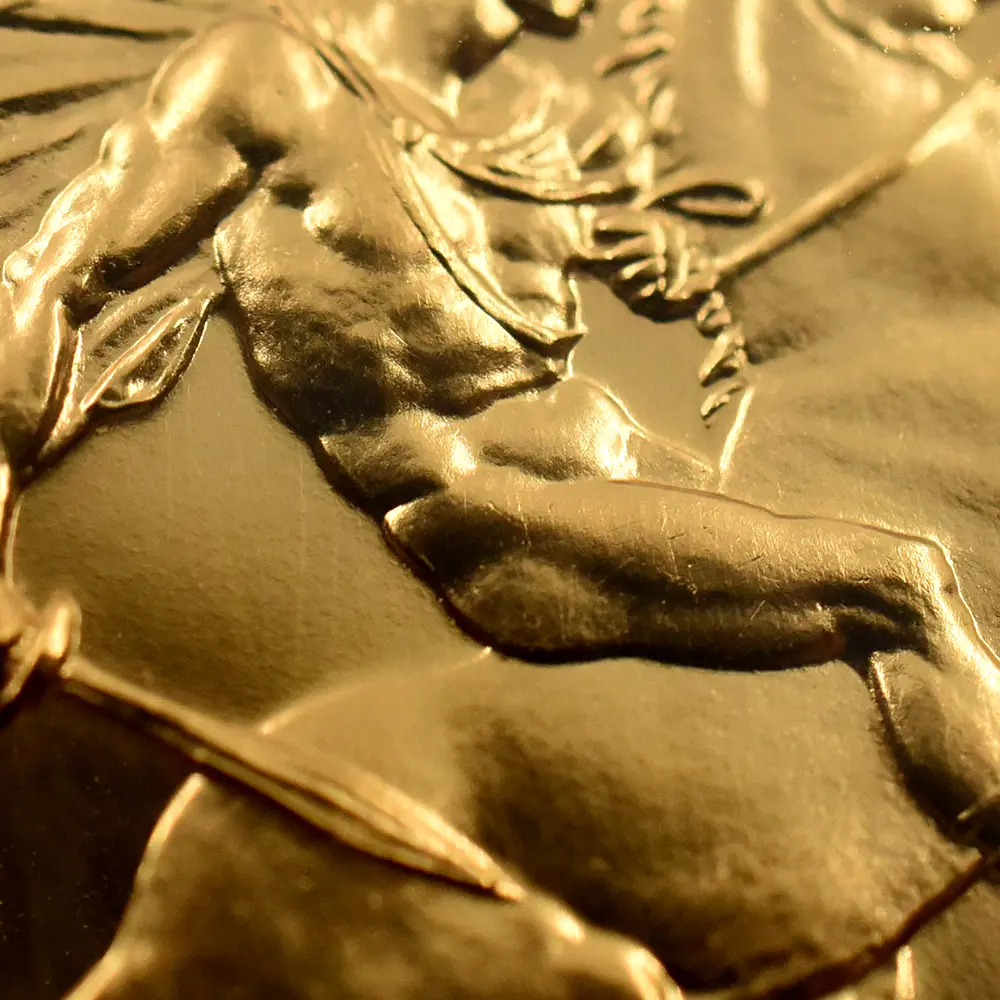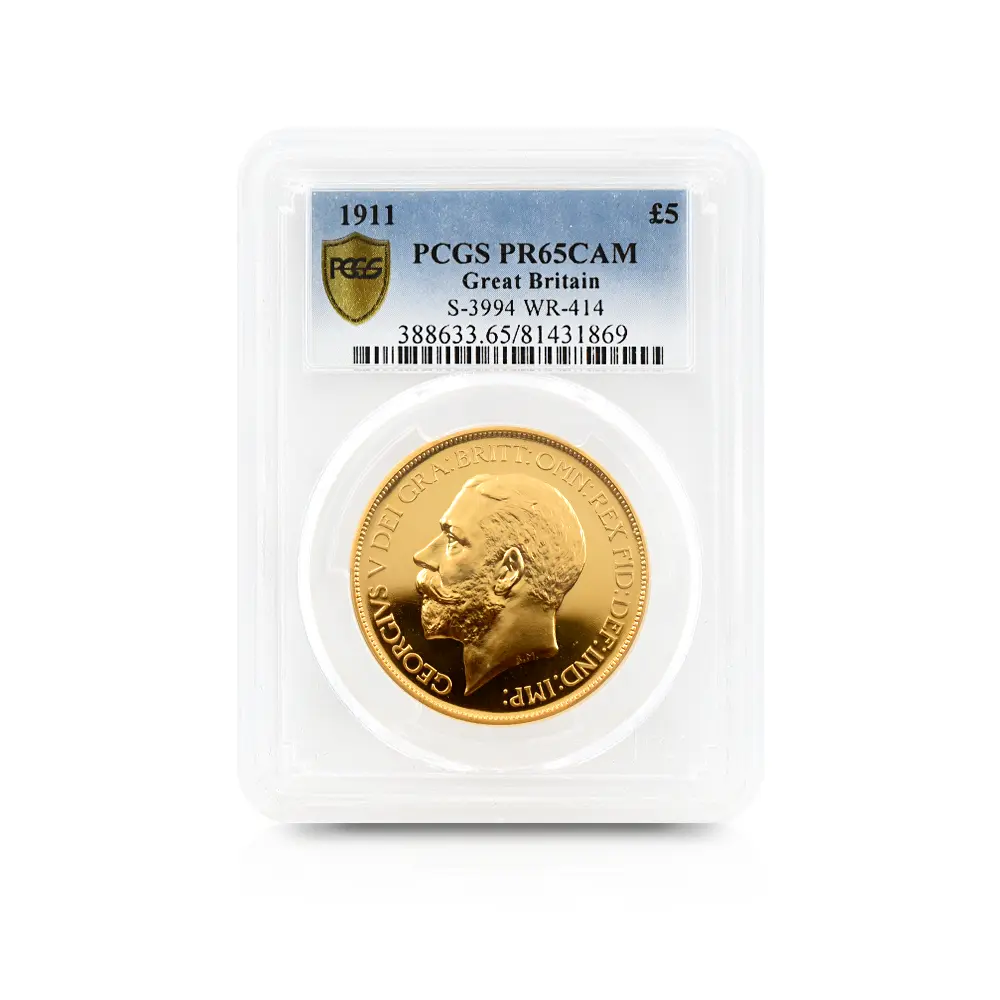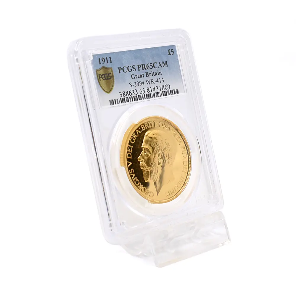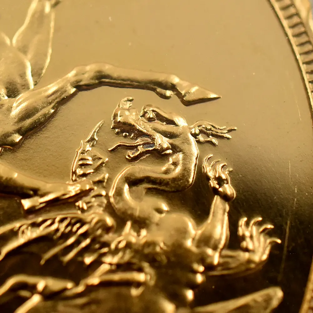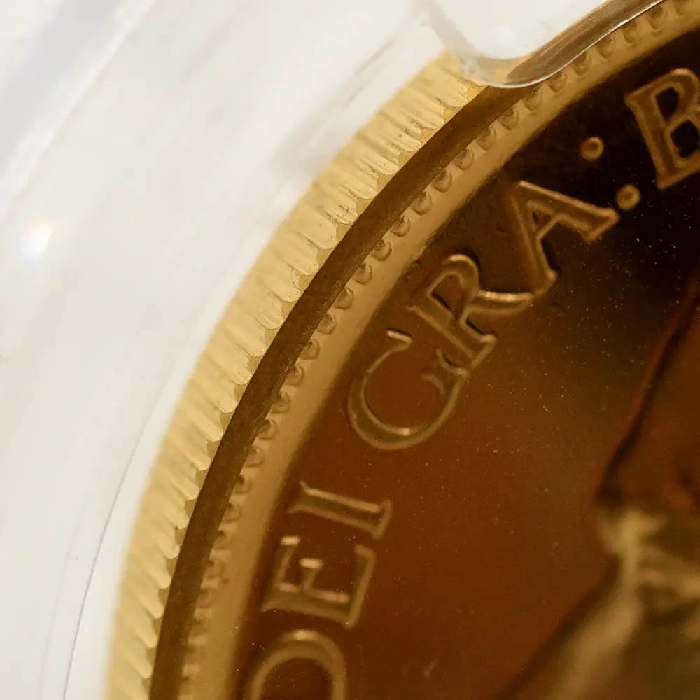 その荘厳極まりない戴冠式の記念すべき年に発表された当コインは格別の趣で、表面に描かれた左向きのジョージ五世のポートレートは国王の堂々たる風格を感じさせる絶品です。重厚感のある王の肖像を囲むのはラテン語による格調高い碑文で、「神の恩寵によるグレートブリテン国王ジョージ五世。忠誠の擁護者にしてインドの皇帝」の文言がジョージ五世の至高の身位を物語っています。裏面にはマントを翻して駿馬に跨るセントジョージの雄姿が刻まれており、悪の象徴であるドラゴンを退治するその一途な姿は、命を賭して国を守る帝王の仮の姿と捉えることが出来ます。この一世一代の豪華絢爛たる戴冠式の記憶は1911年の年代とともにコイン上に深く刻まれ、後世に受け継がれるべき究極の記念品として不変の価値を有しているように思われます。