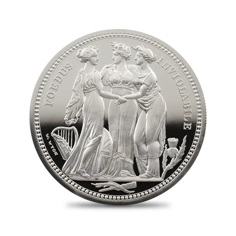 全世界的な脚光を浴び、貨幣史上空前の人気を誇ったロイヤルミントによる2019年「偉大なる芸術家シリーズ」の「ウナとライオン」に続く第2弾の満を持しての登場です。今回選定されたのは前回と同じく19世紀最高のコイン彫刻家ウィリアム・ワイオンによる最初期の傑作「スリーグレーセス」です。ワーテルローの戦いによって閉幕したナポレオン戦争後の英国社会の安定と平和を背景とする三人の女神たちの無言の対話を描くデザインによって称賛され続けています。ギリシャ神話に材を求めて描かれた三美神は、それぞれ若さ・歓喜・気品を象徴しており、崇高な空気を醸し出しています。19世紀初頭に頂点を極めた新古典様式を基調として描かれる三人の姿は、足元に見られるそれぞれの国家のシンボルと共に連合王国の確固たる統一を暗示しています。当銀貨最大のメッセージは三美神の繊細優雅な趣と、その背後に厳然として存在する英国の政治的宿願ではないでしょうか。