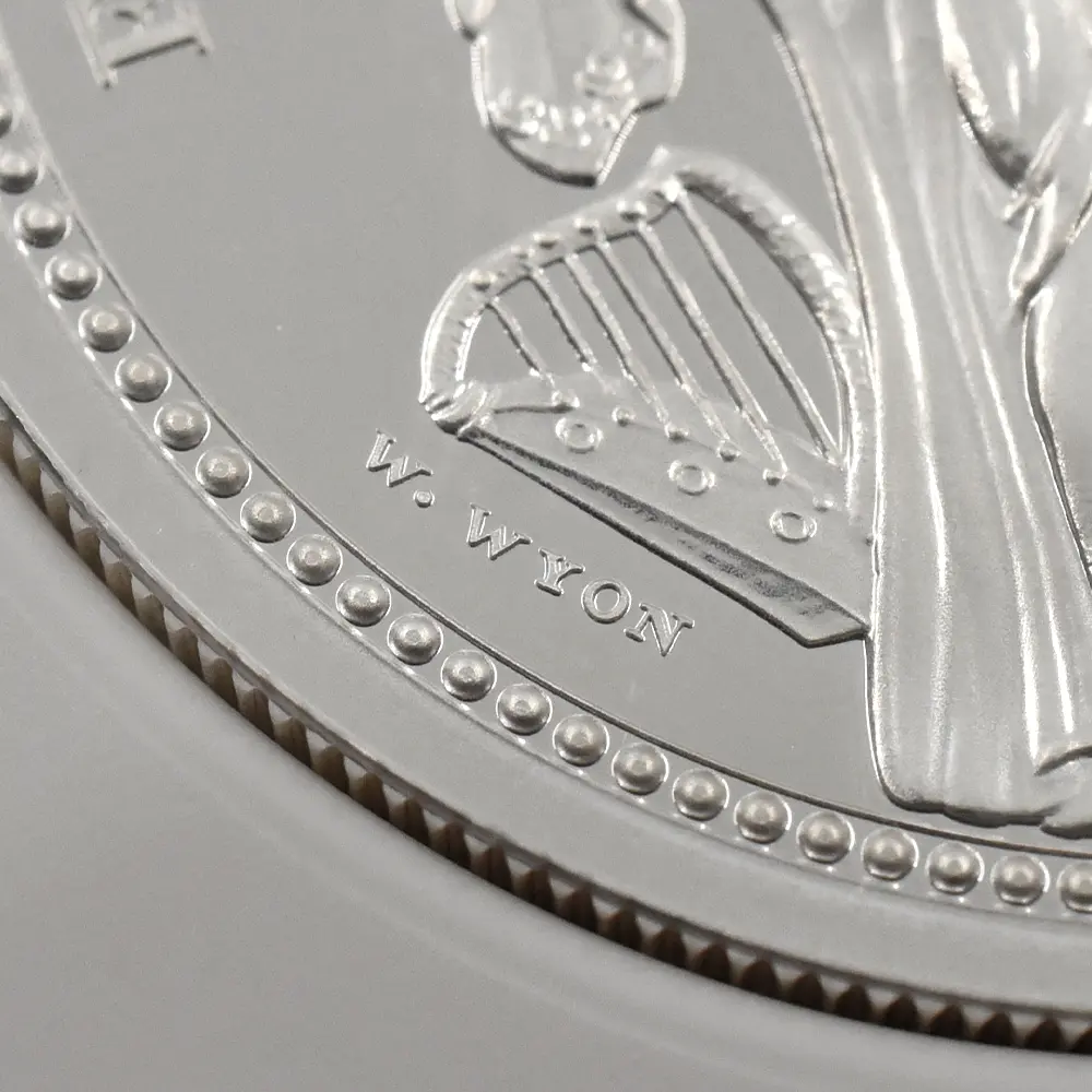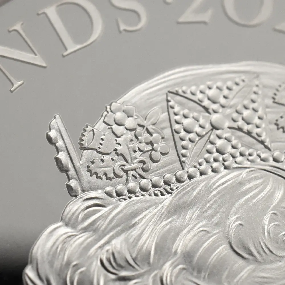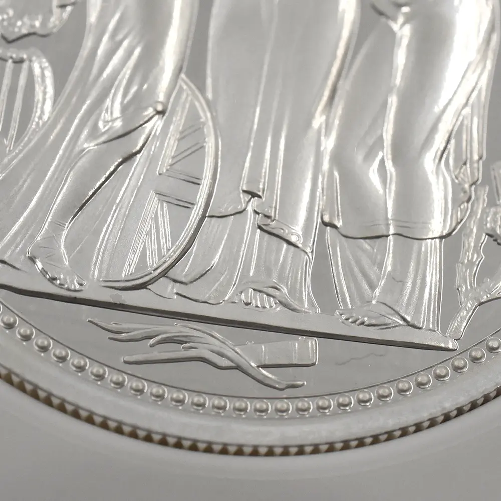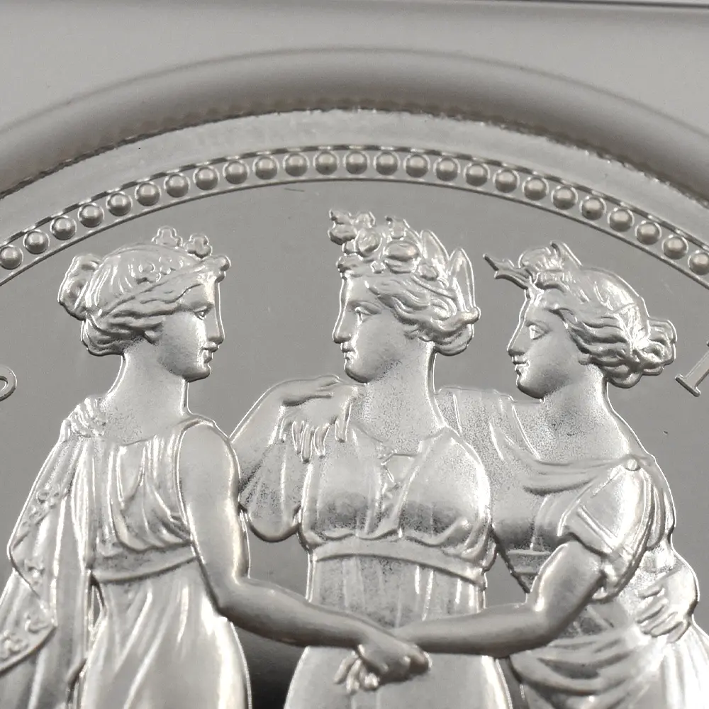 当銀貨表面に描かれているエリザベス二世の格調高いポートレートは現代を代表するロイヤルミントのデザイナー、ジョディ―・クラークの最高傑作です。女王の頭部を飾る英国王室屈指の至宝「ステート・ダイアモンド・ダイアデム」は、シルバーの素材感によって驚異的な重厚感を醸し出しています。ワイオンの手による数ある名品の中でも最も柔らかな質感を表現し尽くしている「スリーグレーセス」の意匠ですが、シルバープルーフの新鮮な輝きが三美神の柔らかな肢体と流れるようなドレープの美しさを最大限強調しており、見どころの多さがその特徴となっています。コインの表裏にそれぞれの時代の傑作を頂く当銀貨は、ロイヤルミントによる貨幣製造技術の粋を極めた完成度の高さによって現代に蘇った奇跡的名貨です。三美神に代表される英国の理想は艶やかなシルバーの輝きと共に永久不滅となりました。