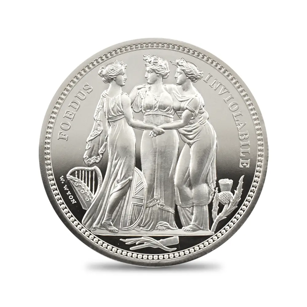全世界的な脚光を浴び、貨幣史上空前の人気を誇ったロイヤルミントによる2019年「偉大なる芸術家シリーズ」の「ウナとライオン」に続く第2弾の満を持しての登場です。今回選定されたのは前回と同じく19世紀最高のコイン彫刻家ウィリアム・ワイオンによる最初期の傑作「スリーグレーセス」です。ワーテルローの戦いによって閉幕したナポレオン戦争後の英国社会の安定と平和を背景とする三人の女神たちの無言の対話を描くデザインによって称賛され続けています。ギリシャ神話に材を求めて描かれた三美神は、それぞれ若さ・歓喜・気品を象徴しており、崇高な空気を醸し出しています。19世紀初頭に頂点を極めた新古典様式を基調として描かれる三人の姿は、足元に見られるそれぞれの国家のシンボルと共に連合王国の確固たる統一を暗示しています。当銀貨最大のメッセージは三美神の繊細優雅な趣と、その背後に厳然として存在する英国の政治的宿願ではないでしょうか。