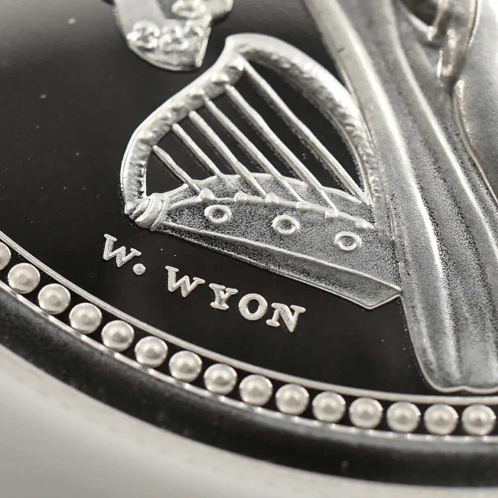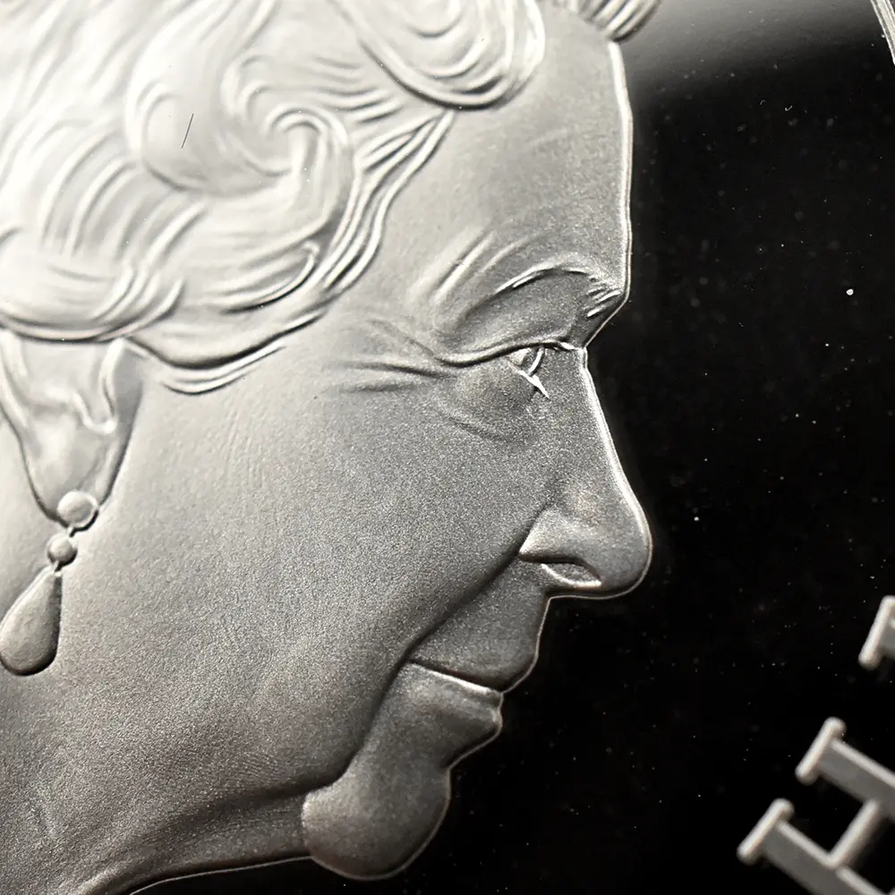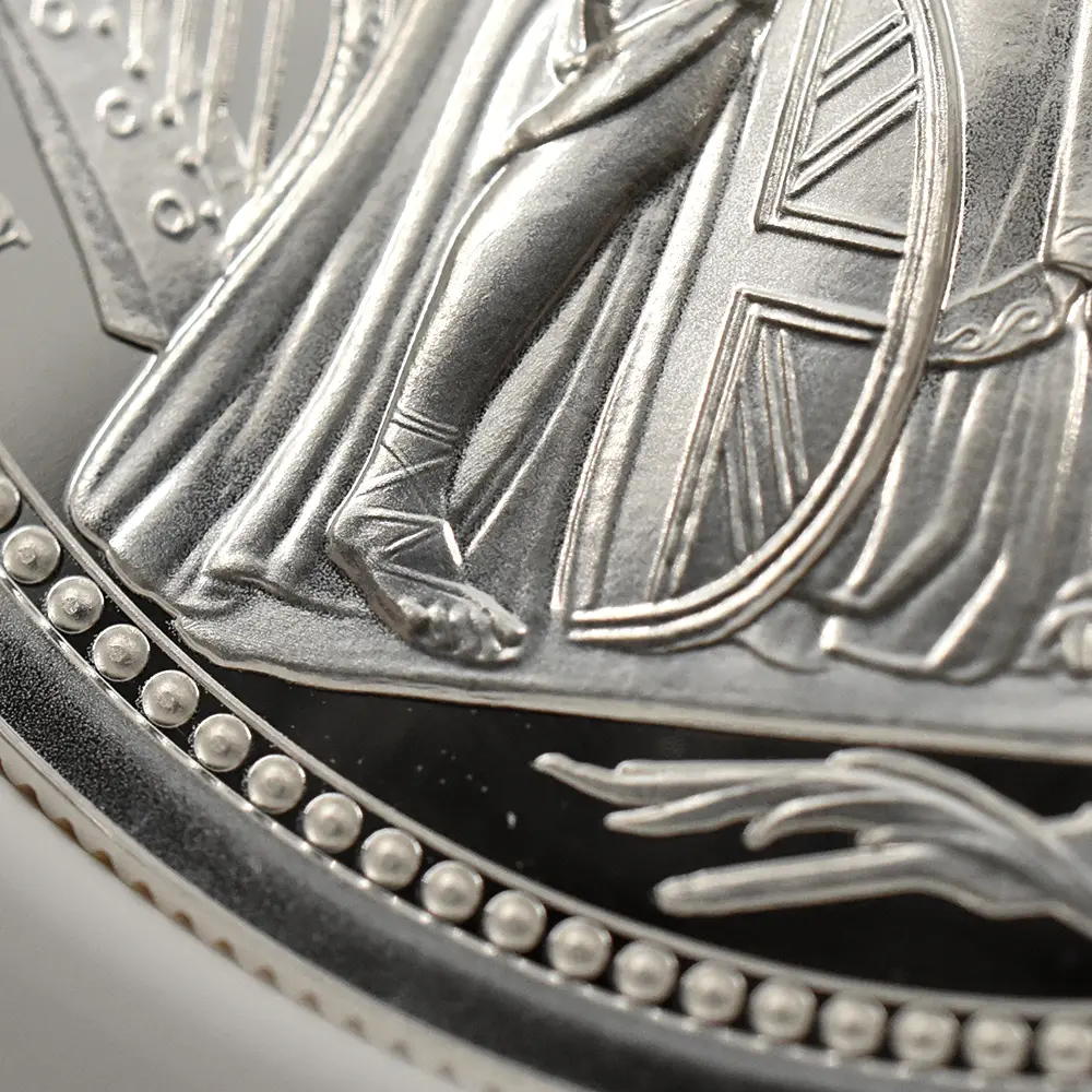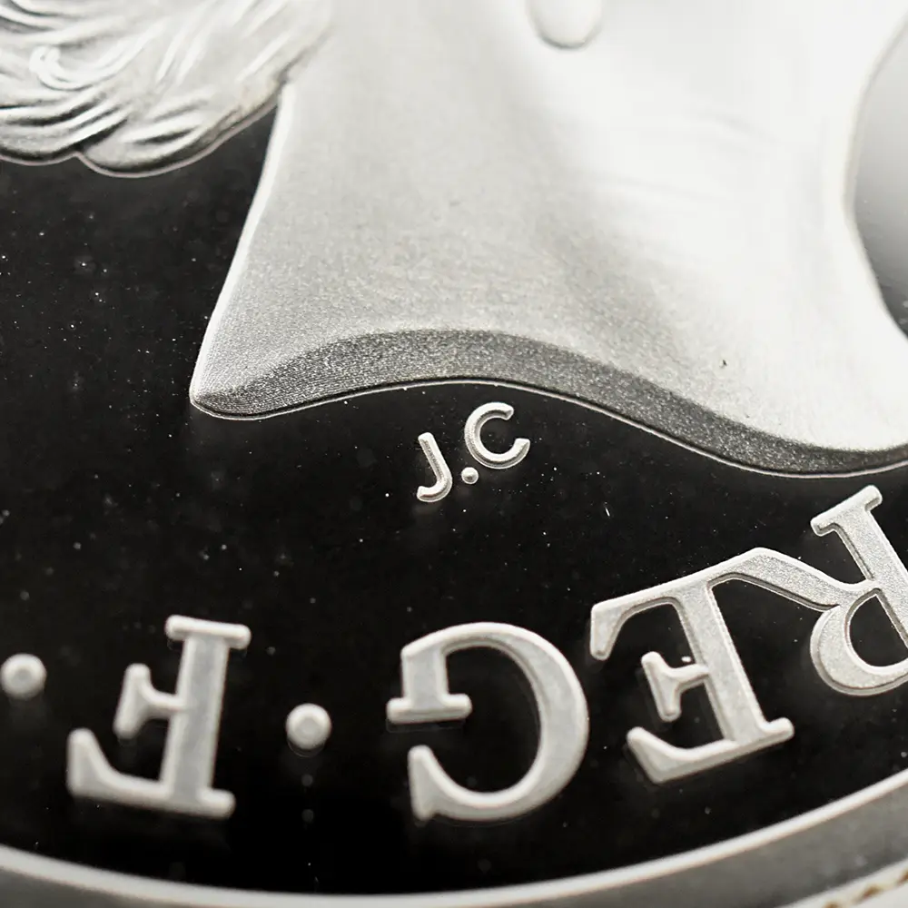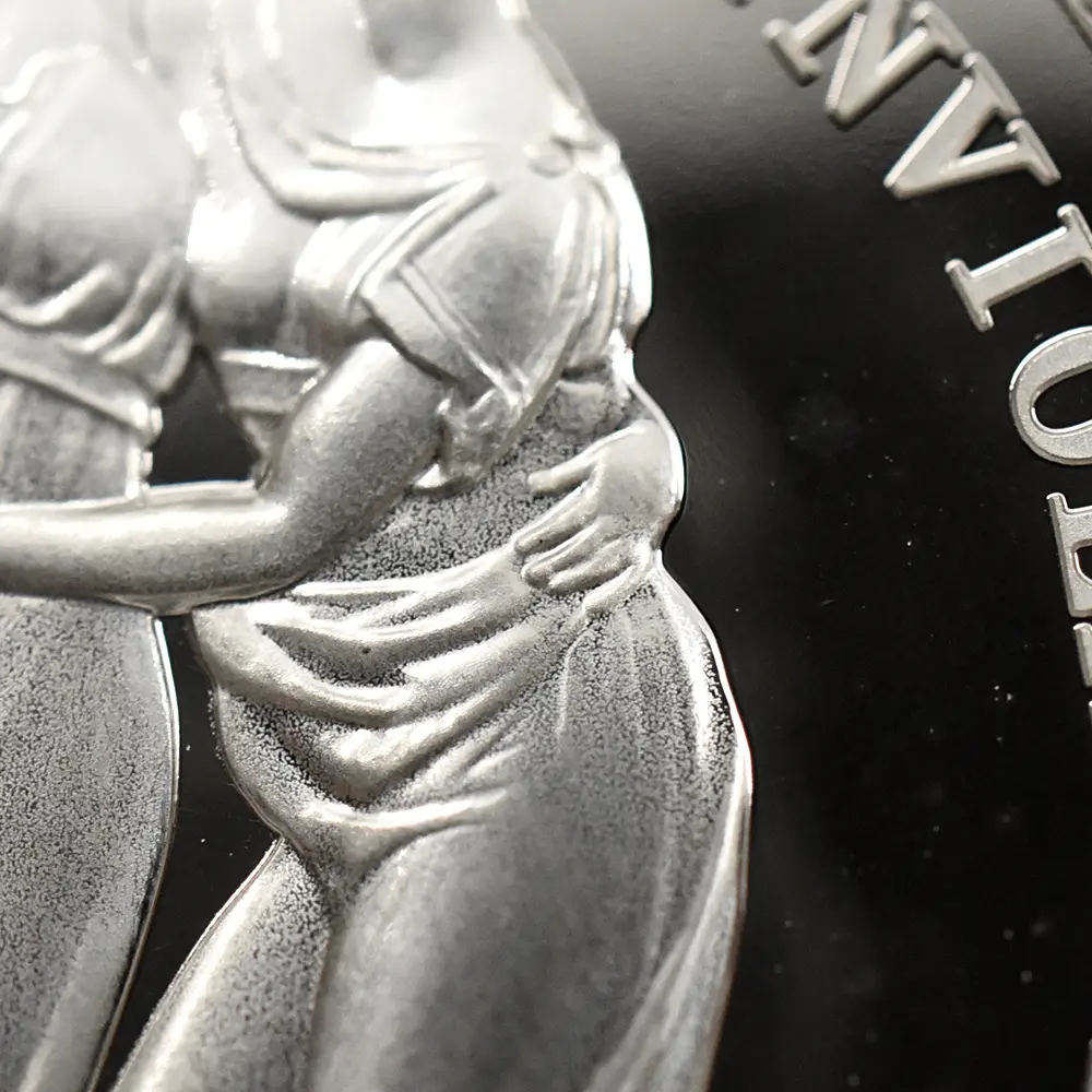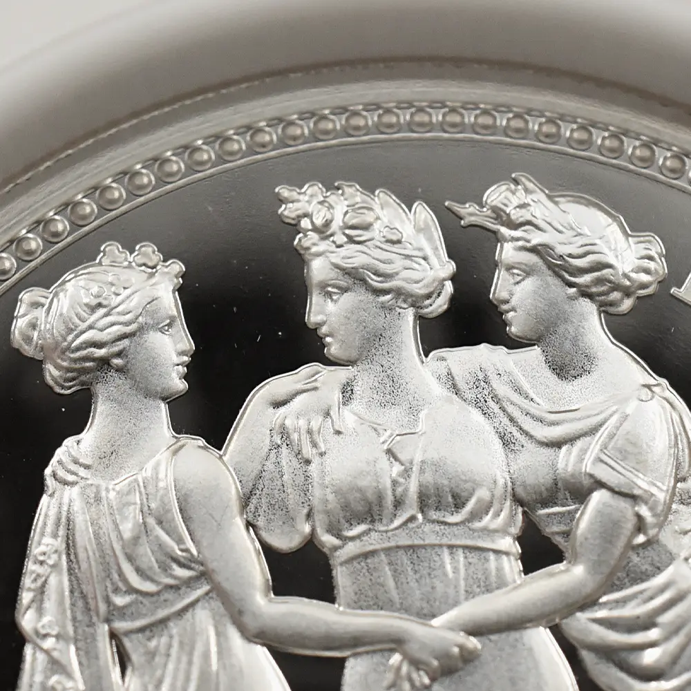 当銀貨表面に描かれているエリザベス二世の格調高いポートレートは現代を代表するロイヤルミントのデザイナー、ジョディ―・クラークの最高傑作です。女王の頭部を飾る英国王室屈指の至宝「ステート・ダイアモンド・ダイアデム」は、シルバーの素材感によって驚異的な重厚感を醸し出しています。ワイオンの手による数ある名品の中でも最も柔らかな質感を表現し尽くしている「スリーグレーセス」の意匠ですが、シルバープルーフの新鮮な輝きが三美神の柔らかな肢体と流れるようなドレープの美しさを最大限強調しており、見どころの多さがその特徴となっています。コインの表裏にそれぞれの時代の傑作を頂く当銀貨は、ロイヤルミントによる貨幣製造技術の粋を極めた完成度の高さによって現代に蘇った奇跡的名貨です。三美神に代表される英国の理想は艶やかなシルバーの輝きと共に永久不滅となりました。