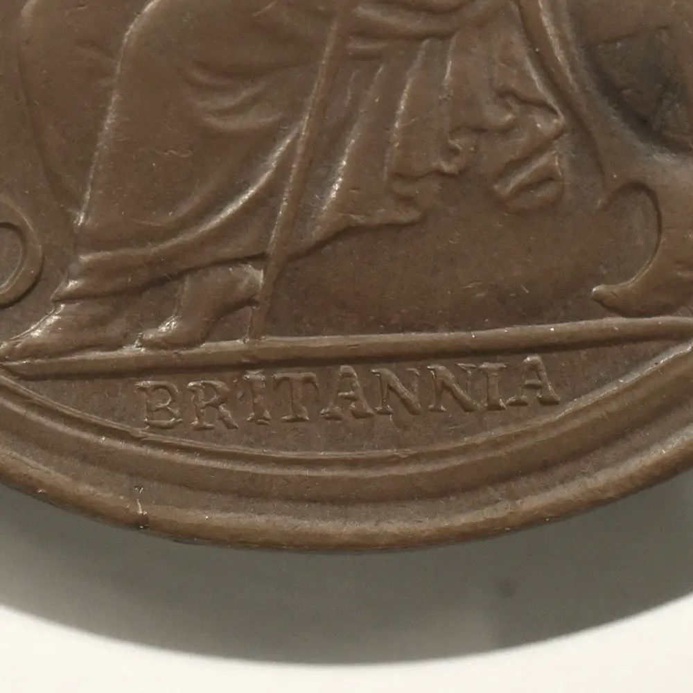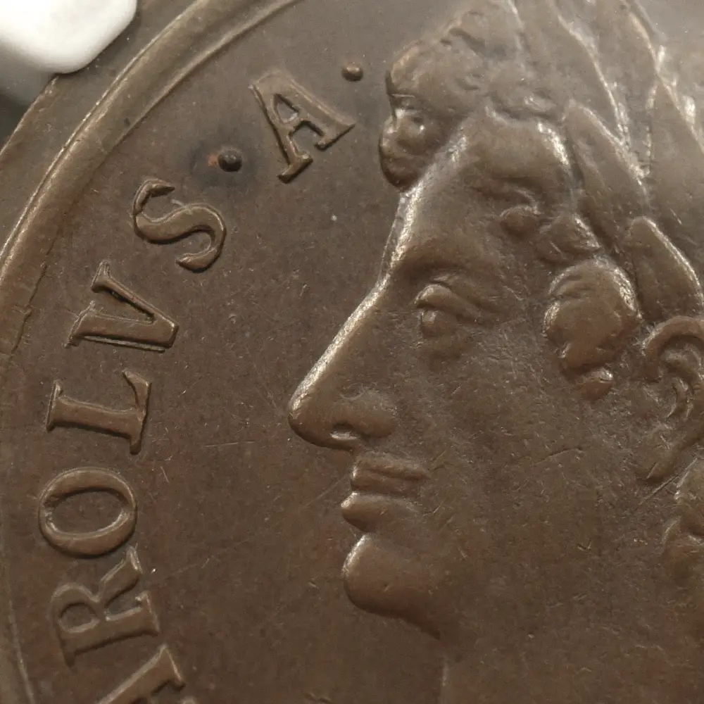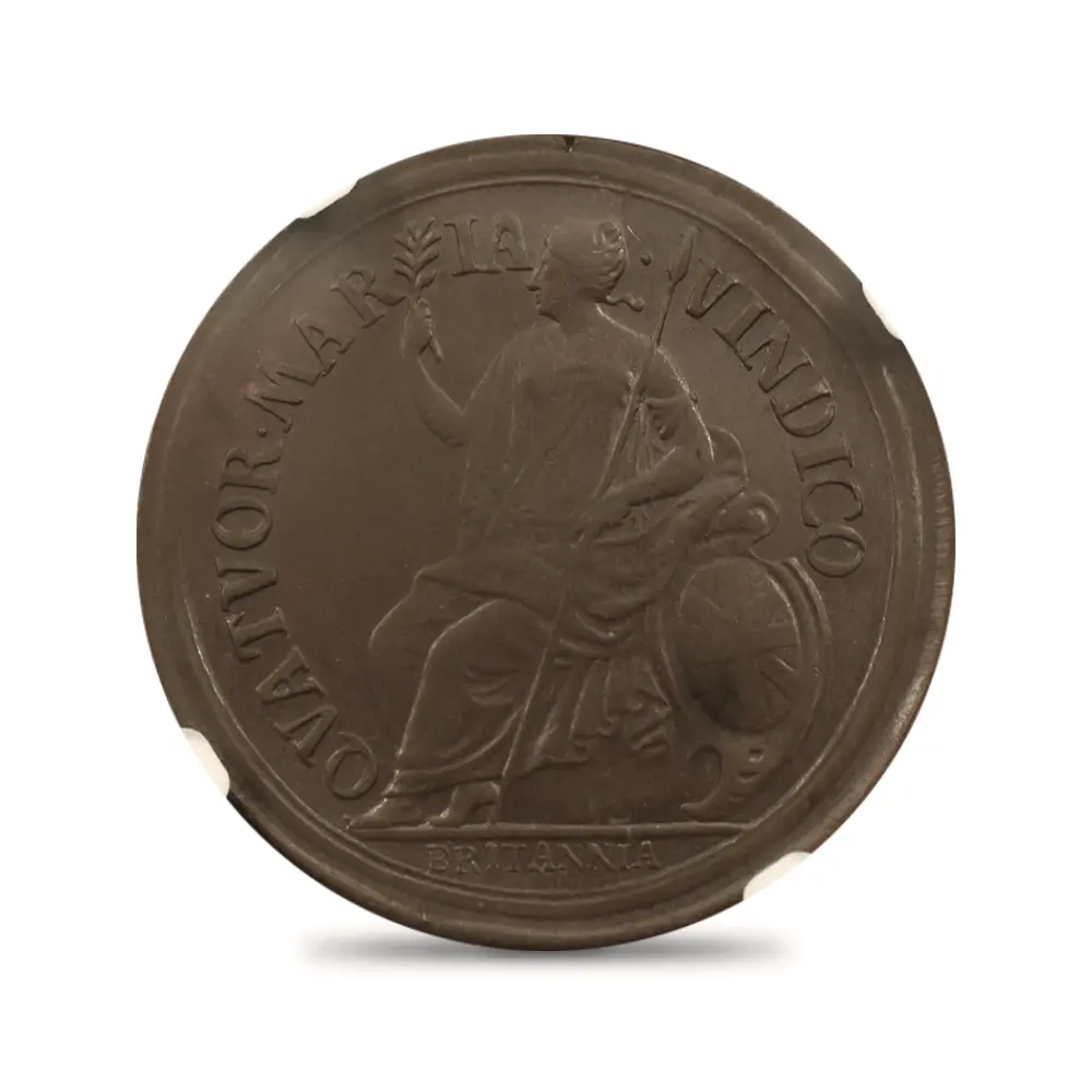 1670年代初頭に発行されたと推定される当1/2ペンス銅貨は、良好な保存状態と銅貨ならではの質感が両面のデザインを心地よく強調する芸術性豊かなアンティークコインです。政敵であり共和政の護国卿として知られていたクロムウェルの肖像と反対の右向きのポートレートが圧倒的に多いチャールズ2世のコインですが、当コインの肖像は珍しく左向きとなっています。古代ローマ時代以降、勝利者の象徴とされる月桂冠を戴くチャールズ2世の勇壮なポートレートは、クロムウェルのイングランド共和国を打倒し、王政を復活させた意志の人チャールズ2世の熱烈な愛国心を感じさせるものです。英国史上における近世の始まりを告げるチャールズ2世の治世下に発行された種々のコインですが、この1/2ペンス銅貨もまた王の時代のコインならではの特色とされるクローズアップされた大型のポートレートを掲げています。比較的平面的な絵画技法を主とするこの美しい肖像は、在りし日の王の権力を伝えるのみならず、その後のコイン肖像のプロトタイプとしての歴史的価値をも併せ持ちます。そしてこのコインの眼目である裏面のデザインですが、中央にはブリタニアの座像が描かれ、グレコ・ローマ風の緩やかな衣装を纏った女戦士の姿で観る者を魅了します。そしてブリタニアに欠かせない兜、槍、盾の三点はこの裏面にもしっかりと刻まれ、下部の「ブリタニア」の名が無くともこの肖像がブリタニアのそれであることは一目瞭然です。そして注目に値するのは、ポートレートの周囲のラテン語の碑文です。「4つの海を制覇する」という意味のこの碑文は、このコインを含むチャールズ2世の時代に発行されたブリタニアコインならではの標語として知られていますが、9世紀のアルフレッド大王の治世以降、世界最大の海洋覇権国家として発展を遂げていた当時の英国を代表する表象として、海の女神でもあるブリタニアを置いてほかに無いことを強くアピールする正にブリタニアのための文言ではないでしょうか。17世紀以降、英国貨幣史の変遷と命運を共にしてきたブリタニアですが、当1/2ペンス銅貨の突然の出現を機に、再び英国の尊厳のシンボルとしての真価を発揮する機会を得たように思われます。