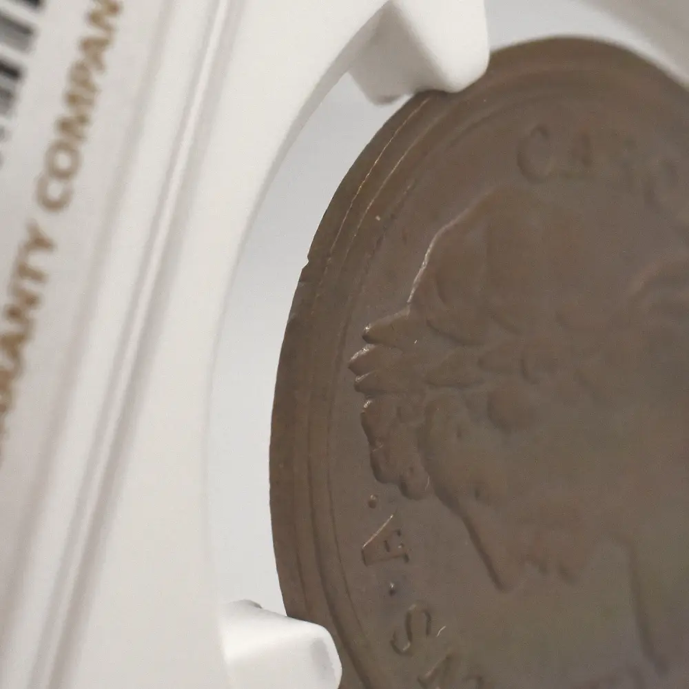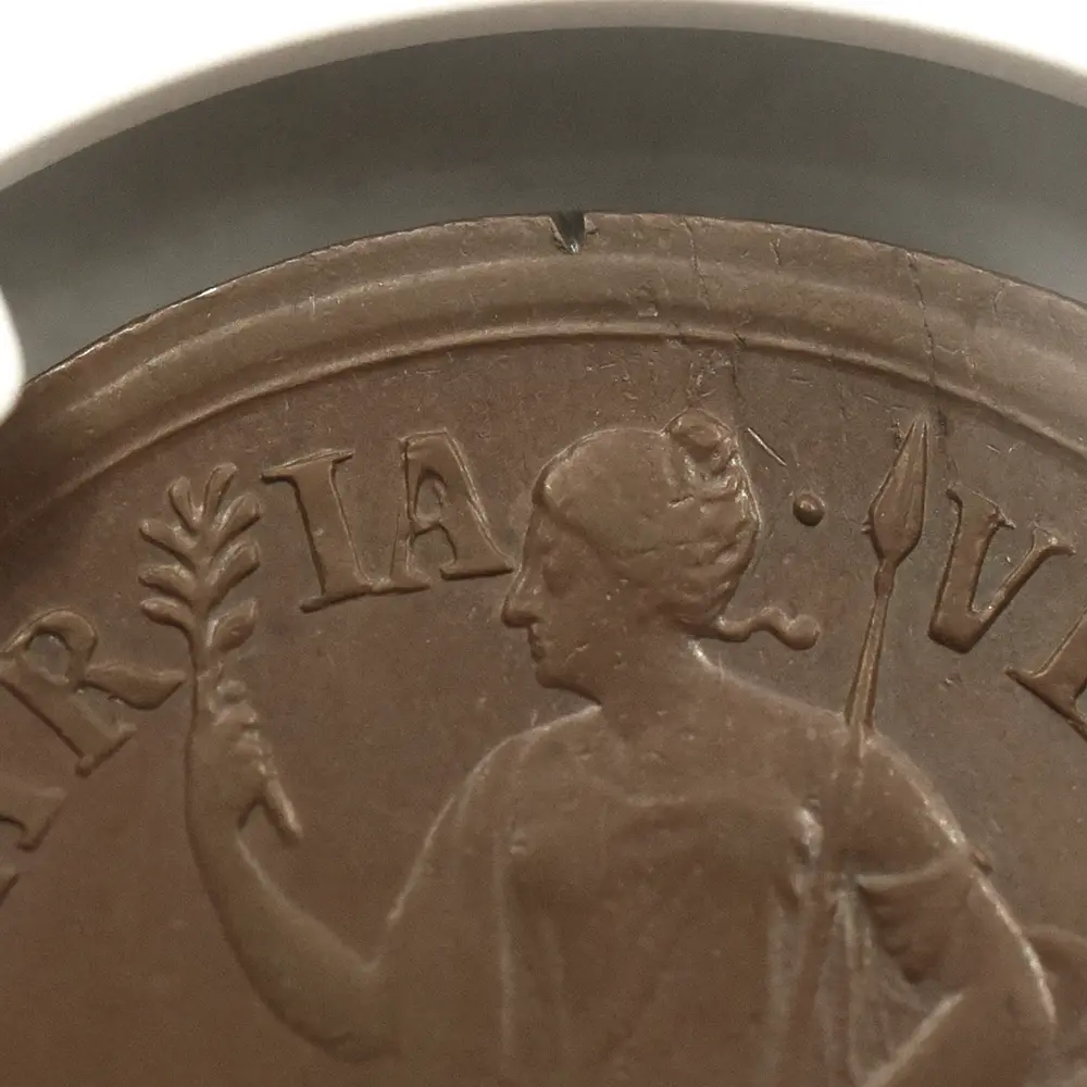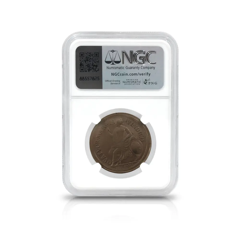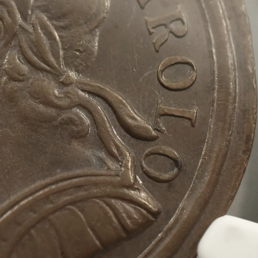 1670年代初頭に発行されたと推定される当1/2ペンス銅貨は、良好な保存状態と銅貨ならではの質感が両面のデザインを心地よく強調する芸術性豊かなアンティークコインです。政敵であり共和政の護国卿として知られていたクロムウェルの肖像と反対の右向きのポートレートが圧倒的に多いチャールズ2世のコインですが、当コインの肖像は珍しく左向きとなっています。古代ローマ時代以降、勝利者の象徴とされる月桂冠を戴くチャールズ2世の勇壮なポートレートは、クロムウェルのイングランド共和国を打倒し、王政を復活させた意志の人チャールズ2世の熱烈な愛国心を感じさせるものです。英国史上における近世の始まりを告げるチャールズ2世の治世下に発行された種々のコインですが、この1/2ペンス銅貨もまた王の時代のコインならではの特色とされるクローズアップされた大型のポートレートを掲げています。比較的平面的な絵画技法を主とするこの美しい肖像は、在りし日の王の権力を伝えるのみならず、その後のコイン肖像のプロトタイプとしての歴史的価値をも併せ持ちます。そしてこのコインの眼目である裏面のデザインですが、中央にはブリタニアの座像が描かれ、グレコ・ローマ風の緩やかな衣装を纏った女戦士の姿で観る者を魅了します。そしてブリタニアに欠かせない兜、槍、盾の三点はこの裏面にもしっかりと刻まれ、下部の「ブリタニア」の名が無くともこの肖像がブリタニアのそれであることは一目瞭然です。そして注目に値するのは、ポートレートの周囲のラテン語の碑文です。「4つの海を制覇する」という意味のこの碑文は、このコインを含むチャールズ2世の時代に発行されたブリタニアコインならではの標語として知られていますが、9世紀のアルフレッド大王の治世以降、世界最大の海洋覇権国家として発展を遂げていた当時の英国を代表する表象として、海の女神でもあるブリタニアを置いてほかに無いことを強くアピールする正にブリタニアのための文言ではないでしょうか。17世紀以降、英国貨幣史の変遷と命運を共にしてきたブリタニアですが、当1/2ペンス銅貨の突然の出現を機に、再び英国の尊厳のシンボルとしての真価を発揮する機会を得たように思われます。