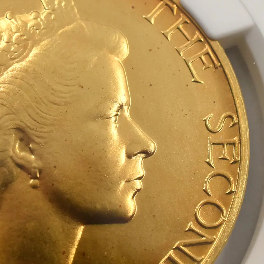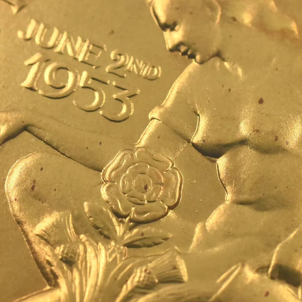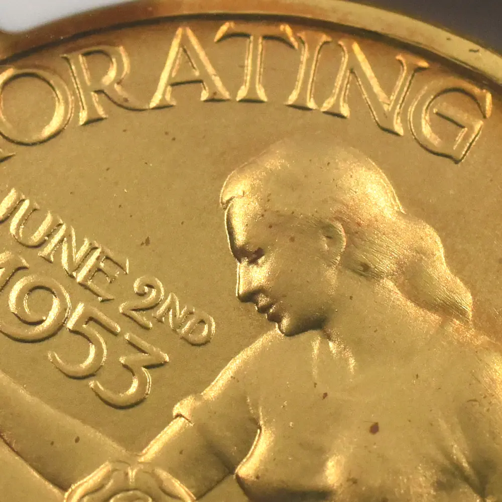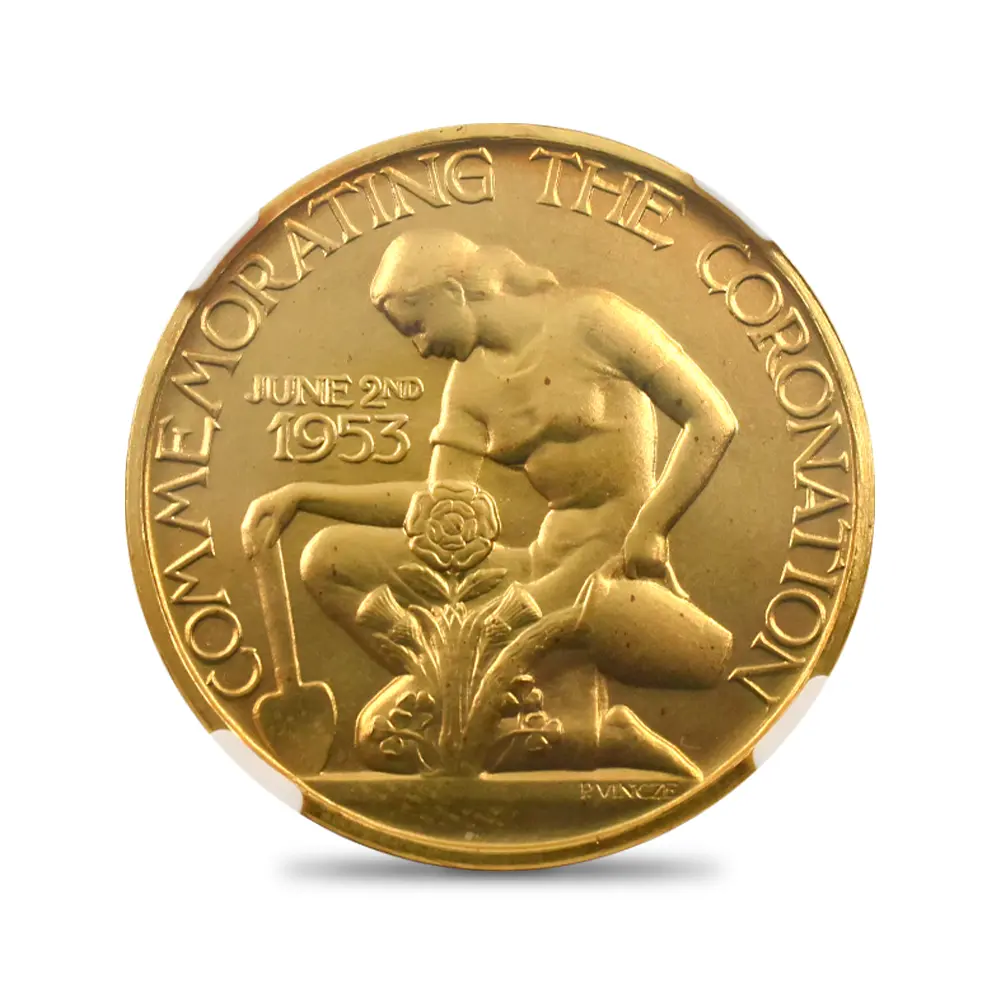 表面に描かれたエリザベス2世の肖像画は、即位当時若干25歳であった女王の若々しい美しさと気品を醸し出しています。女王の頭上に輝くのは、祖母のメアリー王妃伝来の英国王室の秘宝「大英帝国とアイルランドの少女たちのティアラ」です。裏面のデザインは、メダルデザイナーとしてのヴィンツェの天才を実証しています。そこには若い女性が植物に水を与えている平和で感動的な姿が刻まれていますが、英連合王国三国(イングランド、スコットランド、アイルランド)の国花(バラ・アザミ・シャムロック)を守護する女性の姿は、そのままそれらの国々の安定と平和を見届ける若き英国君主の姿に置き換えることが出来ます。3種のメダルのうち、特に18カラット・ゴールドのものは限定25枚しか発行されておらず、この歴史的な儀式の究極の記念品としての絶対的価値を表出しています。戴冠式の年に発行された多種多様なコインとメダルの中で、当作品はそのデザイン性と希少価値において特筆されるものであるため、マニアにとってはこの種のものの中で最も入手困難な記念メダルセットの一つとして知られています。