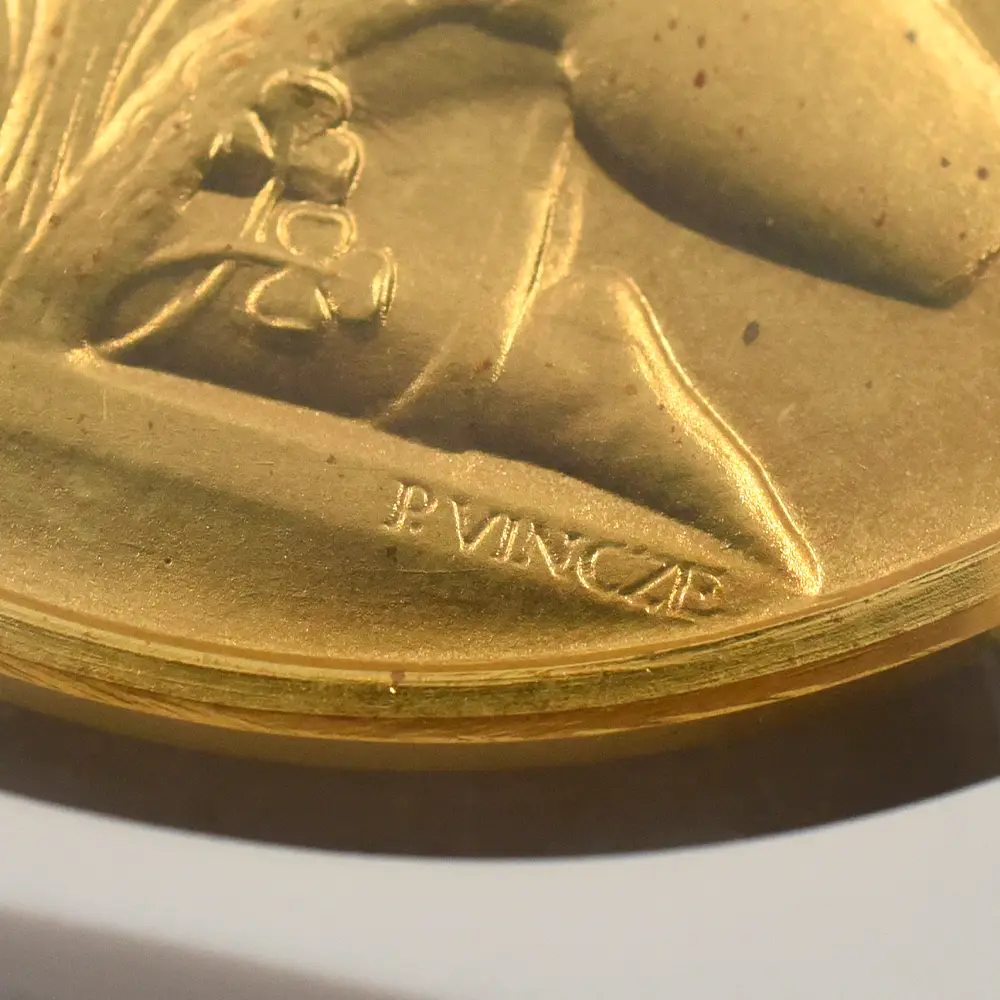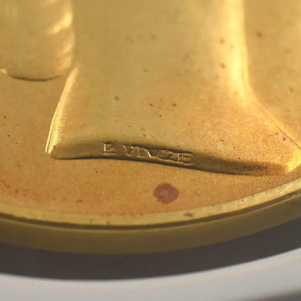 1952年に英国が迎えた待望の新女王即位の重要性は、翌年の戴冠式によって一層強調され、ロイヤルミントによって発行された数々の記念メダルによって恒久化されたと言っても過言ではありません。金、銀、銅の3種のマテリアルを用いて制作された当メダルセットは、戴冠式の偉容を如実に伝えると共に、エリザベス2世の神格化された美しさと威厳を同時に誇示する役割を果たしています。その優れた表裏のデザインの創造主は、20世紀の英国を代表するコインとメダルのデザイナーの一人、ポール・ヴィンツェ(1907-1984)です。ハンガリーのブダペスト出身のヴィンツェは、大戦前にナチス・ドイツの迫害を逃れて渡英し、戦後同地に帰化した異色の才人です。多くの貨幣学研究者から絶賛されているその作風と完成度の高さは、エリザベス2世の戴冠式記念メダルの制作というまたとない機会を得て結実し、才能の限りを尽くしてキャリア上における最高傑作を世に送り出しました。