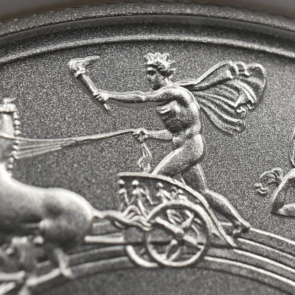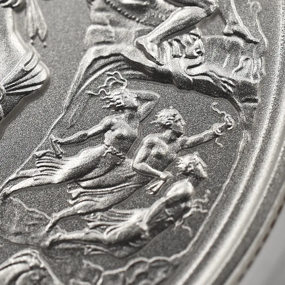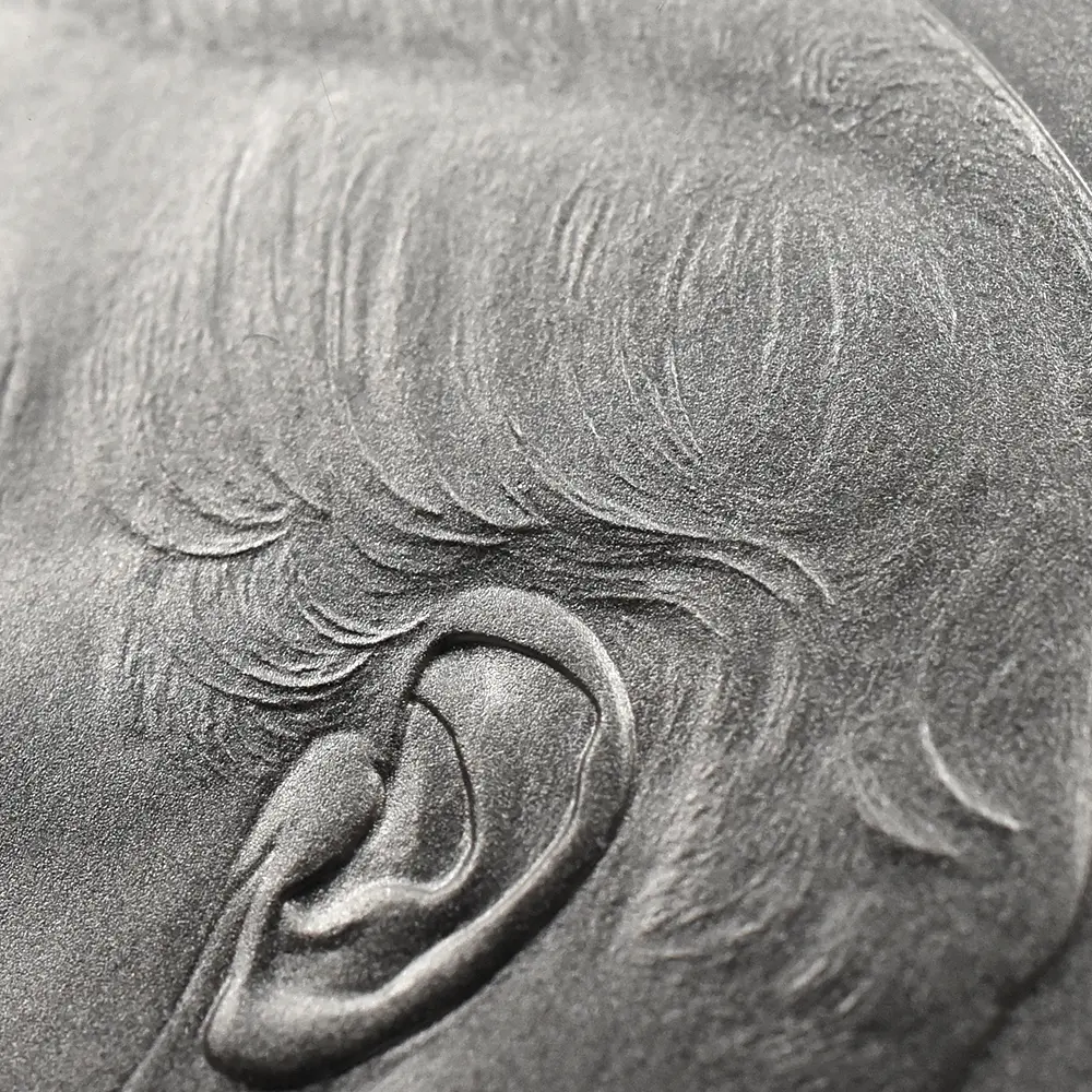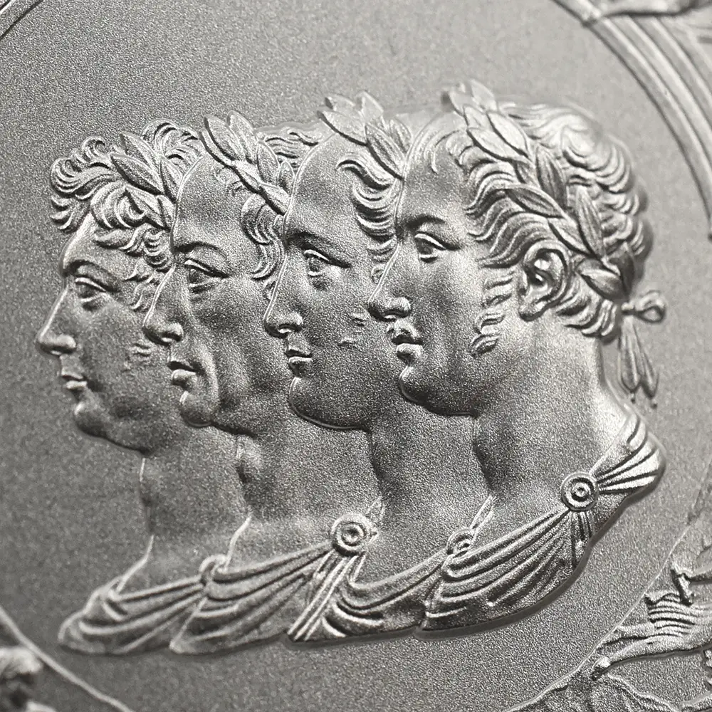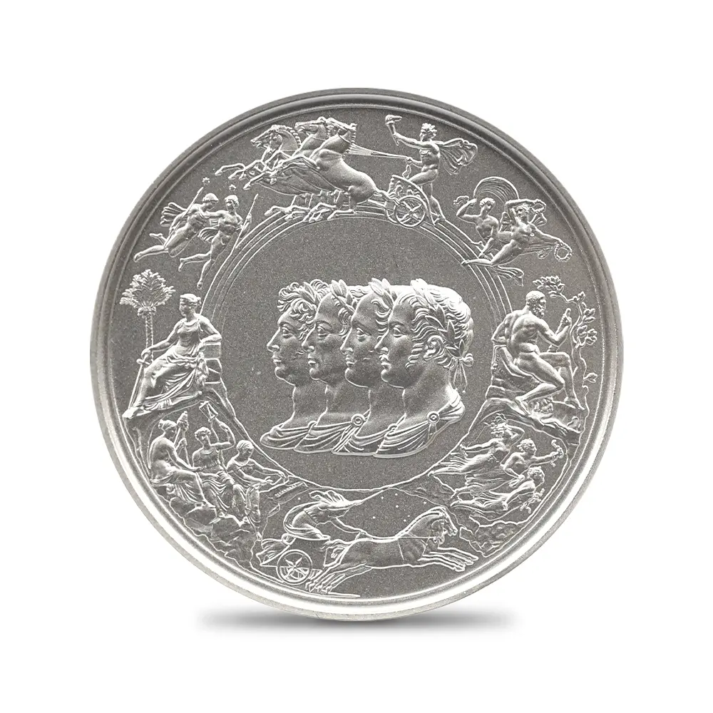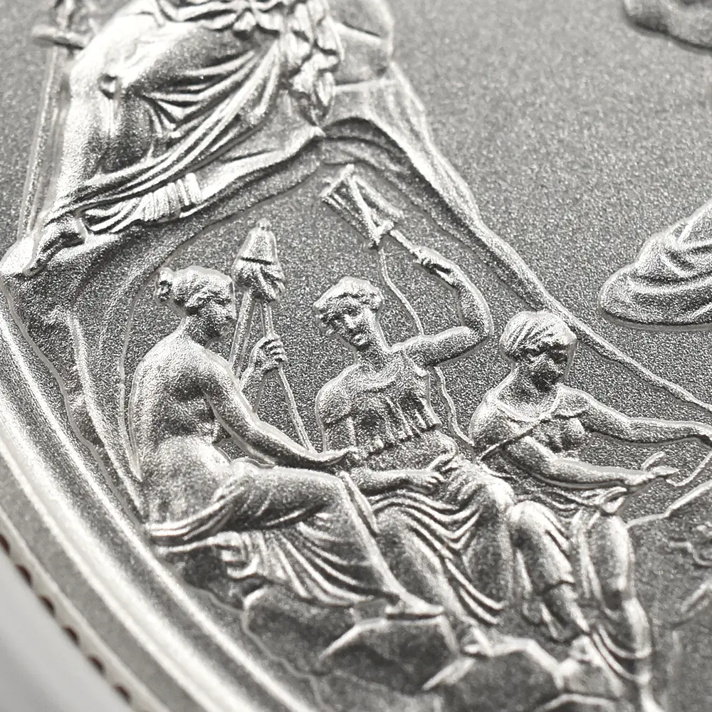 ©The Royal Mint コイン彫刻家の第一人者として名を馳せたピストゥルッチでしたが、イタリア人芸術家の独壇場でもあるカメオ細工の技法を活かしたメダルの制作は、それにもまして精巧を極めていました。過去の歴史的なコインとメダルの傑作を現代に紹介する重要な使命を掲げるロイヤルミントによる「 偉大なる彫刻家シリーズ」は、貨幣史上に刻まれる傑作を創造したいにしえの名彫刻家たちに捧げられる感動のオマージュです。中でも第1弾「ウナとライオン」は、現時点におけるモダンコインの最高傑作として空前の人気を博しました。今回ご紹介させていただく作品は「偉大なる彫刻家シリーズ」の第6弾に当たる作品で、ピストゥルッチが制作したメダルの最高峰「ワーテルロー・メダル」が取り挙げられます。世界史上での歴史的な快挙とされるワーテルローの戦いでの英国軍の勝利ですが、ナポレオン率いるフランス軍の敗退によって再びヨーロッパ全体に平和がもたらされました。オリジナルメダルの表面のみを裏面として復刻するこのリマスター版ですが、現代作品ならではの造形美を金属の輝きが際立たせています。