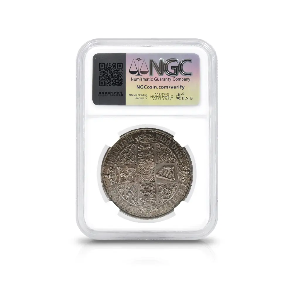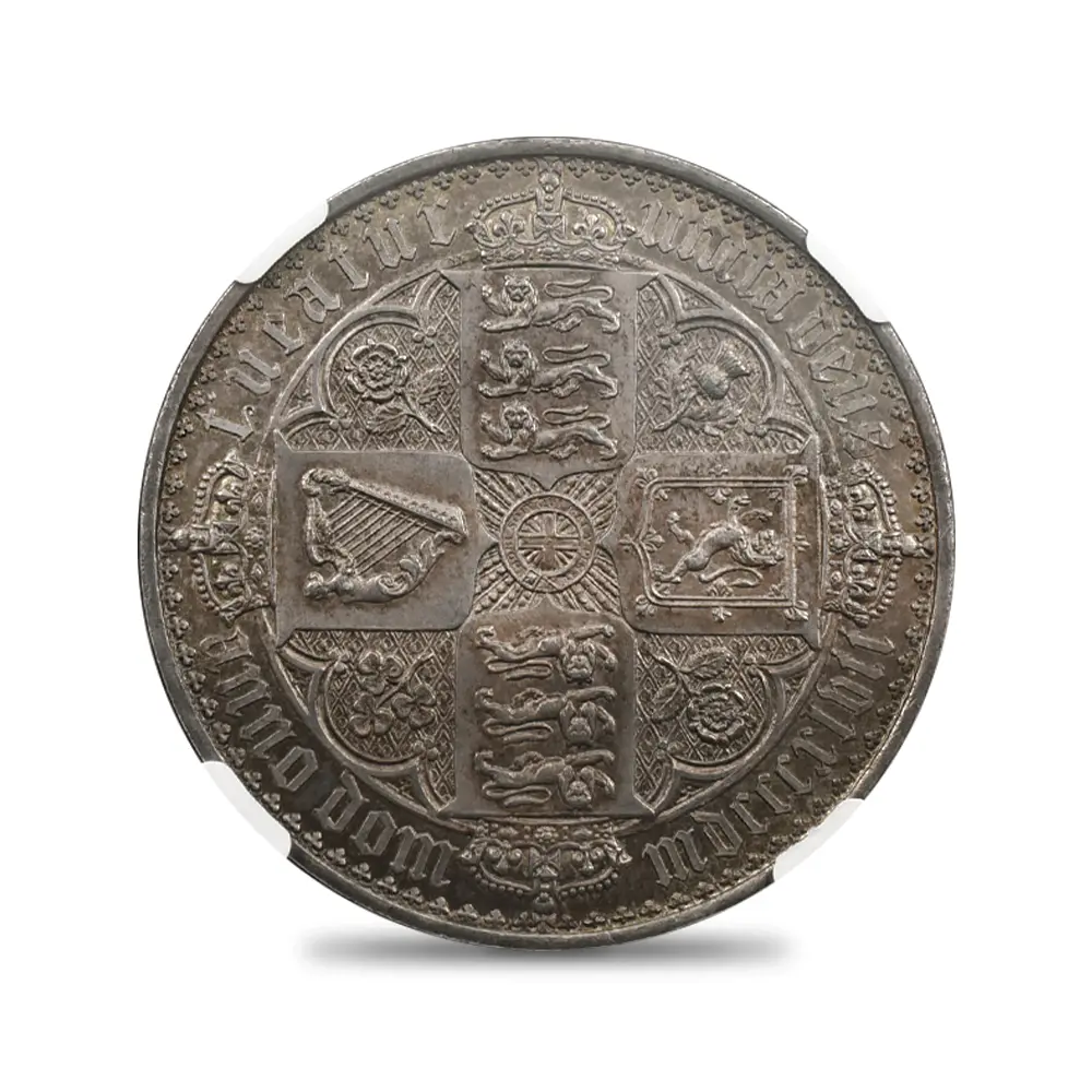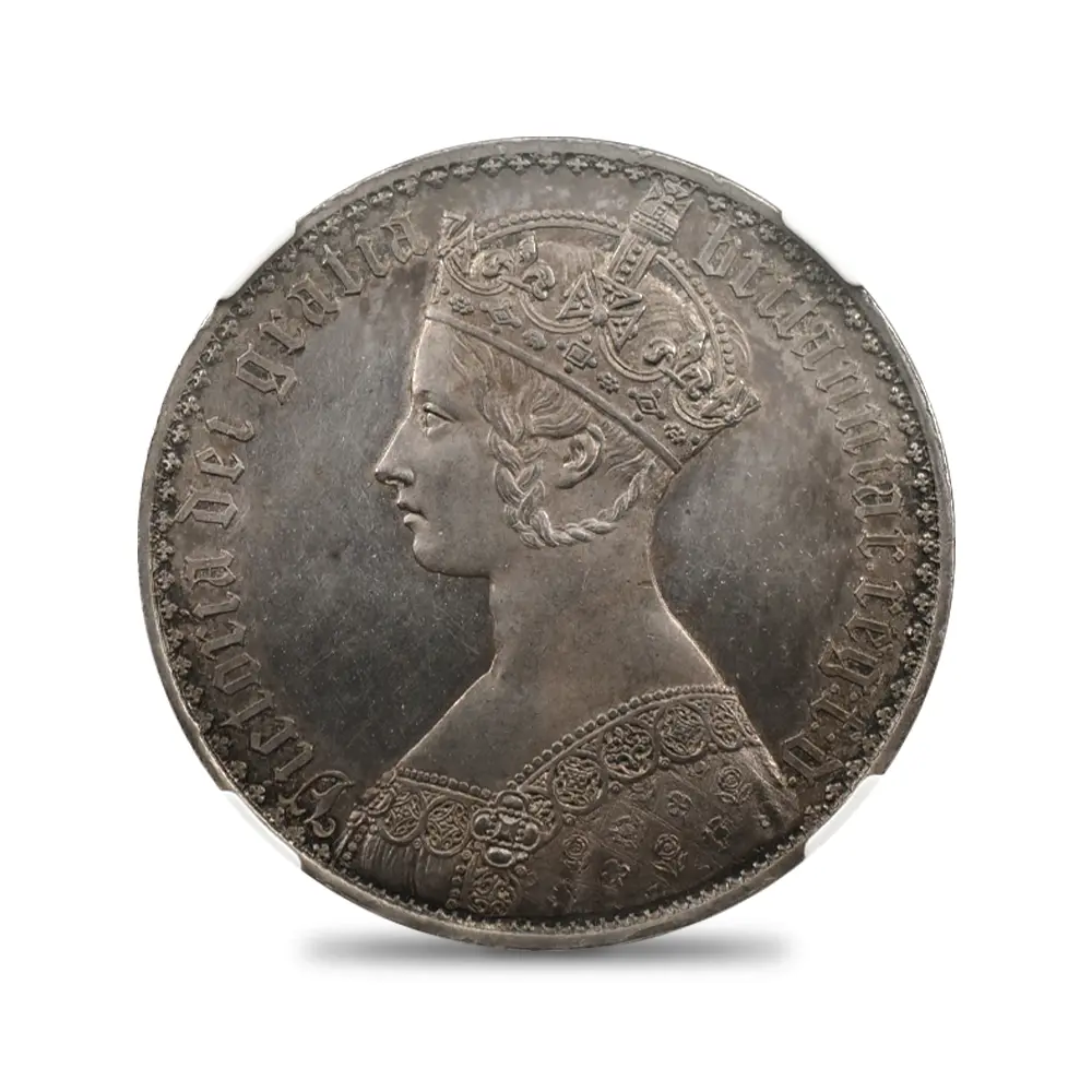 ヴィクトリア女王の即位10周年を記念して発行されたのが、この史上最も有名な銀貨である「ゴチッククラウン」の愛称で知られている5シリング銀貨です。発行初年度には8,000枚がリリースされますが、その人気の高さゆえに1853年には更に460枚が追加で鋳造されたことが記録に残っています。その人気の秘密はコイン表裏のデザインにあり、英国貨幣史上最高の彫刻師、ウィリアム・ワイオン晩年の最高傑作とされています。コイン表面に描かれているのは若き日のヴィクトリア女王の侵し難い気品を湛えたポートレートですが、頭上に輝く英国君主の象徴である聖エドワード王冠を始め、女王が身に纏う衣装と装飾品には、中世ヨーロッパに起源を持つ歴史的なゴチック様式の影響が見られ、碑文のゴチック体「ブラックレター」の採用と共に、作者ワイオンの意図する女王の品格の表出に貢献しています。裏面のバランスの良いデザインも圧巻で、表面と同様、ゴシック様式による英連合王国各国の国章が厳かに描かれています。ルーブル美術館所蔵の世紀の大作であるルネッサンスの才人レオナルド・ダ・ヴィンチの肖像画「モナ・リザ」は、その優れた人物描写によって世界史にその存在を刻み、絵画史上における一大傑作として地上に君臨していますが、この「ゴチッククラウン」は英国貨幣史上最高のコイン肖像画として、常に最高度の注目を集めて来ました。この1847年初発行バージョンと、それに続く1853年バージョンにおいて、コインのエッジ部分に碑文の無いプレーンエッジ・タイプが主流ですが、女王の即位10周年を意味する「Undecimo」の碑文を持つものも見受けられ、格別の人気を誇っています。なぜ10周年の記念に11番目を意味するUndecimoの語が用いられているかについては諸説ありですが、即位の初年を計上すると、1847年は11年目に当たるためにこの語が採用されたというのが正解の様です。英国貨幣界の「モナ・リザ」である「ゴチッククラウン」こそ、英国銀貨の最高峰として今後もヴィクトリア朝の栄華を物語り、英国アンティーク・コインを鑑賞する喜びを我々に与え続けてくれることでしょう。