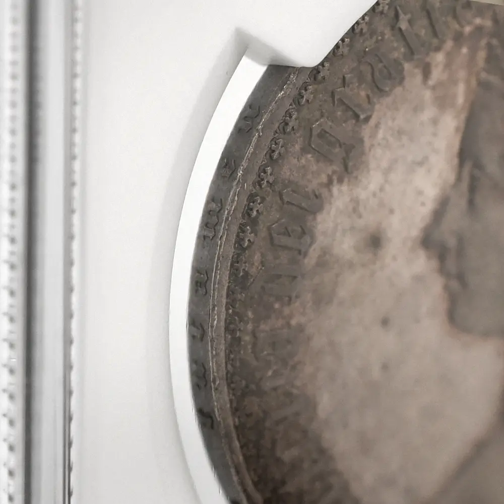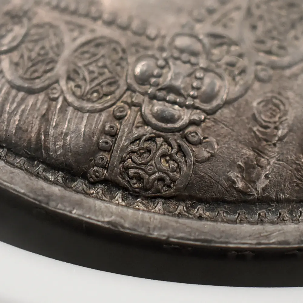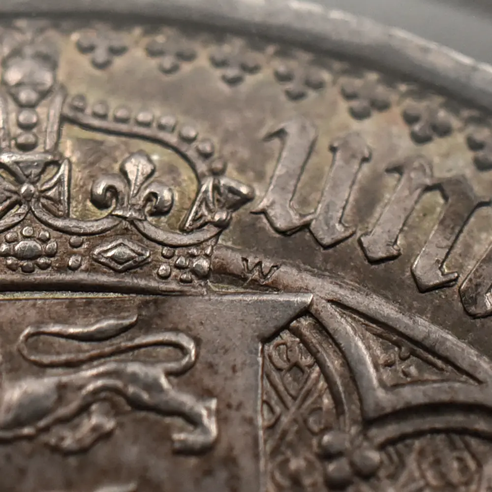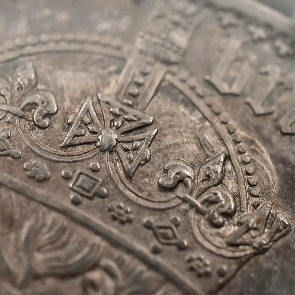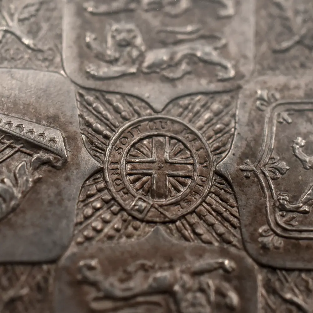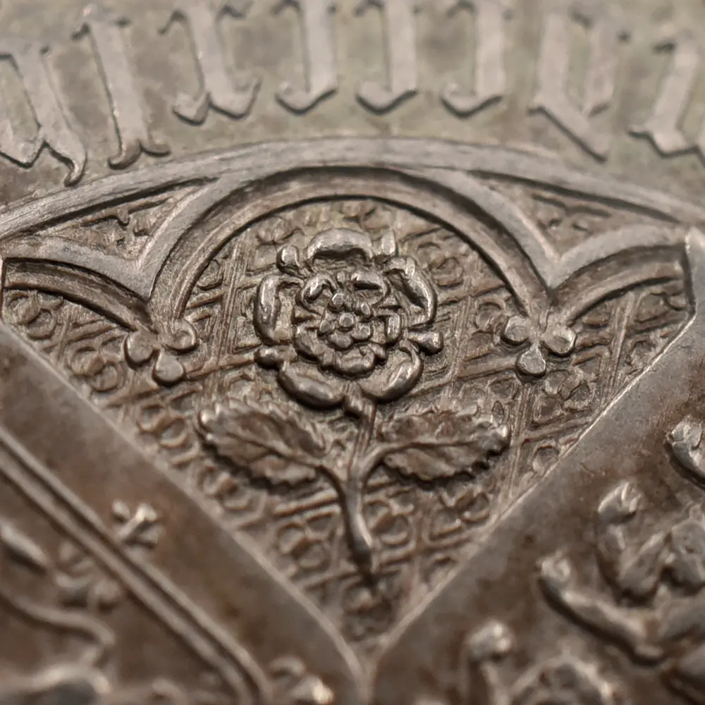 1837年のヴィクトリア女王の即位によって新時代を迎えた英国は、世界最大の覇権国家としての空前の大繁栄を前に国家としての地盤を固めつつありました。「女王の時代に国家は繁栄する」と言われて久しい英国ですが、18世紀のアン女王の崩御によるステュアート朝の断絶以来、123年振りの女王の誕生は、その後の大英帝国の隆盛期を予期させるに十分な威厳を英国にもたらしました。63年7か月に及んだ女王の治世はヴィクトリア朝と称され、英国史のクライマックスとして、また女王が統治した稀有の一時代として歴史上に深く刻まれています。夫アルバート公爵との出会いはヴィクトリア女王の人生を大きく変えました。信頼できる配偶者のサポートは女王の治世にとって不可欠で、懐妊中の女王に代わって公爵が執政を行うことも多かったようです。それゆえに公爵の急逝は女王の人生に影を落とし、公爵亡き後の女王は一定の服喪期間を超えて一生涯をそれに捧げたと言われている程です。しかし不幸の後には空前の繁栄が待ち構えていました。1887年に女王が在位50周年を迎えたころの英国は正に大英帝国の理想を成就させ、全世界に広がる一大帝国を築き上げ、英国は女王の崩御の瞬間までその圧倒的威光の下に独立独歩の道を悠然と突き進みます。この「ゴチッククラウン」銀貨は、若き日のヴィクトリア女王の年齢に似合わぬ泰然自若たる風貌を描くと共に、その後の帝国の命運を暗示する記念碑的文化遺産です。