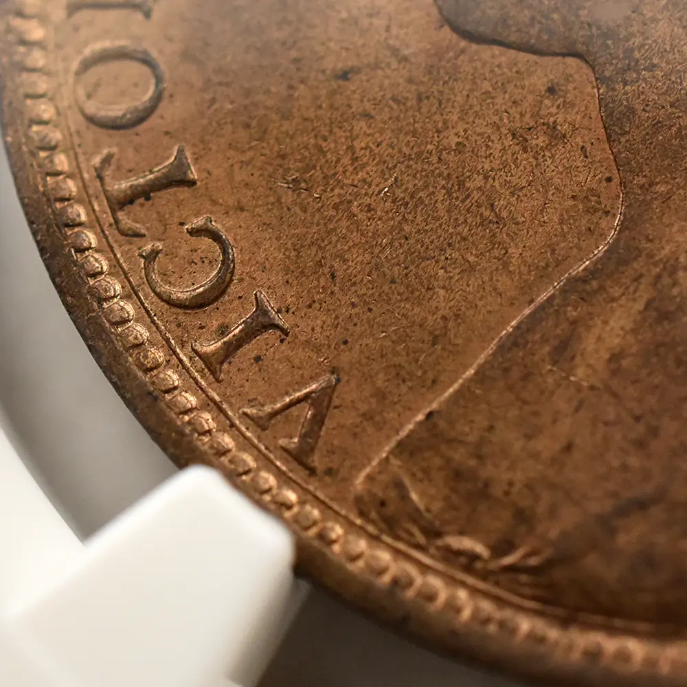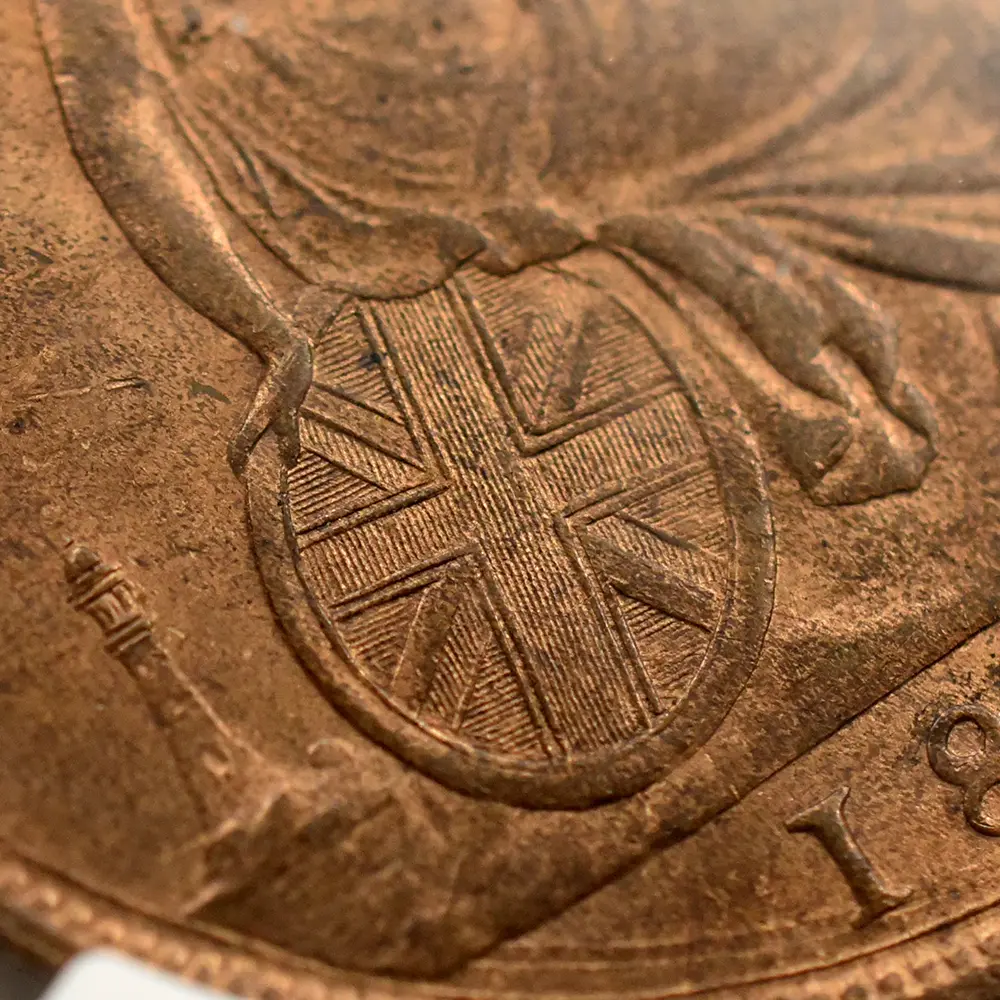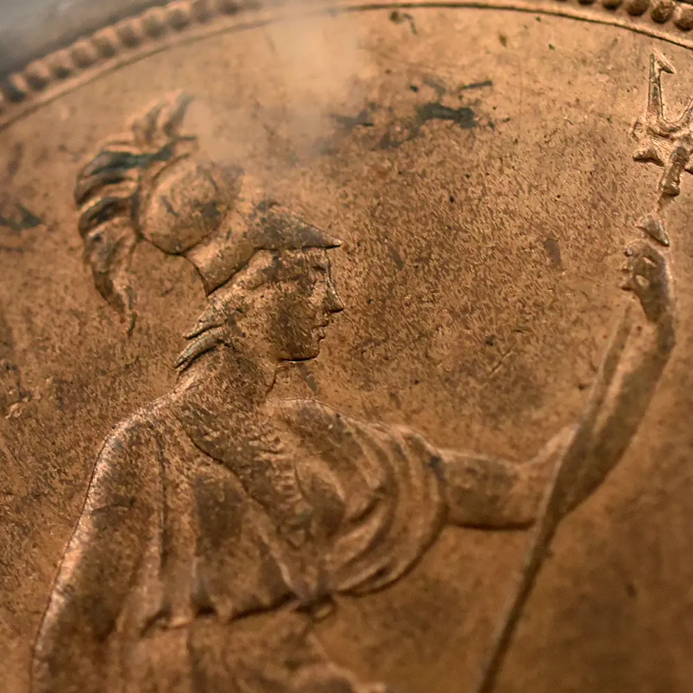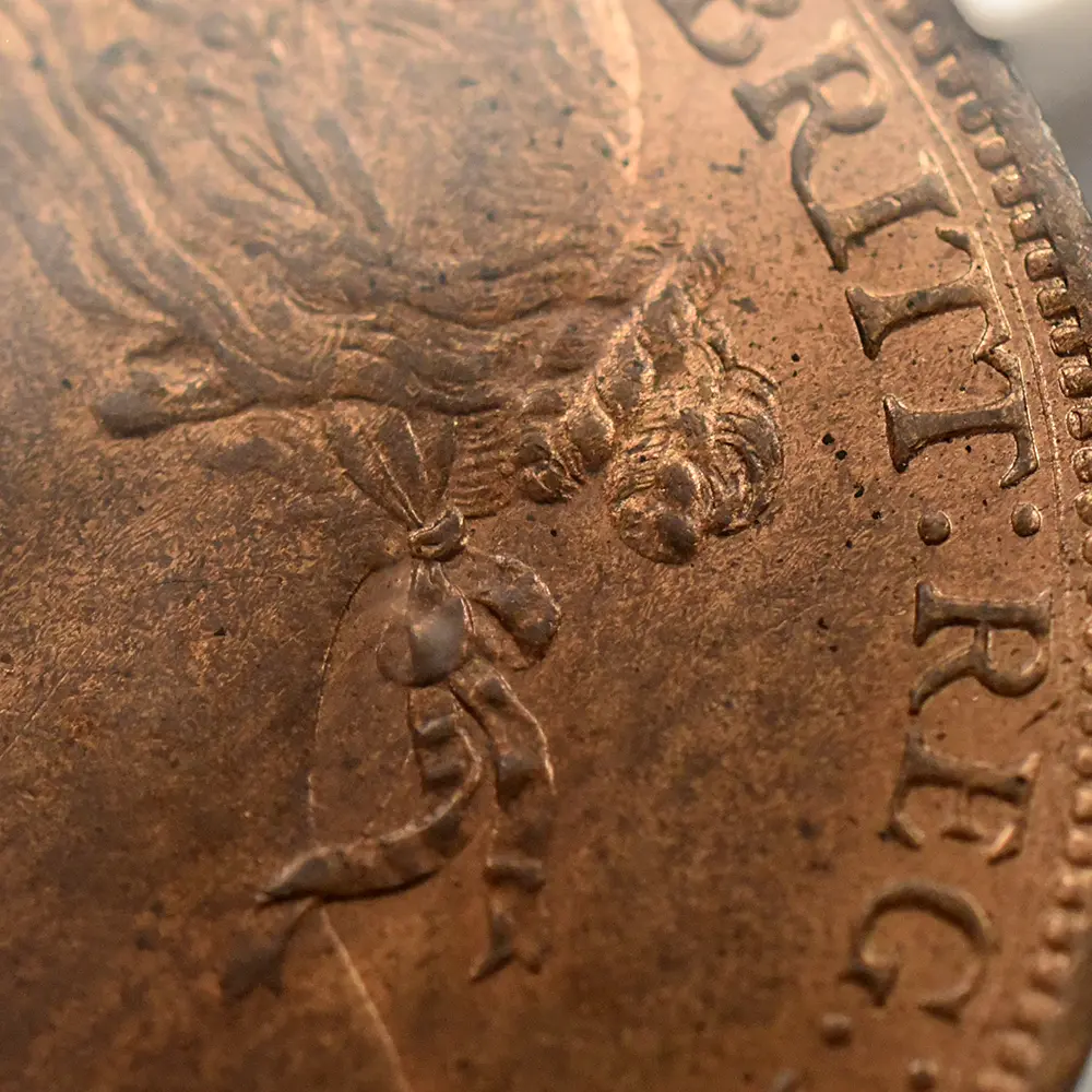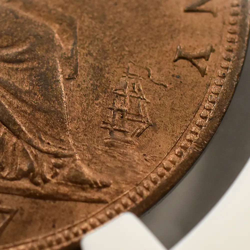 1837年の即位以降、当時世界最大の国家として成長を遂げた大英帝国を支え続けたヴィクトリア女王(1819-1901)。その治世はヴィクトリア朝と呼ばれ、イギリスのみならず世界史上における稀有な時代として記憶されています。アルフレッド大王在世時の886年に創業し、その後1000年以上にわたってイギリスコインの精髄を世に送り続けてきたロイヤルミントこと英国王立造幣局もまた、この時代に最盛期を迎えていました。英国貨幣界における二大巨匠と謳われるベネデット・ピストゥルッチ(1783=1855)とウィリアム・ワイオン(1795-1851)は、貨幣芸術の頂点に相応しい数多くの傑作を創造し、自身の名を歴史上に深く刻みます。それぞれの芸術家が自身の才能に忠実であり、またそれを証明するに値する代表作を次々と発表しました。それらの中でもワイオンの「ウナとライオン」は、現在も英国貨幣を象徴する名作として受け止められている感がありますが、その美しさは永遠の謎でもあります。およそ400枚が発行されたに過ぎないこの世紀の秘宝は、それまでの英国貨幣には見られなかった工夫が多く見られます。16世紀末から17世紀にかけてのイギリス文学史を代表する作家エドマンド・スペンサーの代表作「妖精の女王」からインスピレーションを得たワイオンは、そのストーリーを当時大流行していた新古典様式と融合させ独自のデザインを創造するに至ります。ウナをヴィクトリア女王に、そしてウナの傍らに佇むライオンを女王の臣下である大英帝国の国民に譬えたその演出効果は絶賛を博しました。ワイオンのもう一つの傑作として「ゴチッククラウン」を挙げられる方は多いことでしょう。ウナで用いられた柔らかな新古典様式とは対照的に厳格なゴチック様式を採用しコイン両面のデザインに活かしたこの作品は、即位から10年の時を経て貫録を身に着けたヴィクトリア女王の姿をコイン表面に映し出すものです。肖像周囲と裏面にはその威厳を象徴する格調高いデザインが施されていますが、何よりも英国らしさが随所から漂ってくる正真正銘の芸術品です。ちなみに、女王とワイオンの個人的な親交は深いもので、女王をして「ワイオン氏ほどに私を私が描いて欲しいように描く人物は他に見当たりません」と言わしめたほどの寵愛をこの芸術家が受けていたことは半ば伝説化しています。制作当時28歳に到達していたヴィクトリア女王の貫録が前面に押し出されたいわゆる「ゴチッククラウン・ポートレート」は、何度見ても飽きのこない秀作であり、英国貨幣界随一の名ポートレートの誉れの高い作品として有名です。今回ご紹介させていただくペニー銅貨上にもヴィクトリア女王の肖像が描かれていますが、それらと比較すると一見地味だと感じられる方も結構多くいらっしゃるかもしれません。しかし、今日余り目にすることのない若々しい女王の横顔からは大英帝国の重みが伝わってくるほどです。当作品の見どころはポートレートの頭上を飾る重厚なリースで、瑞々しい女王の顔をくっきりと引き立てています。また当ペニー銅貨のもう一つの眼目として、裏面に描かれたブリタニアの座像が挙げられます。トレードマークの槍とユニオンジャックの盾で武装したブリタニアの姿は、一見するといかめしいものかもしれませんが、当貨に描かれているブリタニアはむしろ女性ならではの優美を感じさせるものです。アンティークコインならではの古色を纏うこの魅力的なペニー貨は、2017年に亡くなった20世紀後半から21世紀前半を代表するアメリカ出身のコイン収集家、エリック・P・ニューマンが一代で築き上げたコインコレクションに属していたものとして特筆すべきです。その膨大なコレクションは、世界100か国以上の国々が発行したコインを網羅しており、世界最大の鑑定会社NGC社がコレクションのうち約7500枚を鑑定しました。コレクションは所有者の没後2018年にオークションにかけられ、174万ドルという記録的な最終落札額を算出したことでも知られています。空前絶後のコレクションにかつて属していた当ペニー銅貨は、英国貨幣の過去の栄光と未来への希望を掲げる実物資産として今日、コインコレクターに託されることとなりました。
