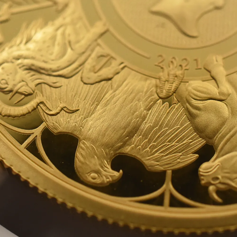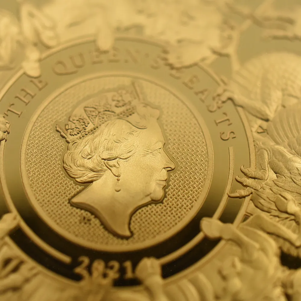 今や伝説であると言っても過言では無いウェストミンスター寺院を会場とした1953年のエリザベス2世の戴冠式ですが、当日、寺院のエントランスの両側に歴代英国君主を代々守護すると伝えられる全10種の守護獣の彫像が建立されていたことを記憶している人は今日、意外と少ないかもしれません。架空と実在から成るこれらの動物たちは中世以降の各王朝時代を象徴するシンボルとして誕生し、王の居住空間を彩る図案に姿を変え、主に紋章や装飾用として用いられていました。その中でも特に有名なものとしては「イングランドのライオン」が挙げられますが、これは頭上に王冠を戴く格調の高い守護獣であり、その誕生以来、全英国史を通じて歴代国王の愛顧を受け今日に至ります。それぞれの動物がある一つの王朝の特定の国王と結びついていることを最大の特徴とすることから、いかに長い年月にわたってこれらが英国王室によって重用されてきたかを伺い知ることができます。今回ご紹介させていただく作品は、近年最大の成功を収めたこれら10種の守護獣を個々に描く英国モダンコイン・シリーズの大作「クイーンズビースト・コレクション」の最終章として発表された「コンプリ―ター=完全版」のタイトルで知られる名品です。全10種がリリースされた後の発表となったこのコイン上には守護獣全10種網羅されていることから、2021年度の英国モダンコイン界最大の話題となったことは記憶に新しく残っています。同シリーズの個々のコインのデザインによって完全にコインファンの心を掴んだ英国ロイヤルミントの若き俊英にして名デザイナー、ジョディ―・クラークに再び白羽の矢が立つことになりましたが、この完全版において彼は実に斬新なテクニックを披露するに至りました。中央にはエリザベス2世の肖像を据え、その周囲を10大守護獣が取り囲むというかつて無いほどに鮮烈なアプローチは、歴史と伝統を誇る英国貨幣界の新たな伝説となりました。1953年の戴冠式に際してエリザベス2世が相続することになったこれら10種の守護獣は、英国史上初の試みとなる当コインの発行によって一つの作品として完結し、恒久化される運びとなりました。1000年以上もの長大なる歴史を誇る英国王室を象徴する当コインは、同じ歳月をコインの鋳造に捧げて来たロイヤルミントの栄光の歴史を称える記念品でもあります。ここに現代英国貨幣界屈指の極品が遂に日の目を見ることとなりました。