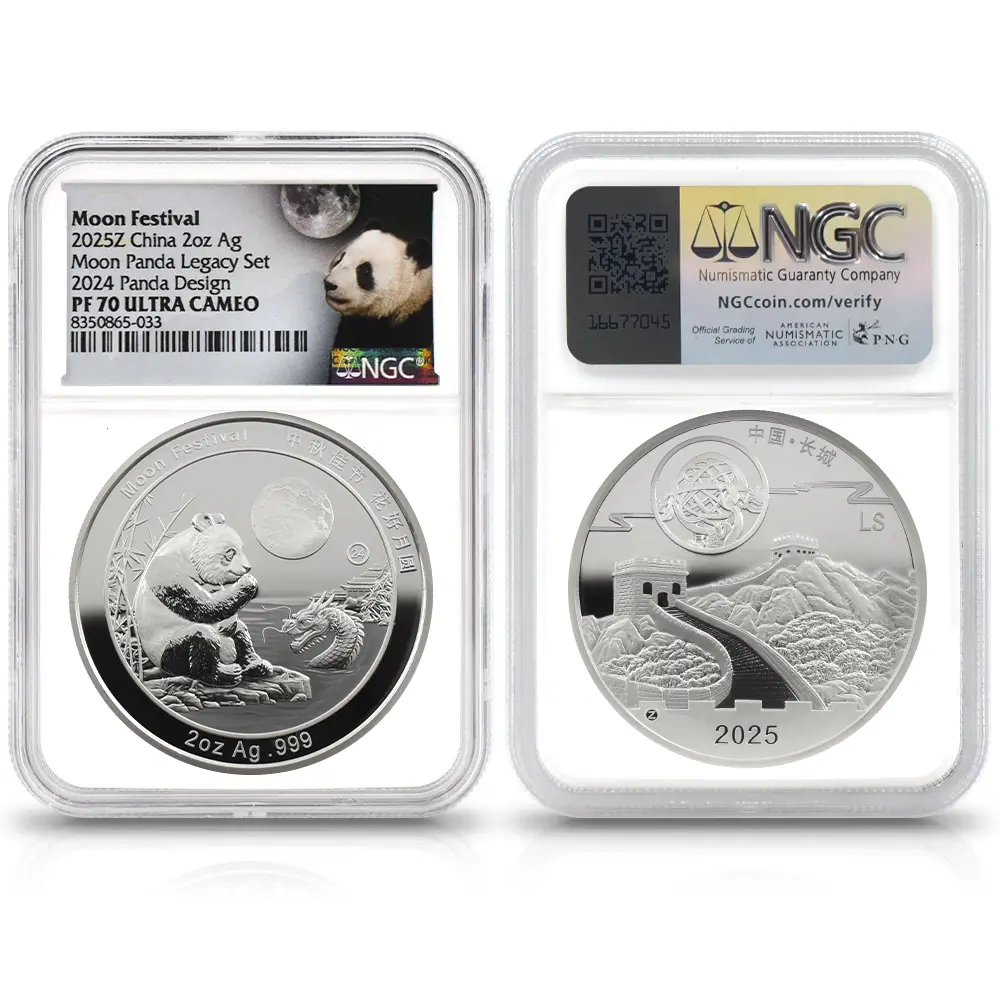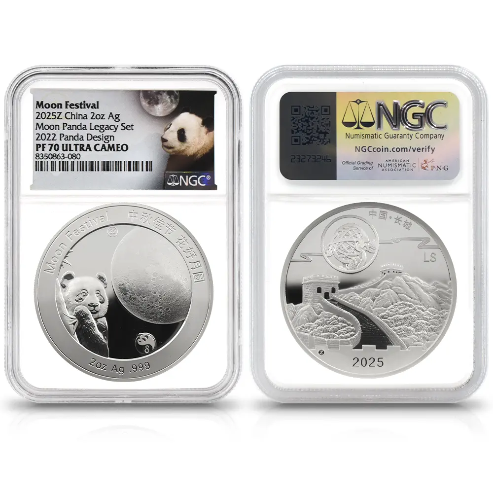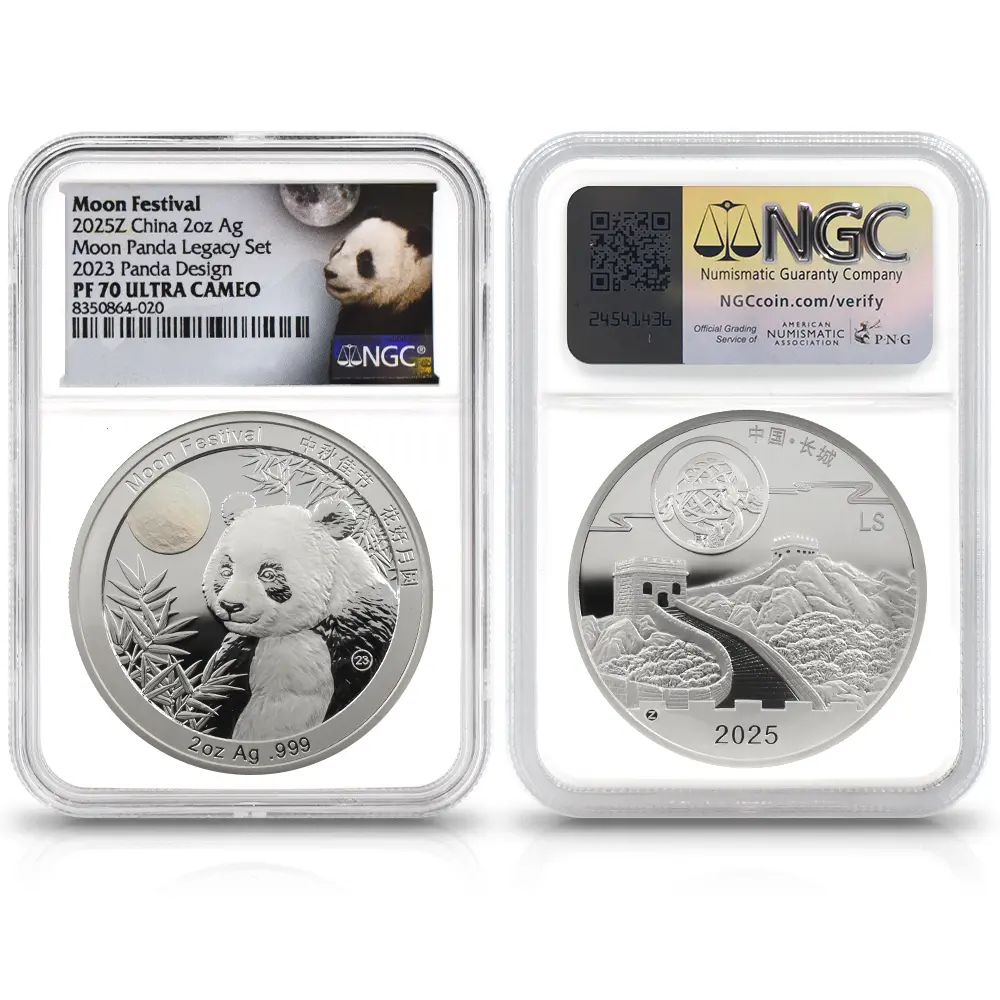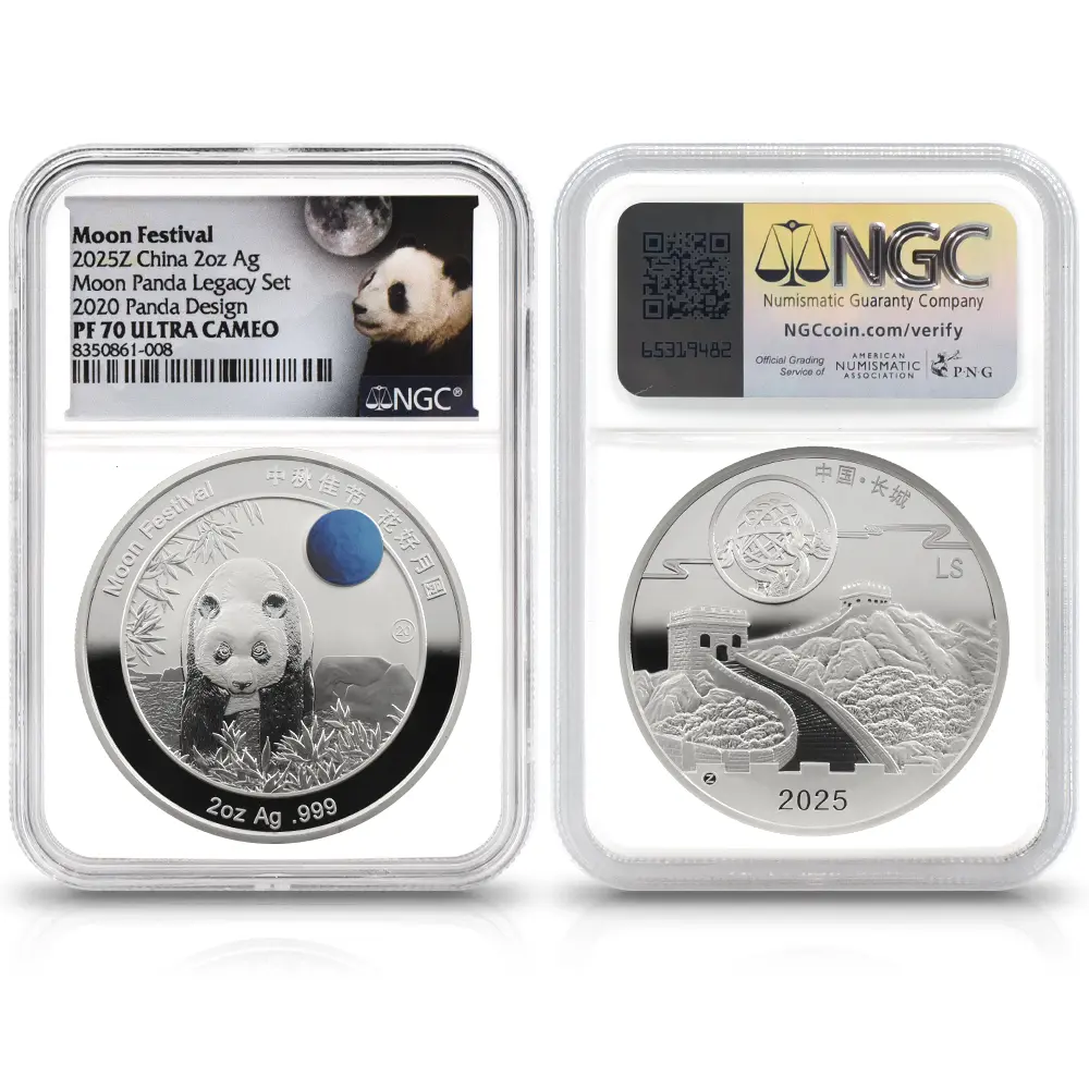 中国 2025発行 2015-2019デザイン パンダ 中秋節 2オンス銀メダル 5枚セット NGC PF70UC 箱付き