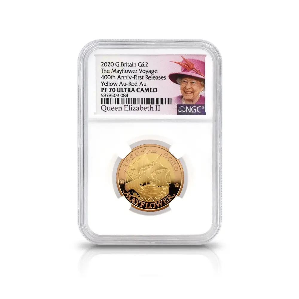 2020 エリザベス2世 メイフラワー号出航400周年 2ポンド2色金貨 ファーストリリース NGC PF70UC 箱付き