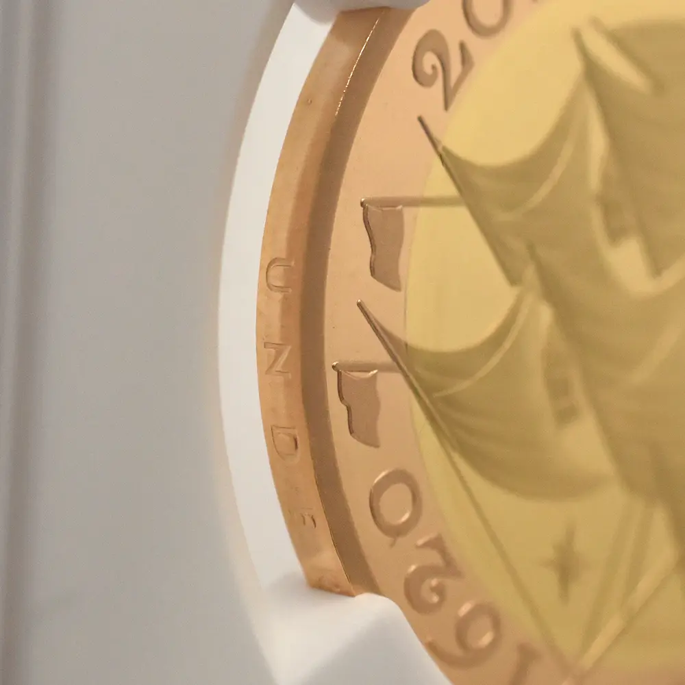 それぞれのコインの発行枚数は銀貨が4,000枚、ピエフォーが2,000枚、そして金貨が400枚と大幅に制限されており稀少価値を高めています。「神の栄光のために企てられた」の碑文がそれぞれのコインの側面に刻印されていますが、この文言はメイフラワー号の乗船客41人によって草稿された有名な「メイフラワー誓約」から引用された清教徒達の信念を今の世伝える輝きに満ちた力強い一文です。同誓約はその後時を経てアメリカ合衆国の連邦制の根本理念として認識され採用されるに至った経緯があります。類まれなる美しさを称えたこれらの名作コインは、遥か昔の大航海時代の夢と希望を現代に伝える貴重な存在として、今後幾世紀にも渡って語り継がれていくべき普遍的価値を有しているように思えてなりません。