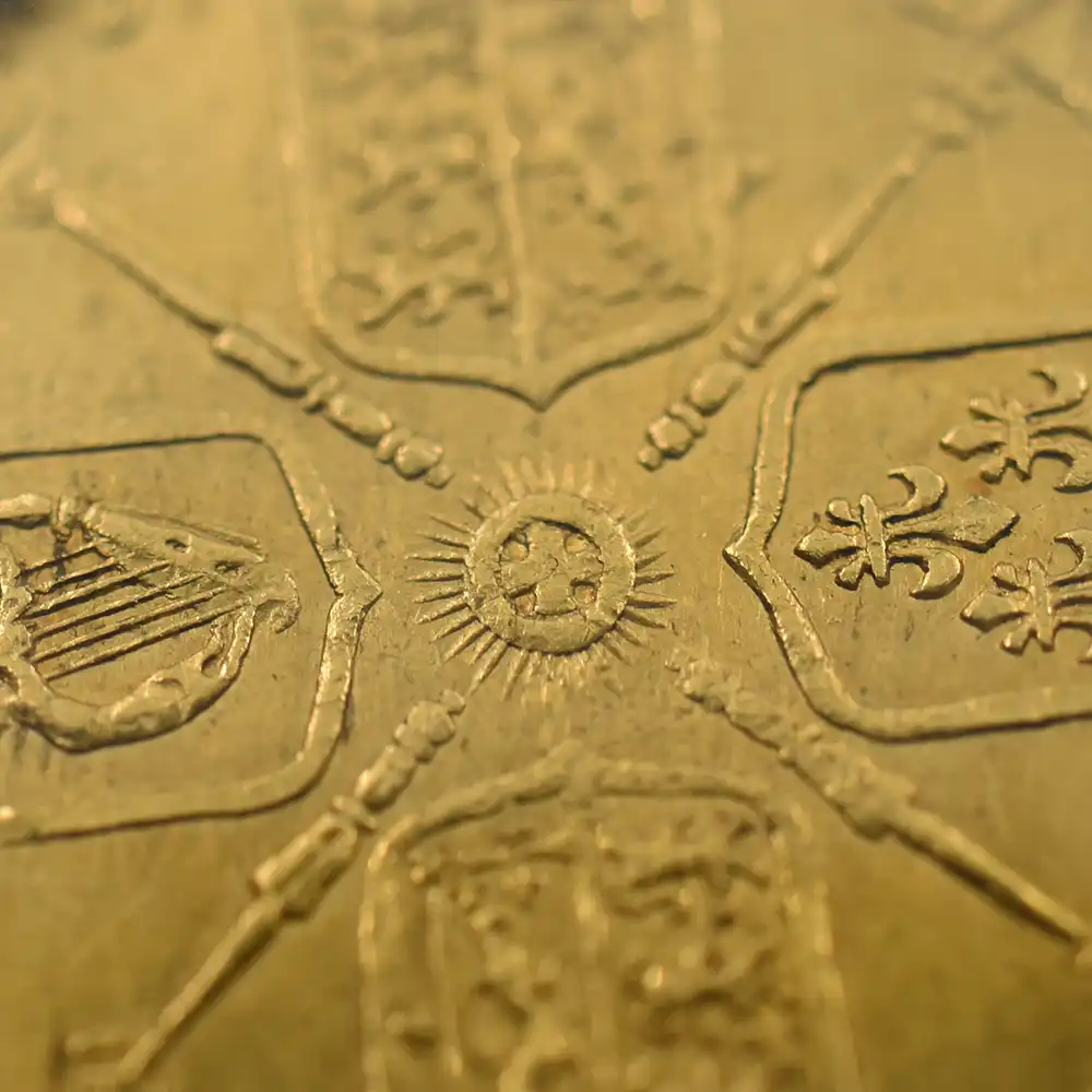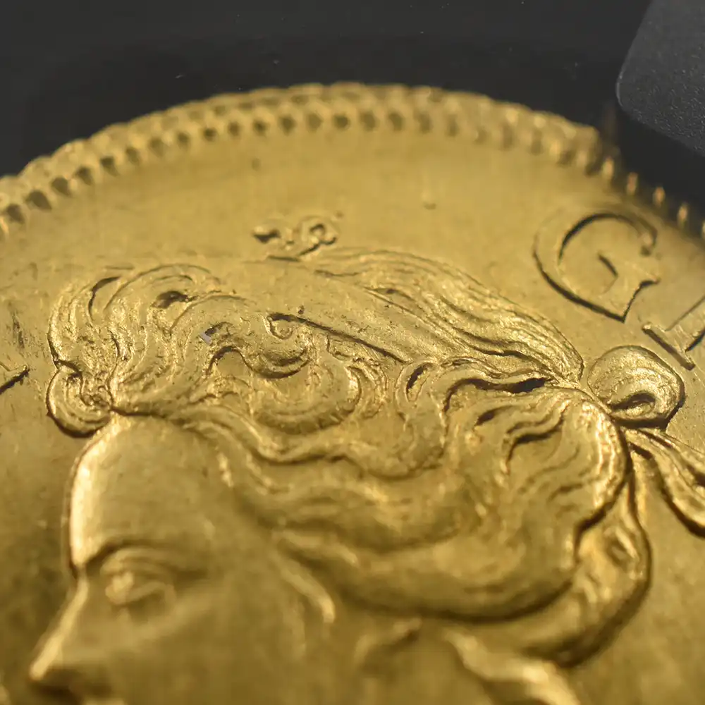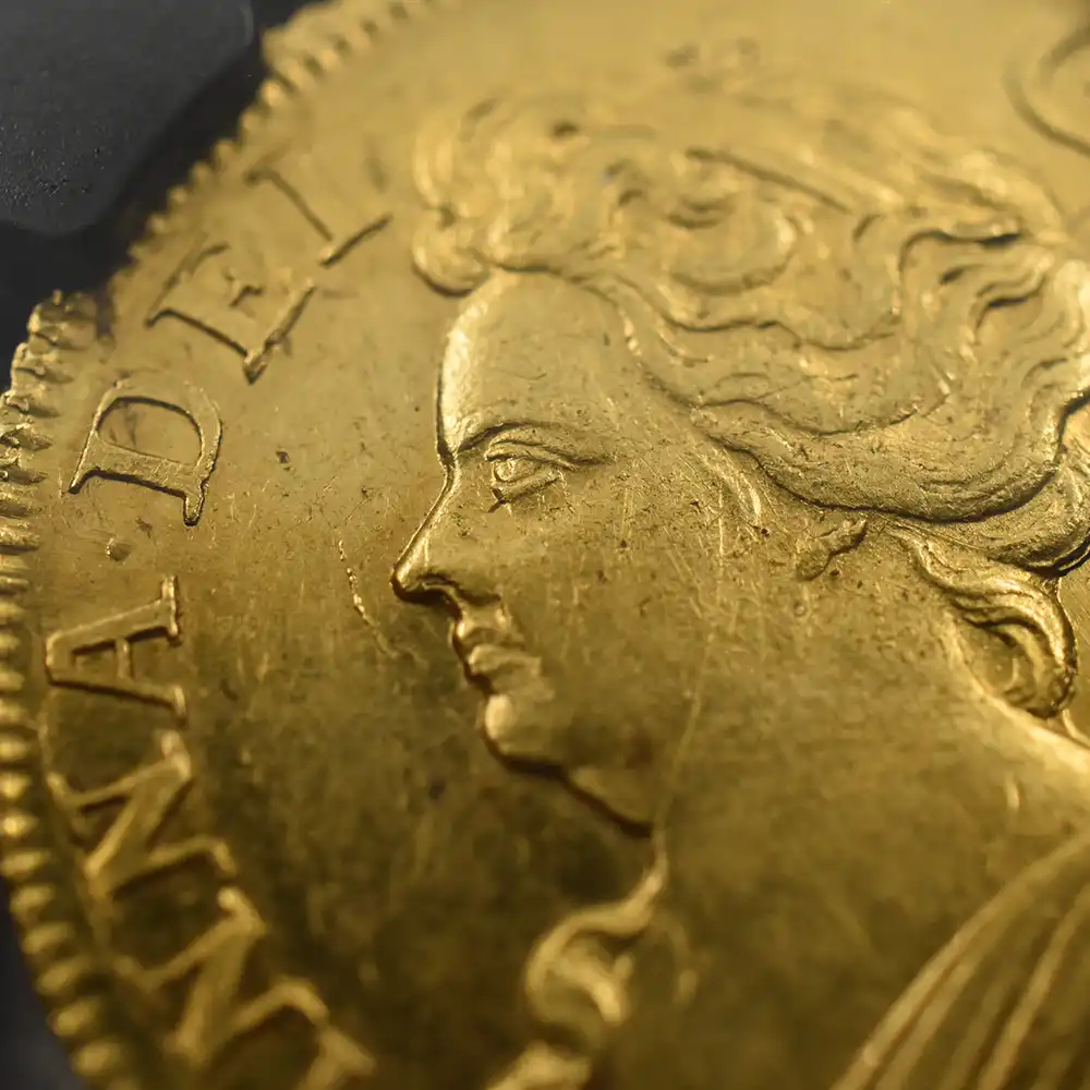 今回ご紹介させていただく作品は、イングランドの名を一躍高めることに貢献した偉大なる君主アン女王の治世を象徴する金貨です。その12年間の治世下において英国貨幣史上に特筆されるべき数多くの名品を生み出したロイヤルミントですが、それらのコイン女王がグレートブリテン連合王国を成立させた1707年以前(プレユニオン=統合前)と以降(ポストユニオン=統合後)に大別することが可能です。当コインはポストユニオン時代に属する名品で、イングランドにとっての激動の時代の生々しい空気を、300年以上もの時を超えて我々の時代に伝える正真正銘のアンティークコインの逸品に他なりません。表面に描かれているアン女王の有名な肖像は、1100年以上もの歴史を誇るロイヤルミントが過去に創造したコイン・ポートレートの傑作の一つであり、他の歴代英国王のそれと比較しても全く遜色の見られない秀逸な出来栄えを誇ります。上部に無造作に束ねられた緩やかなウェーブを見せる豊かな頭髪はこの肖像のトレードマークであり、女王の治世下に発行された全コインの品質と芸術性を完全に証明するものでもあります。豊満な胸部とそれに続く衣装のドレープは見事なまでの統一感を表出しており、見るものをいにしえのステュアート朝の女王の宮廷へと誘うかのようです。ポートレートの周囲には「神の恩寵によるアン」という意味の厳粛なラテン語碑文が刻まれ、生前の女王の王位の正統性を余すところなく誇示しています。表面のこの堂々たる肖像と対を成すように、裏面にはアン女王が成し遂げた一世一代の偉業であったグレートブリテン連合王国の成立を具象化する絢爛豪華たる意匠が繰り広げられており、女王の権威に華を添えています。イングランド、スコットランド、アイルランド3国の国章を盾の紋章として刻む格調高き意匠には、英国王位の優位を象徴する王冠と王笏がバランスよく配置され、中央には英国最高の栄典であるガーター勲章の徽章から採用されたと思しき十字型の紋章が見られます。その周囲には発行年を表す西暦と共に、「グレートブリテンとアイルランドの女王」という意味のラテン語碑文が厳かに刻まれ、女王の大成した空前の偉業に無限の祝意を捧げています。300年の時を経ていにしえの黄金の輝きと共に我々の時代に継承されたこの奇跡的名貨は、本来博物館に所蔵されていてもおかしくないものです。輝けるアン女王の時代を彷彿させるこの究極のアンティークコインとの運命的な出会いを無心に喜ばずにはいられません。