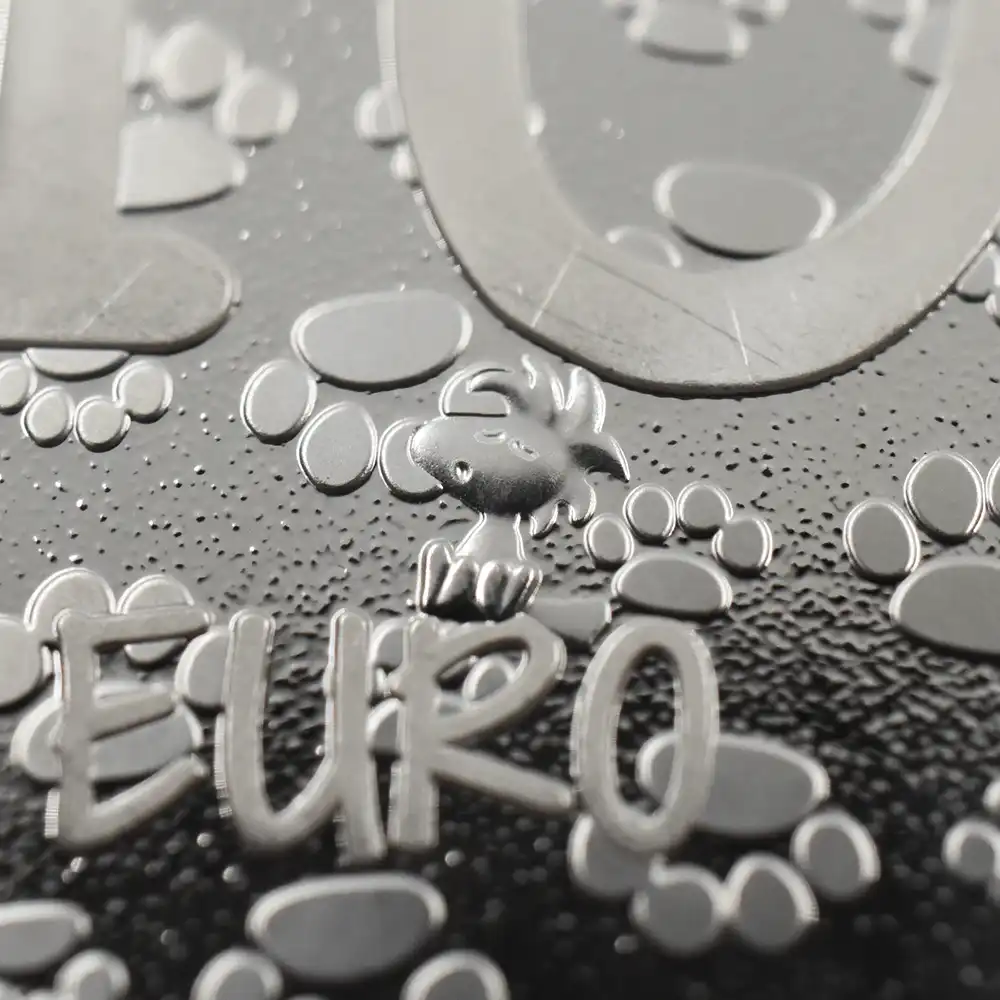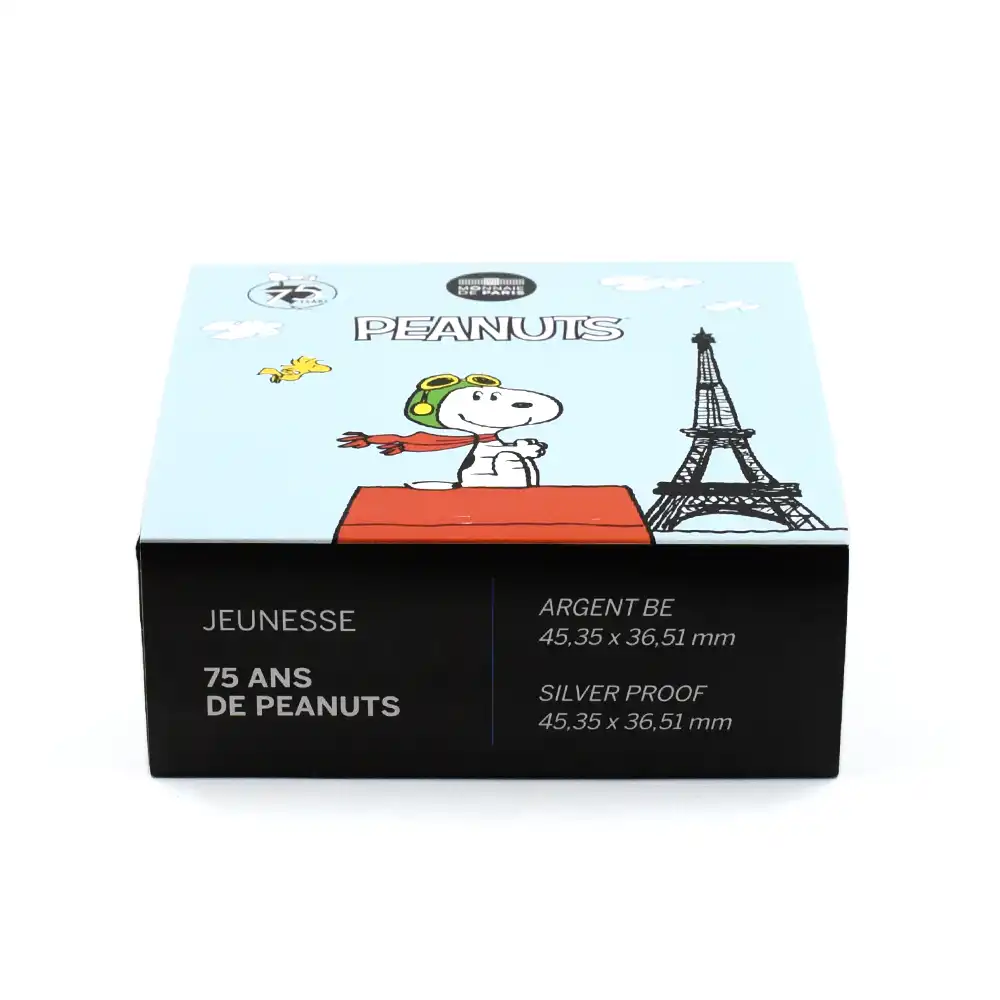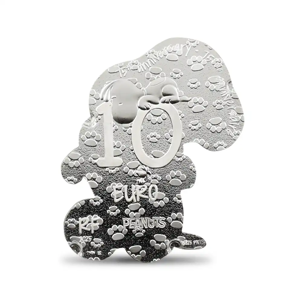 アメリカ合衆国出身の漫画家チャールズ・モンロー・シュルツが1950年に発表したスヌーピーは、漫画としてのみならず今や児童文学の傑作として、老若男女を問わず世界中のファンを魅了し続けています。シュルツが書いた漫画「ピーナッツ」に主人公のチャーリー・ブラウン少年のペットとして登場するスヌーピーですが、もともとは作者が13歳の時に飼っていたビーグル犬の雑種がモデルであったという逸話が残っています。また作中にてスポーツと小説の執筆が趣味という設定となっており、生まれた場所は少年が住む地域から近いデイジーヒル子犬園とのことです。漫画連載の初回においてのスヌーピーの登場は無かったものの、連載開始の2日後の1950年10月4日に初登場となったことが記録されています。今でこそ、あの白黒の可愛らしい姿で人気を博しているスヌーピーですが、初めて登場した時は完全に犬の姿で描写されており、連載が進むにしたがって姿を変え、現在われわれが見る姿へと変わっていきました。世界的に認知されているキャラクターであり、その可愛らしい風貌は日本でも絶大な人気を誇ります。また日本ではオリジナルの漫画「ピーナッツ」よりもスヌーピーの名によってより広く知られている感があり、漫画の代名詞となっているほどです。それ故に漫画の名前自体がスヌーピーだと思われていたり、あるいはスヌーピーが漫画の主人公だと誤解されるケースが多いことも事実です。当然のことながら漫画の主人公はチャーリー・ブラウンです。作中にて登場するスヌーピーはチャーリー・ブラウン少年の飼い犬という設定ですが、飼い主の名前をなかなか覚えようとしなかったり、何度も「丸頭の男の子」と呼んだりするシーンがあります。また少年に飼われ始めた当初は自分のことをチャーリーの主人だと勘違いすることもありました。チャーリーに飼われるようになるまでのスヌーピーはライラという少女に飼われていましたが、彼女の引っ越し先のマンションがペット禁止であったためにデイジーヒル子犬園に連れ戻されることから物語は幕を開けます。ある時チャーリーが近くの公園の砂場で一人で遊んでいるときに、見知らぬ子供からバケツ一杯の砂を頭から変えられるというハプニングに見舞われ、泣き出してしまいます。その翌日にチャーリーの両親は彼を車でデイジーヒル子犬園に連れて行ってくれます、そこでチャーリーが出会ったのが未だ子犬であった実に可愛らしいスヌーピーだったというのがお互いの出会いでした。またアニメ版「スヌーピー」では、学校から帰っても家には妹のサリーしかいないために寂しく思っていたところ、子犬園で飼い主を募集している子犬を5ドルで引き取ったというのが始まりです。かわいい姿によって多くのファンを持つスヌーピーですが、それだけではなくナルシストな一面を持ち合わせています。ある時、水面に映っている自分の姿に見入り、喉が渇いても水面に映る自分の姿が消えてしまうためにその水を飲むことをためらうというシーンがあるほどです。今回ご紹介のコインは、過去にも数多くの個性的なコインの発行によって称賛の対象となっているフランスのパリ造幣局の制作によるスヌーピー型の10ユーロ銀貨です。1950年にこの愛すべきキャラクターが誕生してから2025年で75周年を迎えます。それを記念して誕生した当銀貨には75周年に因む75という数字が刻まれたハートが挿入されています。コインといいますと丸型が定番ですが、このスヌーピー型の作品には10ユーロという貨幣価値が付帯しますので、いわゆる貨幣価値を持つ本格的なコインということになります。過去にも幾つかの変形コインの発行によって注目を集めたパリ造幣局ですが、今回のスヌーピー型のコインは理想を形にしたコインの代表作として、スヌーピーファンを始め、より多くの人々に愛されることでしょう。