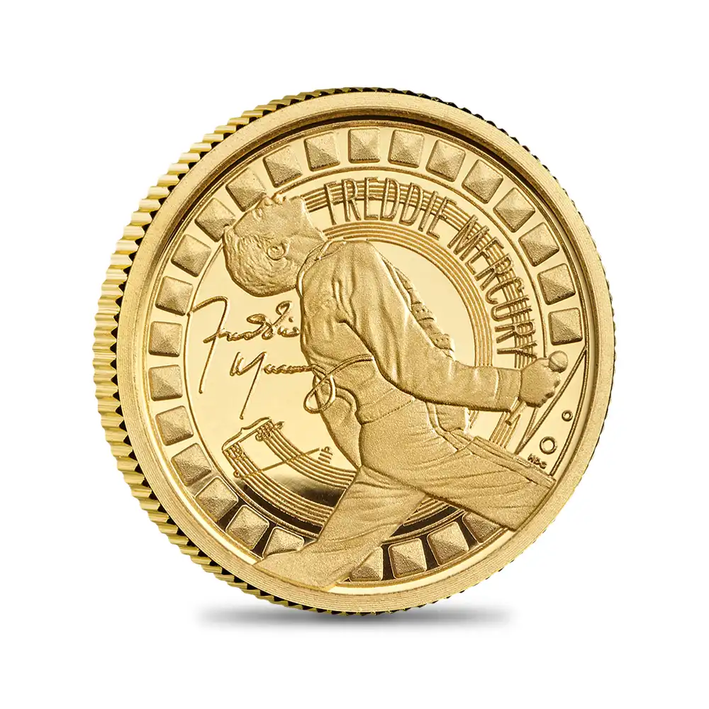 イギリス出身の優れたポップミュージシャンやロックアーティストを取り挙げ、瞬く間にモダンコインシリーズの傑作の仲間入りを果たしたロイヤルミントの「ミュージック・レジェンド・コレクション」。第1弾の「クイーン」の解禁以降、ミュージシャンたちの遊び心と音楽性を反映した極上のデザインをコイン上に描き、回を重ねるごとに多くのファンを獲得してきました。イギリスは第二次世界大戦後にポップ音楽の興隆期を迎え、綺羅星の如く多くのミュージシャンを輩出し、広い世界に送り出した背景がありました。それらの若き才能が創造した音楽は、今ではイギリスの国家的遺産として高く評価されています。同コレクションはその後も継続され、一時代を築いた名曲の数々と共に思い出される懐かしい面々をコイン上に描き大成功を収めます。今回同シリーズの第11弾として発表される「フレディ・マーキュリー」は、シリーズ第1弾として脚光を浴びた稀代のバンド「クイーン」のメインボーカルとして活躍していた歌手であり、同シリーズにおける単独での紹介が待ち望まれていた感があります。ポピュラー音楽の歴史上最も偉大なるシンガーの一人とされているフレディは、観客を引き付けるカリスマ的なステージ・パフォーマンスと幅広いボーカル・レンジによって今なお世界中の人々に愛され続けています。また自身のオリジナル曲の多くを作詞・作曲したことでも知られ、代表曲の「ボヘミアン・ラプソディ」を筆頭に、「キラー・クイーン」、「愛にすべてを」、「伝説のチャンピオン」などのヒット曲の多くを手掛けました。時は1990年代初頭、成功の渦中にあったフレディでしたが、1991年11月24日、HIV感染症によるAIDSを発症し、多くのファンに惜しまれつつこの世を去ります。その壮絶な最期は彼自身が創造した情熱的な音楽と共に半ば伝説化しており、「クイーン」というバンド名と共にマーキュリーの名を世界の音楽界に深く刻み込みました。子供のころからピアノの演奏に慣れ親しんでいたマーキュリーは、その後のバンド活動において作曲家としての才能を開花させます。実際、後に発表されたクイーンのグレイテスト・ヒッツに収録されていた17曲のうち、10曲はフレディが作曲したものであり、いかに彼が作曲の才能に恵まれていたかが分かります。その後は個人名義でも優れた楽曲を発表し続けたフレディでしたが、曲数に関しては初期の頃と比較して次第に減少していったといえます。彼の作曲の大きな特徴は、ロカビリー、プログレッシブ・ロック、ヘヴィメタル、ゴスペル、ディスコ音楽を含有する極めて融合的な内容を特徴としていました。ジャンルに捉われず自由な発想で作曲し、時代の空気を音楽で表現するのが彼独自のスタイルであったといえます。彼は常に音楽、映画、演劇の世界で何が起こっているのかを敏感に察知し、深く洞察する能力を持ち合わせていました。そして何よりもライブパーフォーマーとしてのフレディの才能は同時代の他のアーティストたちと比較しても群を抜いており、奇抜なファッションとステージでの熱狂的なパフォーマンスによって多くの観客を動員します。今回ご紹介のコインは、イギリスが世界に誇る名アーティストたちを網羅する一大モダンコインコレクション「ミュージック・レジェンド・コレクション」の第11弾として、再びスポットを浴びることになったフレディ・マーキュリーに捧げられる感動の作品です。コイン裏面には斬新なパフォーマンスによって一世を風靡したフレディのライブパフォーマンスを彷彿させるポートレートが描かれていて感無量です。今後のラインアップがまだまだ楽しみな同コレクションですが、ここに真打として正真正銘のレジェンド・オブ・レジェンドが加わったことは誠に喜ばしい限りです。