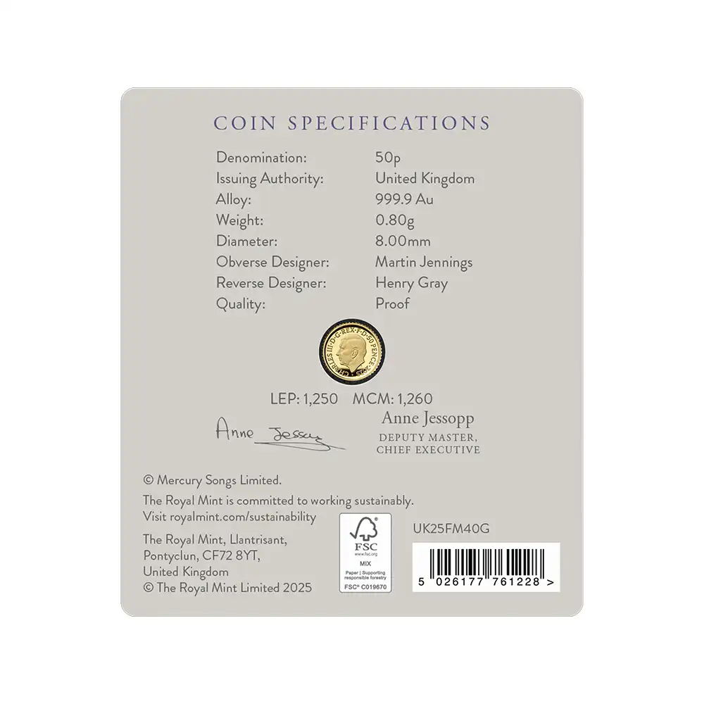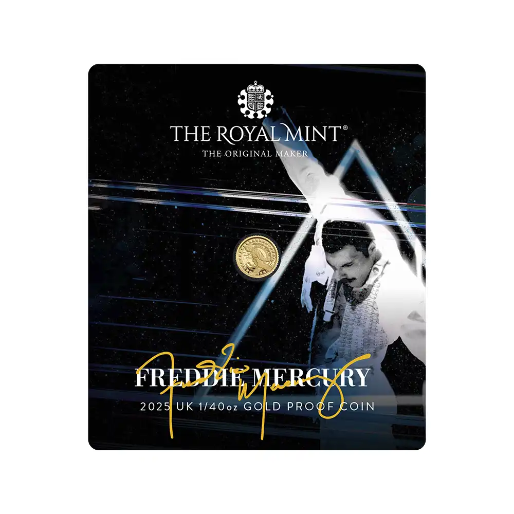 【未鑑定+鑑定オプション付き】2025 チャールズ3世 ミュージックレジェンド第12弾 フレディ・マーキュリー 50ペンス1/40オンスプルーフ金貨 未鑑定 ブリスターパック付き【ご予約承り品・納期約半年】