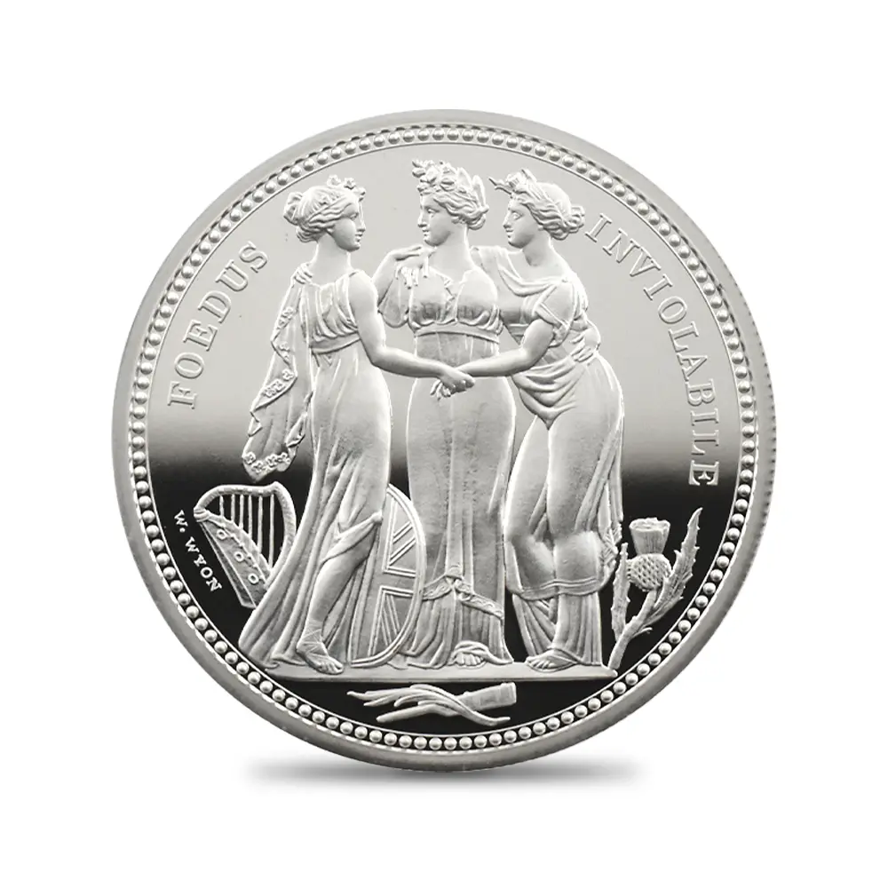 全世界的な脚光を浴び、貨幣史上空前の人気を誇ったロイヤルミントによる2019年「偉大なる芸術家シリーズ」の「ウナとライオン」に続く第2弾の満を持しての登場です。今回選定されたのは前回と同じく19世紀最高のコイン彫刻家ウィリアム・ワイオンによる最初期の傑作「スリーグレーセス」です。ワーテルローの戦いによって閉幕したナポレオン戦争後の英国社会の安定と平和を背景とする三人の女神たちの無言の対話を描くデザインによって称賛され続けています。ギリシャ神話に材を求めて描かれた三美神は、それぞれ若さ・歓喜・気品を象徴しており、崇高な空気を醸し出しています。19世紀初頭に頂点を極めた新古典様式を基調として描かれる三人の姿は、足元に見られるそれぞれの国家のシンボルと共に連合王国の確固たる統一を暗示しています。当銀貨最大のメッセージは三美神の繊細優雅な趣と、その背後に厳然として存在する英国の政治的宿願ではないでしょうか。