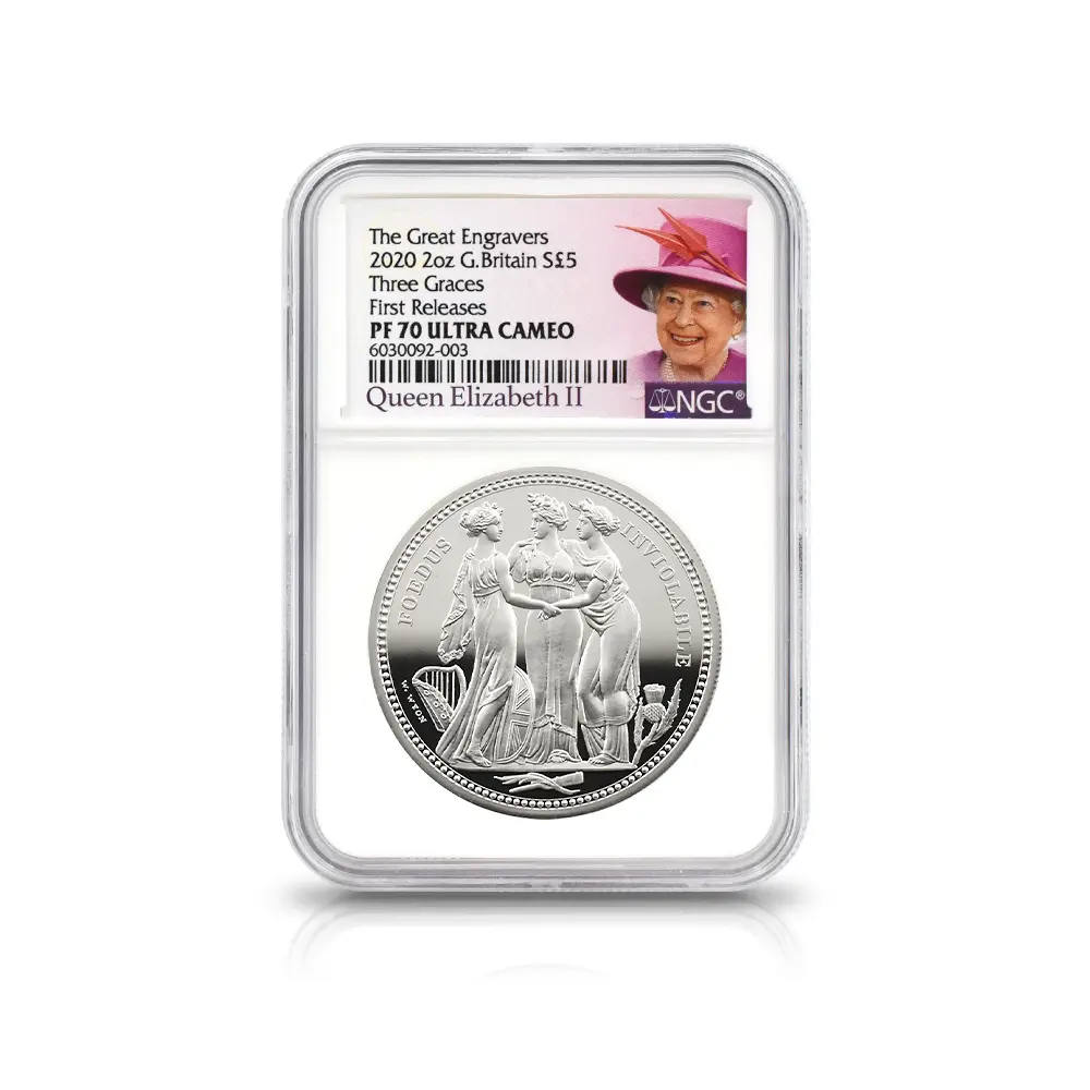 イギリス 2020 エリザベス2世 スリーグレーセス 5ポンド2オンス銀貨 ファーストリリース NGC PF70UC 箱付き