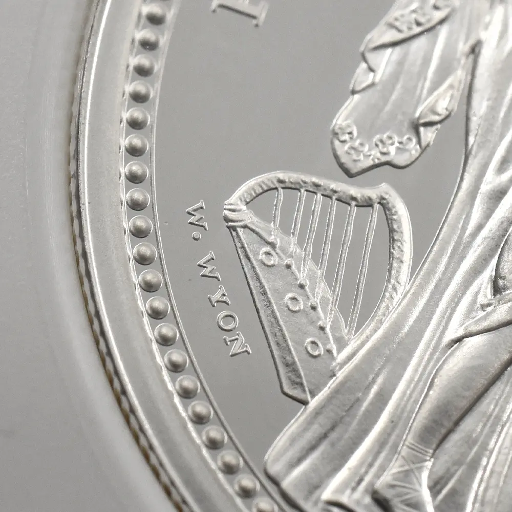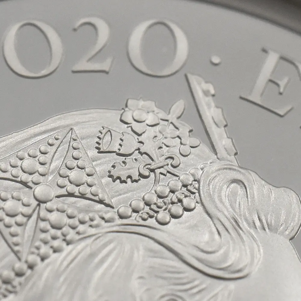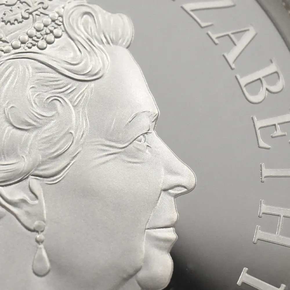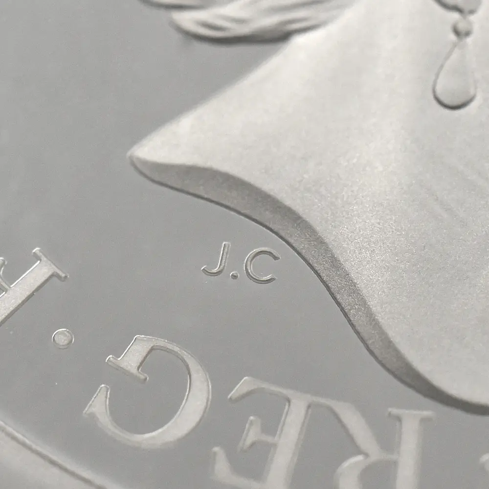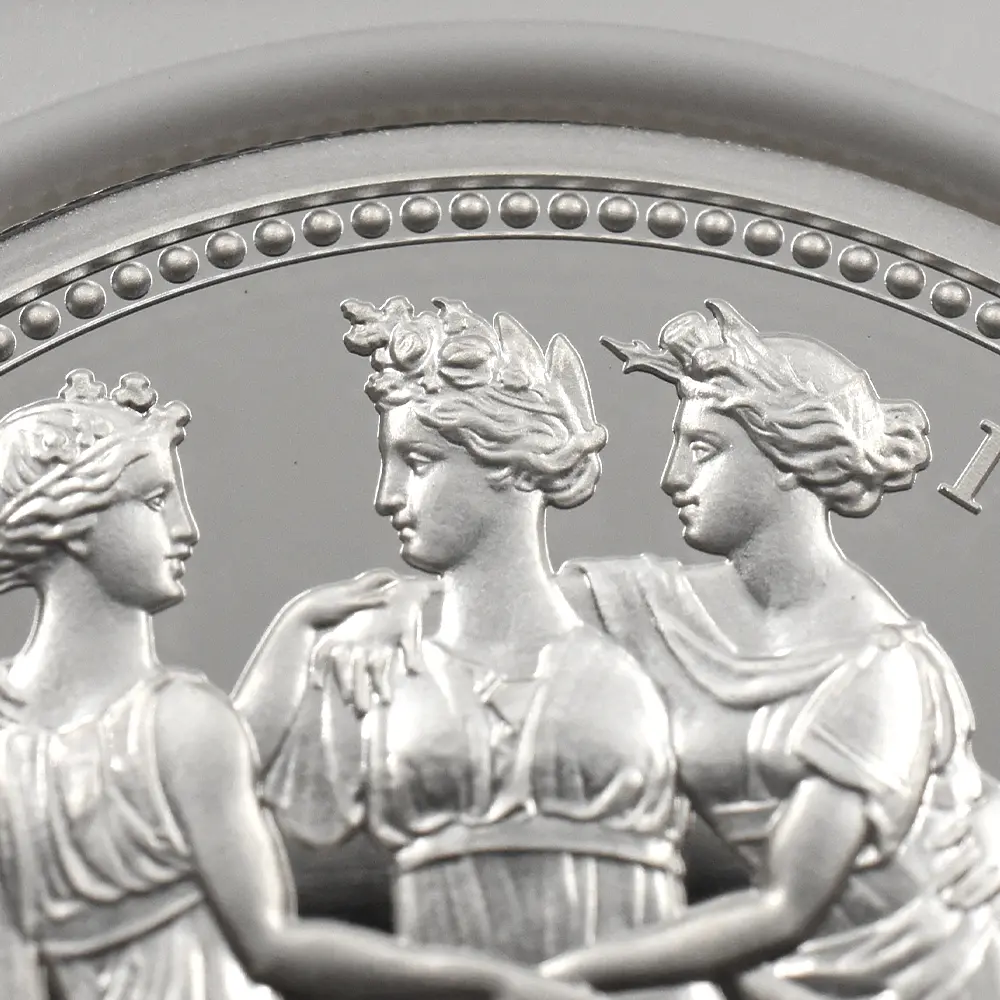 当銀貨表面に描かれているエリザベス二世の格調高いポートレートは現代を代表するロイヤルミントのデザイナー、ジョディ―・クラークの最高傑作です。女王の頭部を飾る英国王室屈指の至宝「ステート・ダイアモンド・ダイアデム」は、シルバーの素材感によって驚異的な重厚感を醸し出しています。ワイオンの手による数ある名品の中でも最も柔らかな質感を表現し尽くしている「スリーグレーセス」の意匠ですが、シルバープルーフの新鮮な輝きが三美神の柔らかな肢体と流れるようなドレープの美しさを最大限強調しており、見どころの多さがその特徴となっています。コインの表裏にそれぞれの時代の傑作を頂く当銀貨は、ロイヤルミントによる貨幣製造技術の粋を極めた完成度の高さによって現代に蘇った奇跡的名貨です。三美神に代表される英国の理想は艶やかなシルバーの輝きと共に永久不滅となりました。