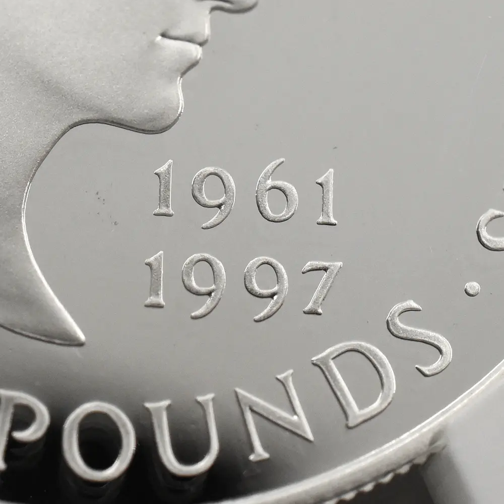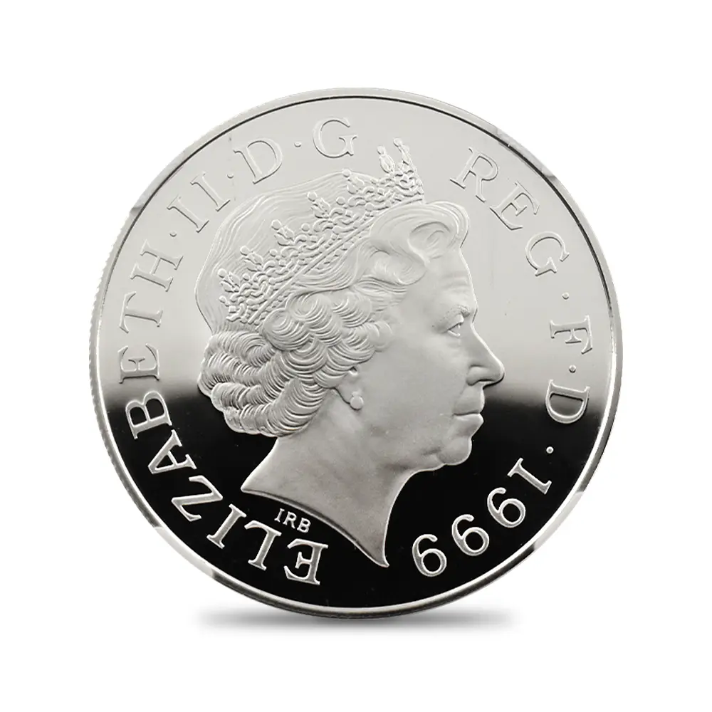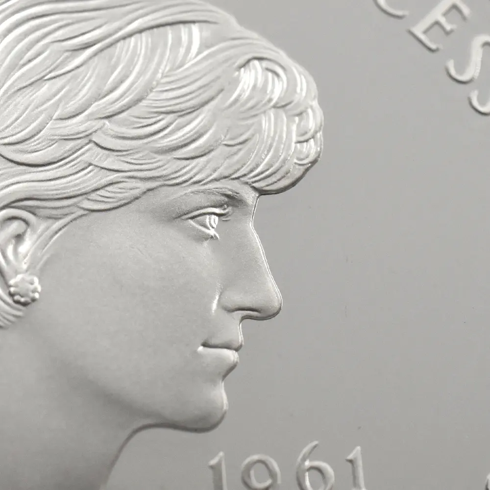 1999年、元妃の死から2年の時を経てリリースされたこの5ポンド銀貨は、生前のダイアナ元妃の面影を刻む英国内で発行された唯一の記念銀貨です。頭上には皇太子妃の高位を示すティアラも装飾品も見当たりません。そこにはただうつむき加減に頭を下げ、美しくも謙虚な自由人としてのダイアナ元妃の姿のみが忠実に再現されています。元妃ほど世界中で愛された人物は歴史上そう多くはないはずですが、今は亡き元妃の存在が一層生命力を帯び、元妃が掲げた利他愛が今でもこの世に生き残り、元妃の伝説と共にますますその真価を発揮しているということをこの銀貨は力強く物語っています。他者に対する限りない愛情のみが永遠であるということを、コインの中の元妃の肖像はただただ無言で語りかけてくるようです。