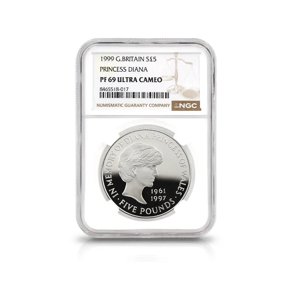 イギリス 1999 エリザベス2世 ダイアナ妃追悼記念 5ポンド銀貨 NGC PF69UC 箱付き