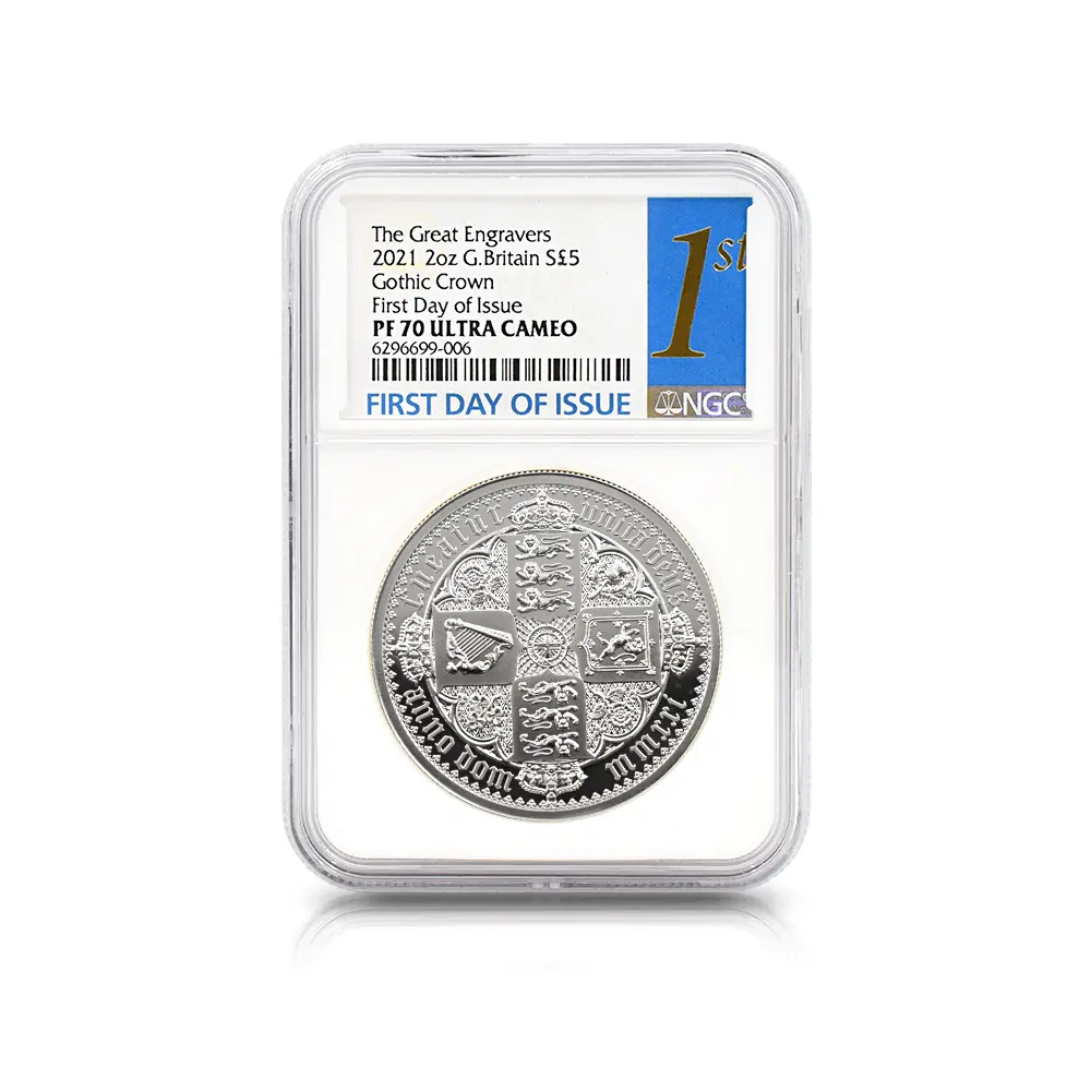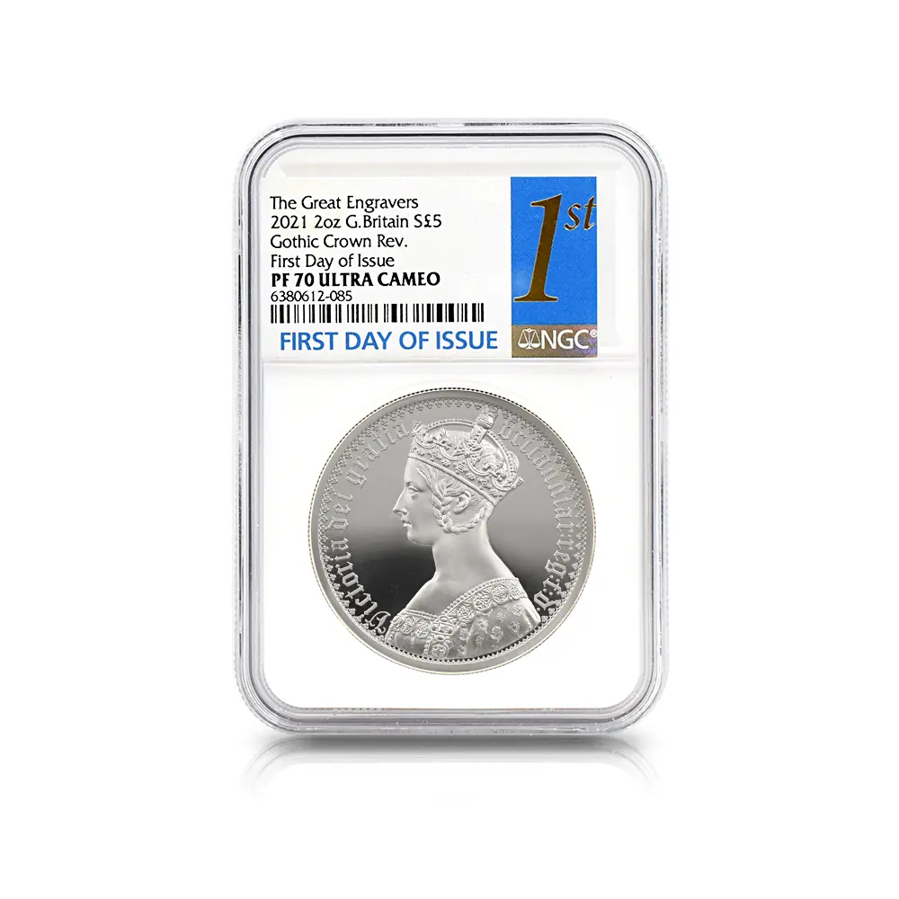 記念貨としての性格を持つ「ゴチッククラウン」ですが実際には流通貨として誕生し、 8000枚の銀貨が制作されたことが記録に残っています。大型で見栄えのする銀貨であることから現在も高い人気を誇る「ゴチッククラウン」ですが、銀貨としては例外的な高値で取引されており、時代を超越してアンティーク・コイン・コレクターの垂涎の的となっています。「ポートレート」のリリースによって遂に完成の域に達する「グレートエングレーバーシリーズ」第3弾「ゴチッククラウン」