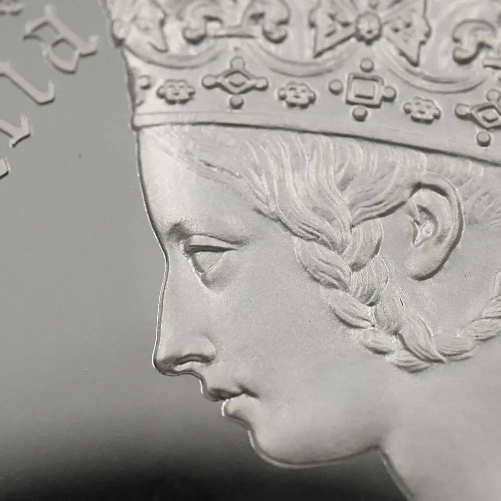 この度の「ポートレート」にまつわる興味の対象として、表面に現英国君主エリザベス女王の有名な「第5肖像」、そして裏面に伝説的なヴィクトリア女王の「ポートレート」と、歴史上に名を残す2人の女王の肖像を一枚のコインの表裏に刻んでいることが挙げられます。現代的に洗練された気品を感じさせるエリザベス女王の横顔は、荘厳な趣を湛えるヴィクトリア女王の絵姿と対を成すに相応しいものであり、この優れたモダンコインの主要なテーマとなっています。そして特筆すべきは、新たに生み出されたコインとしての奇跡的なレベルでの完成度の高さです。