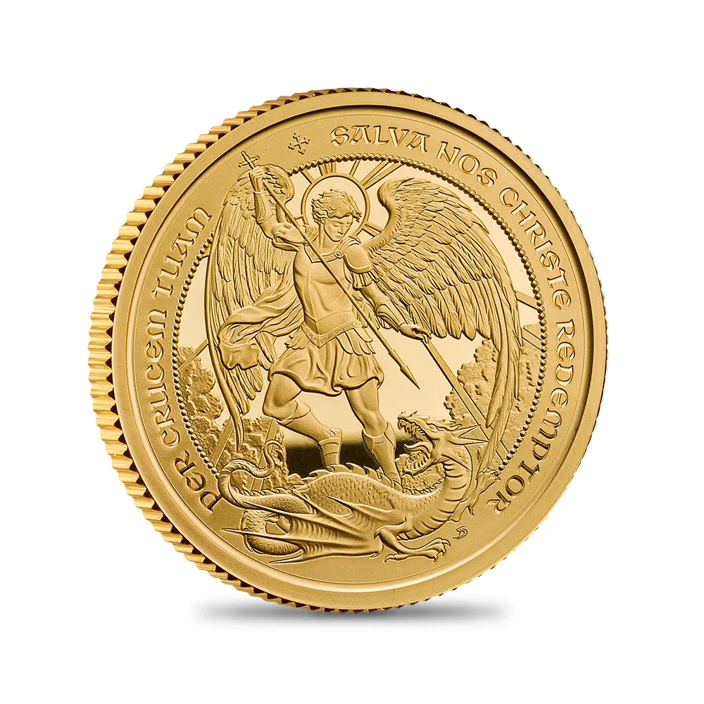 1460年代に初登場となったオリジナルのエンジェル金貨は、それまでずっと発行が続いていたノーブル金貨の小型の代用金貨として考案されたものでした。コインに大天使ミカエルが描かれていたことから「エンジェル」と名付けられたこの金貨には、古来治癒力があるとされていました。エドワード4世の治世下に初めて紹介されたエンジェル金貨ですが、天の意思によって王位を継承したと信じられていた国王には治癒力が備わっていると考えられていたため、国王の手が触れた金貨を手渡されることにより、様々な患者の病状を回復させる力が備わっていると信じられていた時期がありました。エンジェル金貨はまたお守りのように取り扱われることも多かったようで、コインの一部分に穴を開け、そこに紐を通して首から下げられたりしていたようです。1000年以上に及ぶ英国貨幣界の歴史において、ハンマー打ち時代の代表貨として今でもコレクターに大人気のエンジェル金貨ですが、偏にデザインの素晴らしさと歴史的な背景ゆえの人気ではないかと思われます。薔薇戦争の勝利者として知られるヨーク家出身の初代国王エドワード4世の時代に考案されたエンジェル金貨ですが、偉大なる王の名と共に語り継がれている金貨でもあります。中世イングランドを代表する国王として知られるエドワード4世は、優れた政務能力の実行者として特にその名を歴史上に刻む名君として知られていますが、同時代を代表する類まれなる偉丈夫でもありました。その偉大なる治世を何よりも象徴するのが、王の時代に初発行となったエンジェル金貨に他なりません。今回ご紹介の作品は、史上初のエンジェル金貨の発行から500有余年を経てモダンコイン上にて初めて紹介されるエンジェル金貨へのオマージュです。オリジナルのエンジェル金貨のデザインには敬意を表しつつも、現代ならではの斬新な意匠が大天使ミカエルの姿をコイン裏面にくっきりと浮かび上がらせています。悪を象徴するドラゴンを槍で退治する天使の姿は古くからエンジェルの古典的構図として、造形芸術の各分野において継承され続けてきました。当作品裏面に描かれているエンジェルは実に現代的感覚に満ちており、大きな羽を広げてドラゴンに挑みかかる姿は時代を超えて多くのファンに感動をもたらすことでしょう。この見事な意匠は、現在ロイヤルミントで活躍するサンドラ・デイエナの炸裂する現代性と古典的造形感覚の賜物です。裏面上にバランスよく配置された大天使ミカエルとドラゴンの意匠は、コインデザインの域を超越して見事な対比と調和を醸し出しています。コイン表面には2022年の代替わりに際して王位を継承した現国王チャールズ3世の左向き肖像が掲げられています。即位の翌年2023年5月6日には戴冠式が挙行され、会場となったロンドンのウェストミンスター寺院から全世界に祝賀ムードが広がりを見せたことは記憶に新しく残っています。そして英国貨幣界において鮮烈なデビューを果たしたこの公式コイン肖像は、国王のありのままの姿を描く現代屈指の傑作コインポートレートとして、コイン界に定着した感があります。コイン表裏に鮮烈なデザインを描く当コインは、かつてお守りとしての治癒力を特徴としていたエンジェル金貨に敬意を表する歴史的作品として、今後市場において継続的な人気を獲得することが予想されます。どうぞ当コインを手に取って大天使ミカエルが表現する安定と調和をお楽しみください。