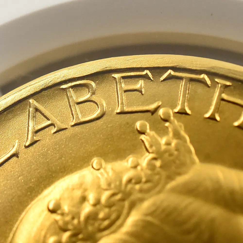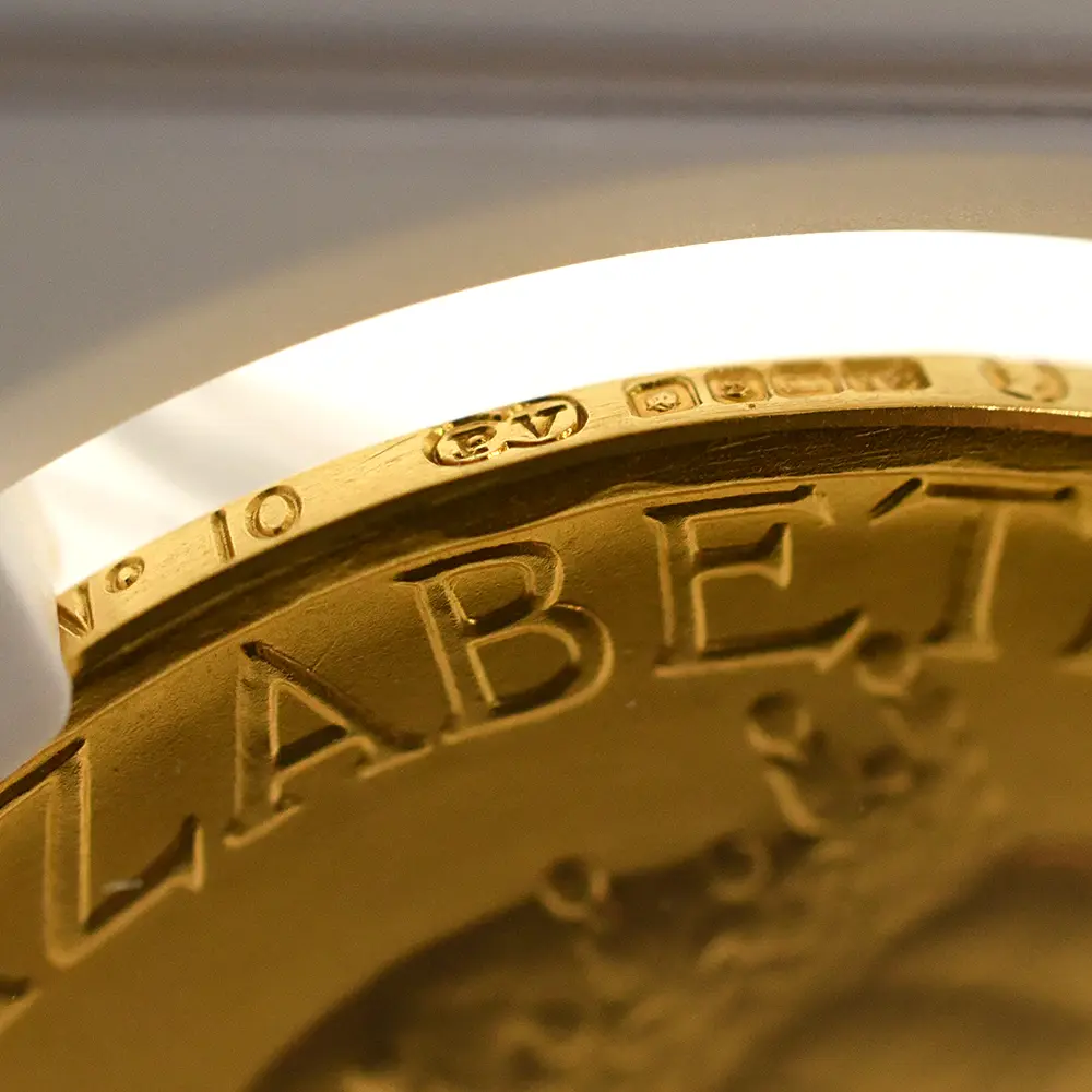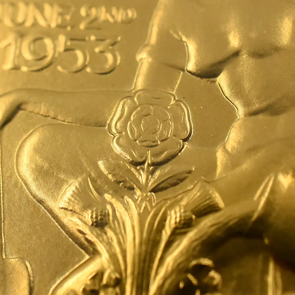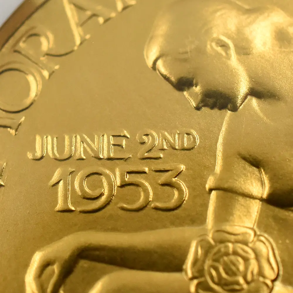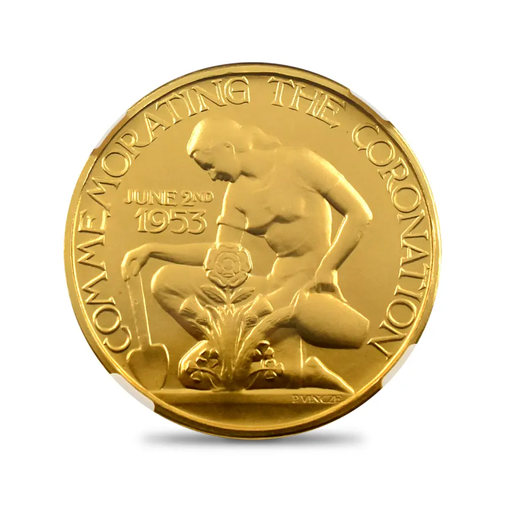 表面に描かれたエリザベス2世の肖像画は、即位当時若干25歳であった女王の若々しい美しさと気品を醸し出しています。女王の頭上に輝くのは、祖母のメアリー王妃伝来の英国王室の秘宝「大英帝国とアイルランドの少女たちのティアラ」です。裏面のデザインは、メダルデザイナーとしてのヴィンツェの天才を実証しています。そこには若い女性が植物に水を与えている平和で感動的な姿が刻まれていますが、英連合王国三国(イングランド、スコットランド、アイルランド)の国花(バラ・アザミ・シャムロック)を守護する女性の姿は、そのままそれらの国々の安定と平和を見届ける若き英国君主の姿に置き換えることが出来ます。3種のメダルのうち、特に18カラット・ゴールドのものは限定25枚しか発行されておらず、この歴史的な儀式の究極の記念品としての絶対的価値を表出しています。戴冠式の年に発行された多種多様なコインとメダルの中で、当作品はそのデザイン性と希少価値において特筆されるものであるため、マニアにとってはこの種のものの中で最も入手困難な記念メダルセットの一つとして知られています。