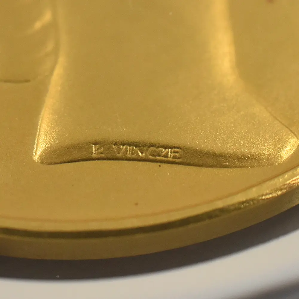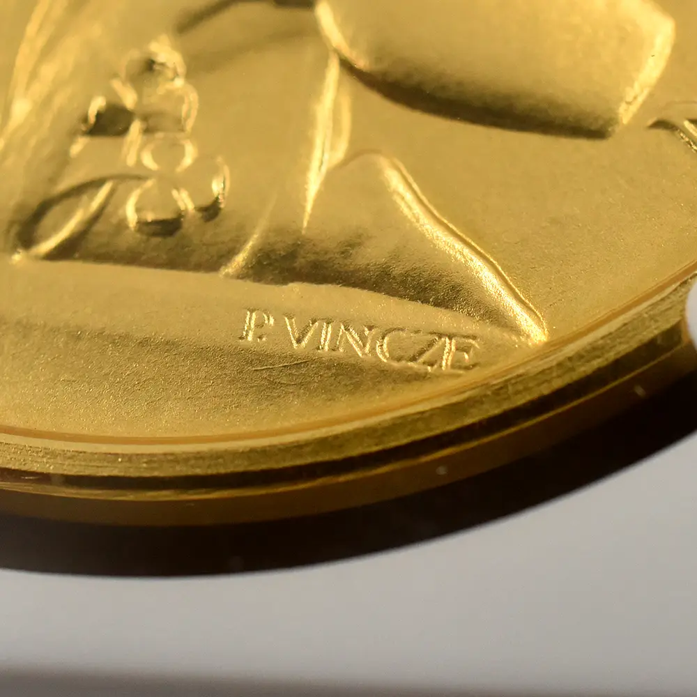 1952年に英国が迎えた待望の新女王即位の重要性は、翌年の戴冠式によって一層強調され、ロイヤルミントによって発行された数々の記念メダルによって恒久化されたと言っても過言ではありません。金、銀、銅の3種のマテリアルを用いて制作された当メダルセットは、戴冠式の偉容を如実に伝えると共に、エリザベス2世の神格化された美しさと威厳を同時に誇示する役割を果たしています。その優れた表裏のデザインの創造主は、20世紀の英国を代表するコインとメダルのデザイナーの一人、ポール・ヴィンツェ(1907-1984)です。ハンガリーのブダペスト出身のヴィンツェは、大戦前にナチス・ドイツの迫害を逃れて渡英し、戦後同地に帰化した異色の才人です。多くの貨幣学研究者から絶賛されているその作風と完成度の高さは、エリザベス2世の戴冠式記念メダルの制作というまたとない機会を得て結実し、才能の限りを尽くしてキャリア上における最高傑作を世に送り出しました。