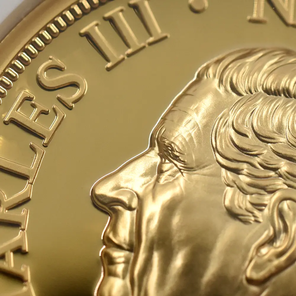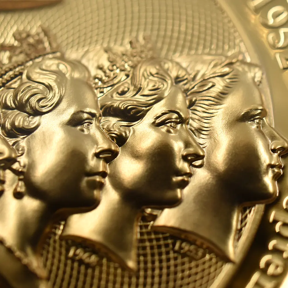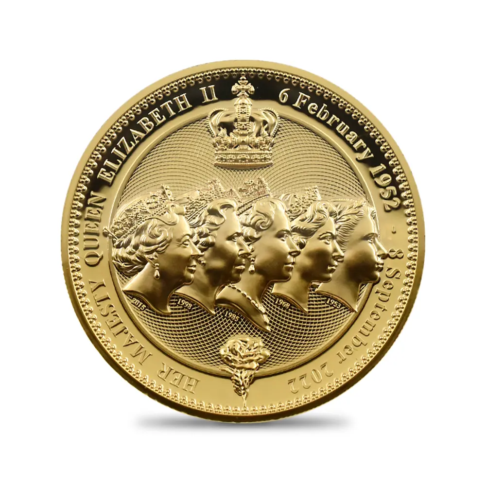 2022年9月8日に世界に惜しまれつつ崩御したイギリス連合王国君主エリザベス2世。70年間の女王の治世は、二つの大戦を経験したイギリスが戦後の荒廃から立ち上がり、未曽有の繁栄を謳歌した時節として今なお語り継がれています。長期在位を誇った女王の治世下において連合王国に属する各国は一層の結束を深め、20世紀から21世紀にかけての激動の時代を駆け抜けました。その始まりを告げる儀式でもあった1953年6月2日の女王の戴冠式は、それまでの大英帝国史の総決算として挙行され、国家の威厳を内外に誇示する重要な役目を果たしました。そして英国貨幣界もまた、この世紀の節目を記念して新しい貨幣を次々と発行したことは深い意義を有します。戴冠式の年に初お目見えとなったエリザベス2世の公式第1肖像「ヤングヤング・エリザベス」は、当時20代後半に差し掛かったばかりの女王の瑞々しい横顔が特徴であり、何度見ても飽きの来ないものです。1950年代を代表する女流彫刻家のメアリー・ギリックの最高傑作と謳われるこの作品はまた、女王の夫のエディンバラ公爵の個人的な好みが反映されたものであったというエピソードが残っています。1968年に発表された公式第2肖像は、通常「ヤング・エリザベス」の愛称によって知られています。作者のアーノルド・メイチンが描く女王像は前作とは打って変わって貫録漲るものであり、長きにわたって親しまれていました。この作品のトレードマークともいえる頭上の宝飾品は、女王が生涯にわたって公式の場で着用していた「大英帝国とアイルランドの少女たちのティアラ」です。英国王室の秘宝とも言われるこの歴史的なティアラは、1893年に後のジョージ5世とメアリー王妃の婚礼の際にアイルランドを本拠とする女性のみの慈善団体が寄付金を募って購入し、王室に献上したと伝えられているものです。1947年のエリザベス2世とフィリップ王子の結婚に際して、祖母のメアリー王妃が孫のエリザベスに贈ったときから女王の所有となりました。このティアラはまた、女王の公式第4肖像に挿入されていたことでも知られています。次の第3肖像は「ミドル・エリザベス」と呼ばれることもあり、一層の威厳を身に着けた女王59歳の時のポートレートとして知られています。頭上の宝飾品は前述のティアラではなく、この作品において初めてダイアデムが冠せられました。19世紀初頭の君主ジョージ4世ゆかりのこの秘宝は「ステート・ダイアモンド・ダイアデム」と呼ばれ、4世の戴冠式の際にロンドンの王室御用達宝石商のランデル・ブリッジが制作したものと伝えられています。1333個ものホワイトとイエローダイアモンドが鏤められた壮絶な名品として知られており、王室所有の宝冠の類の中でもひと際光彩を放っています。1998年には公式第4肖像が発表されましたが、この作品こそは現在も存命中のイギリス出身の大彫刻家イアン・ランク・ブロードリーの最高傑作として知られている真の芸術品です。当時72歳であった女王の老年期ならではの柔らかな表情が眼目であり、過去に制作されたコイン肖像と比較しても引けを取らない出来栄えを誇ります。そして2015年には当時89歳であった女王の姿を描く公式第5肖像が発表され話題を呼びました。イギリス連合王国にとってもロイヤルミントにとっても最後となったこの見事なコインポートレートは、治世末期を彩るこの種の作品の総決算として誕生しました。当時若干35歳であったデザイナーのジョディ・クラークは、この作品によって芸術家としての才能を十全に証明しました。今回ご紹介のハイレリーフ1ドル金メッキ銅貨は、70年間に発表された全5種の公式コイン肖像を裏面に描くデラックス版であり、コレクター向けのコインの発行で定評のあるイギリスの海外属領のニウエが発行元となっています。表面のチャールズ3世の肖像は、第5肖像の制作家でもあるジョディ・クラークの手によるもので、これもまた見応えがあります。エリザベス2世の追悼記念の品としての当コインの価値は計り知れず、今後の世界的注目は必至と思われます。