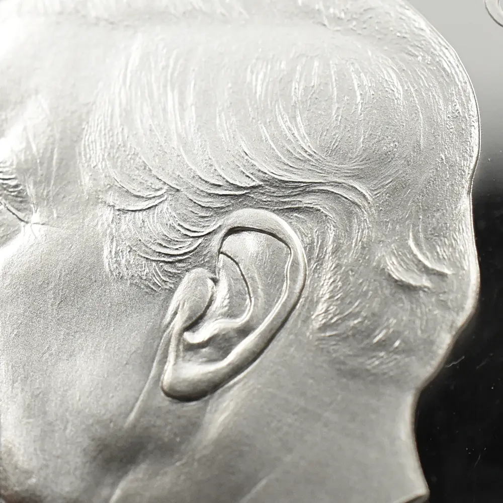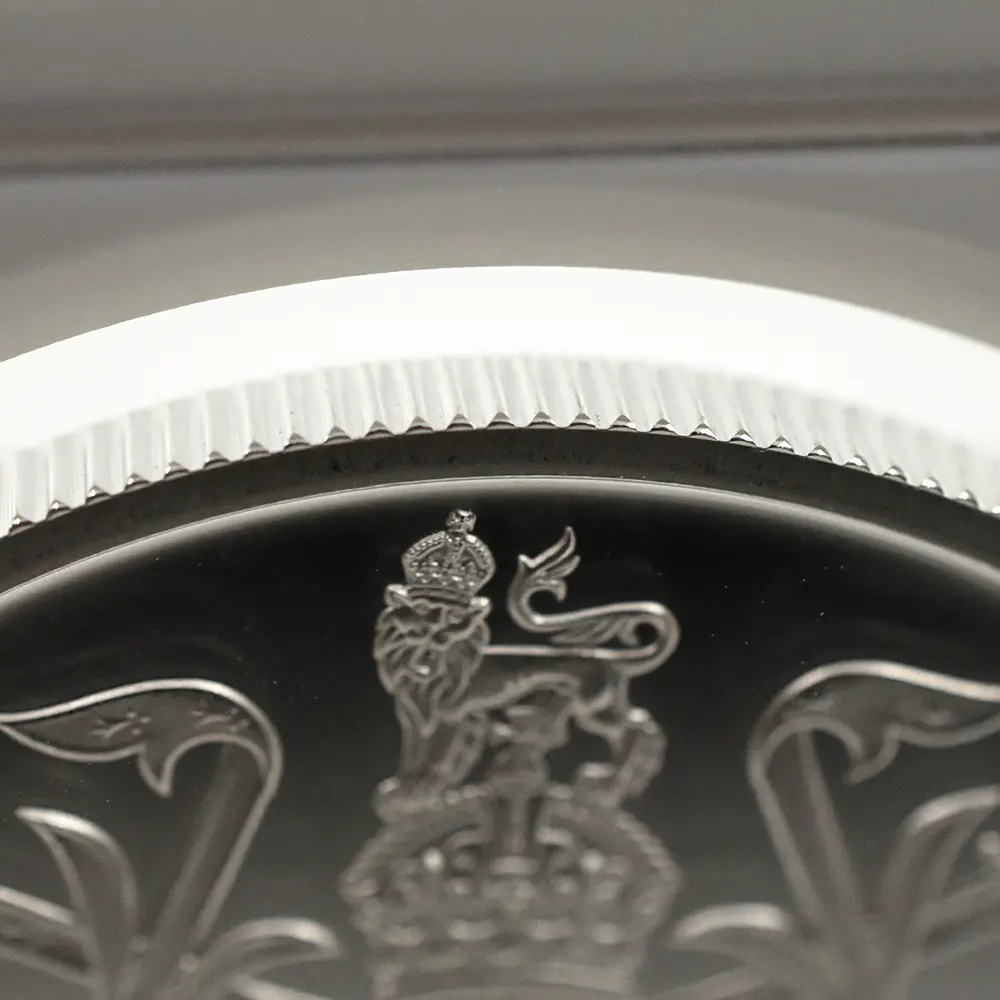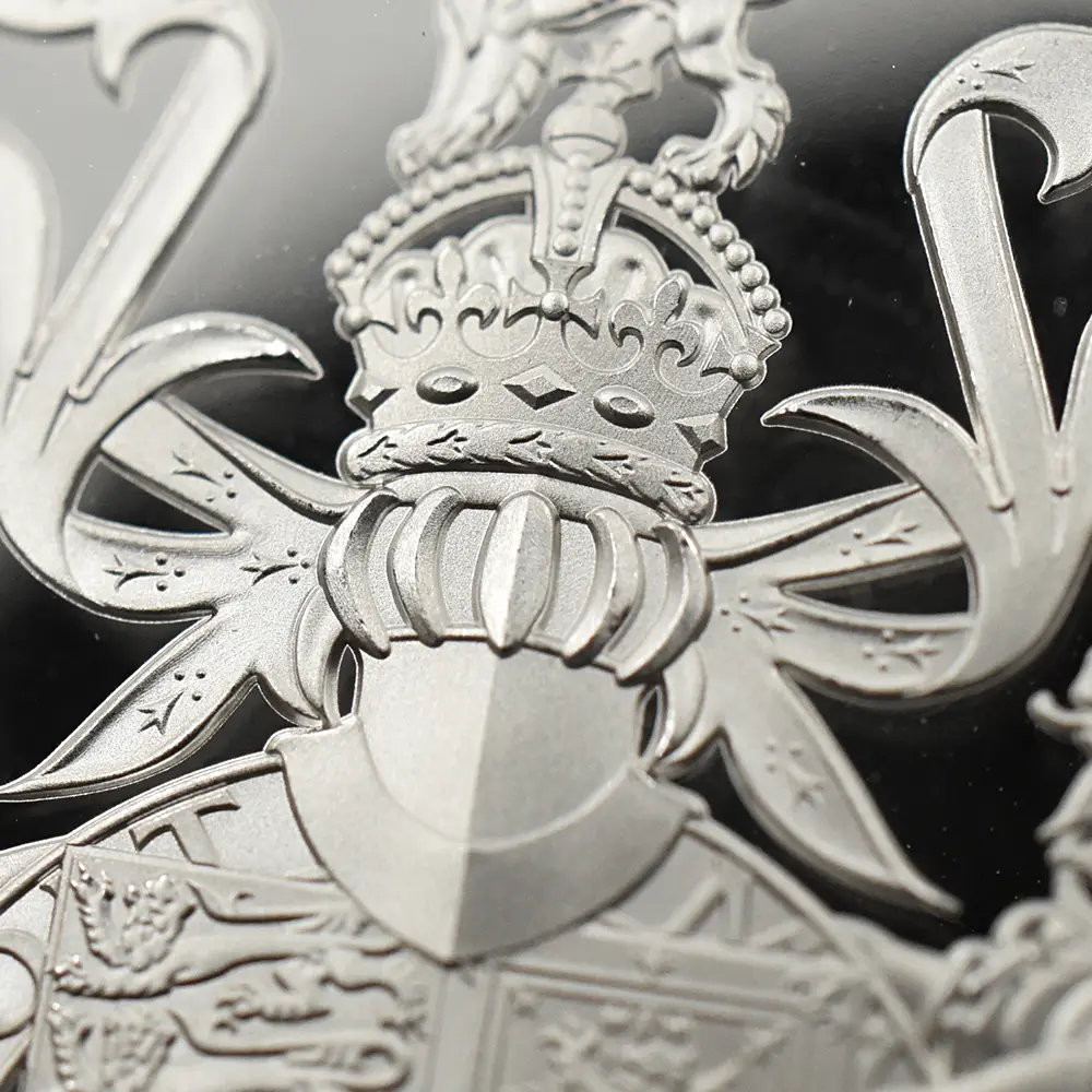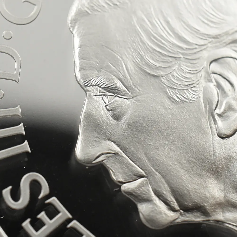 コイン表面にはやはり2022年の代替わりに際して新たに発表されたチャールズ3世の「公式第1コイン肖像」が掲げられています。左向きの新国王の横顔からは、全世界に分散する連合王国と連邦の宗主としての気概が感じられます。21世紀を代表する傑作コインポートレートの誕生を喜ばずにはいられません。現代ロイヤルミントを代表する名デザイナー、マーティン・ジェニングスの感性漲るこの作品は、73歳と高齢で即位した国王の老いの姿すらも決して隠そうとはせず、あくまでもありのままの自然体で描き切っており、素直に共感できるものです。新時代の幕開けを象徴するコート・オブ・アームズの満を持してのコイン上でのリリースは、連合王国のみならず全世界を魅了することと思われます。