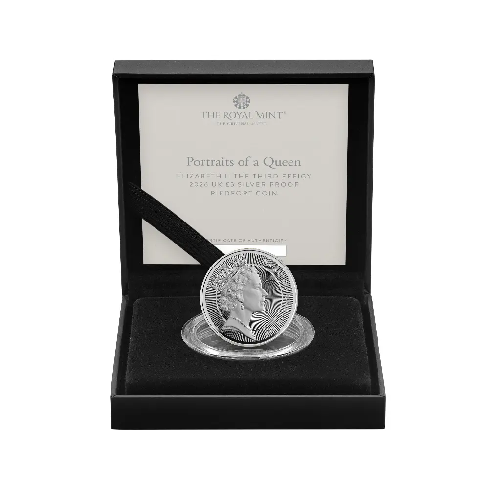 【未鑑定+鑑定オプション付き】2026 チャールズ3世 エリザベス2世のコイン肖像シリーズ 第三弾 ミドルエリザベス 5ポンドプルーフピエフォー銀貨 未鑑定 箱付き【ご予約承り品・納期約半年】