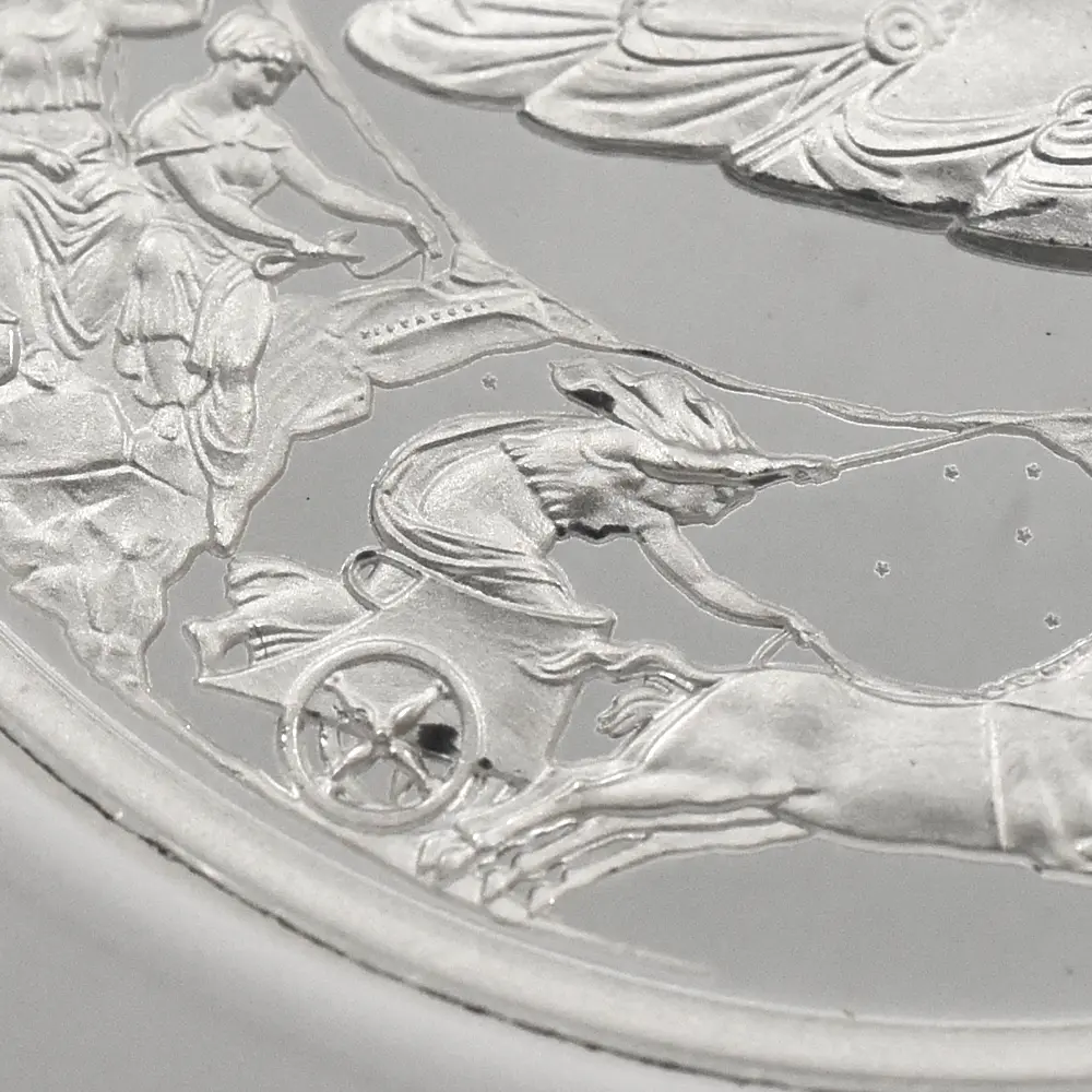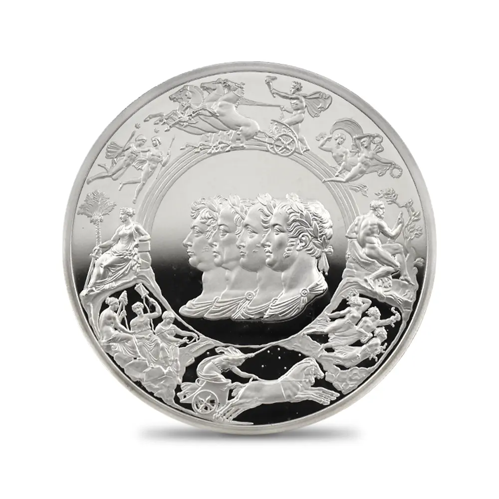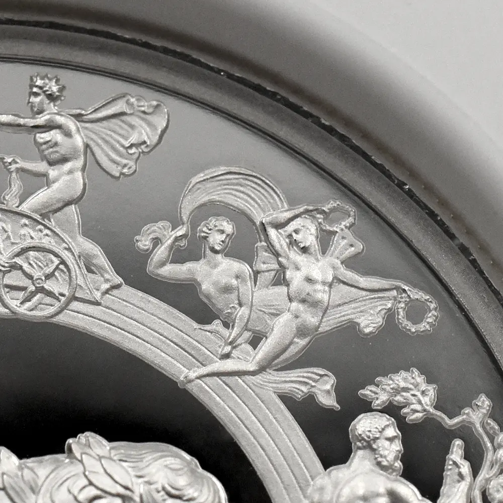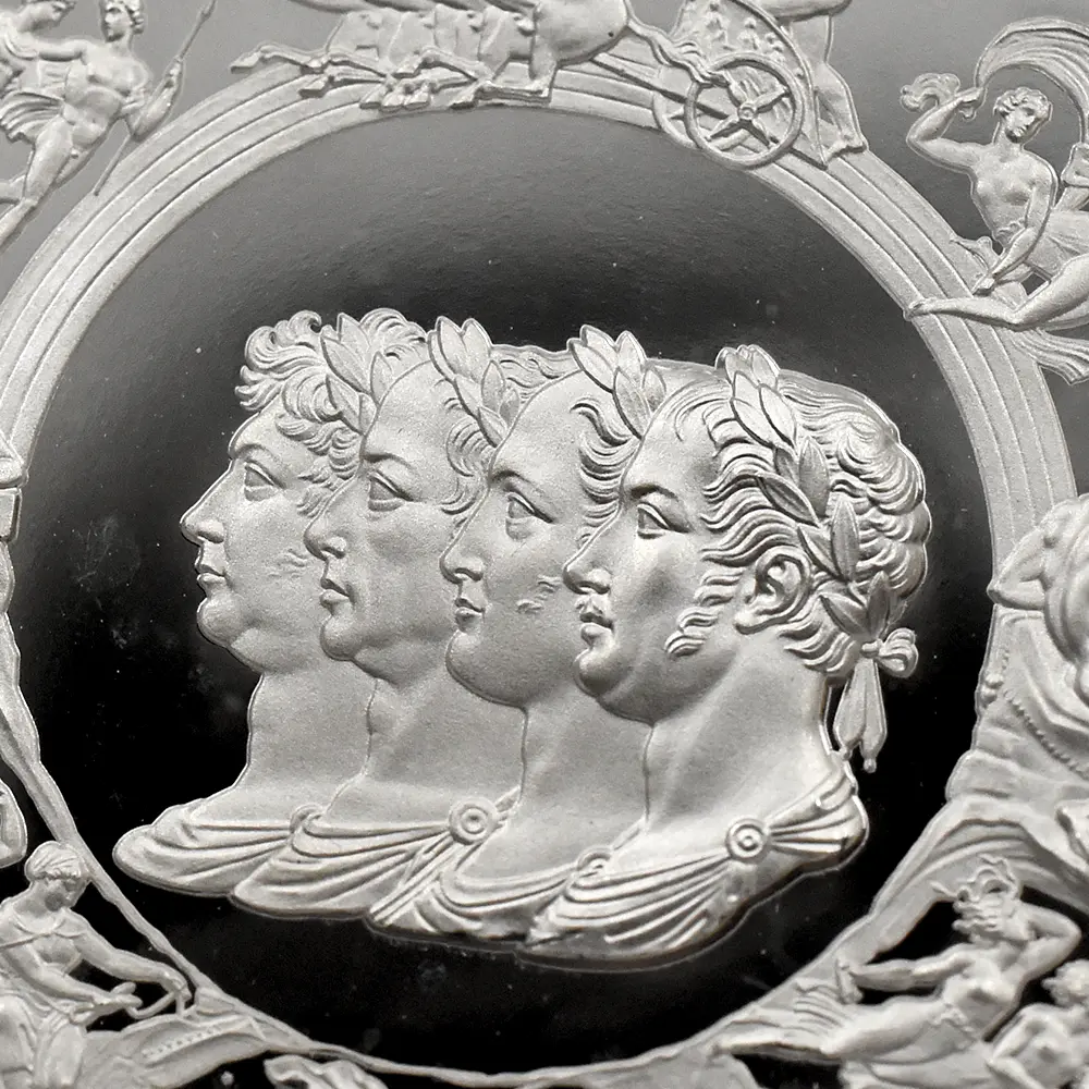 ©The Royal Mint コイン彫刻家の第一人者として名を馳せたピストゥルッチでしたが、イタリア人芸術家の独壇場でもあるカメオ細工の技法を活かしたメダルの制作は、それにもまして精巧を極めていました。過去の歴史的なコインとメダルの傑作を現代に紹介する重要な使命を掲げるロイヤルミントによる「 偉大なる彫刻家シリーズ」は、貨幣史上に刻まれる傑作を創造したいにしえの名彫刻家たちに捧げられる感動のオマージュです。中でも第1弾「ウナとライオン」は、現時点におけるモダンコインの最高傑作として空前の人気を博しました。今回ご紹介させていただく作品は「偉大なる彫刻家シリーズ」の第6弾に当たる作品で、ピストゥルッチが制作したメダルの最高峰「ワーテルロー・メダル」が取り挙げられます。世界史上での歴史的な快挙とされるワーテルローの戦いでの英国軍の勝利ですが、ナポレオン率いるフランス軍の敗退によって再びヨーロッパ全体に平和がもたらされました。オリジナルメダルの表面のみを裏面として復刻するこのリマスター版ですが、現代作品ならではの造形美を金属の輝きが際立たせています。