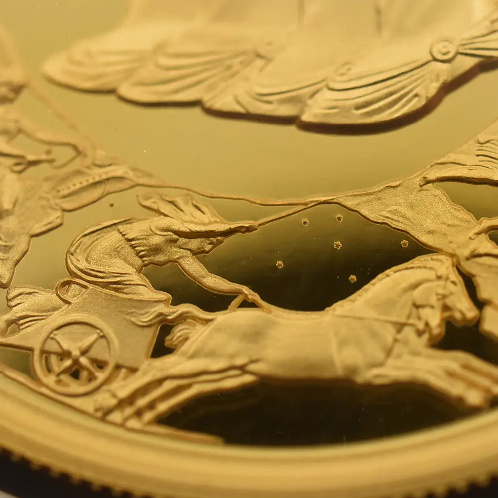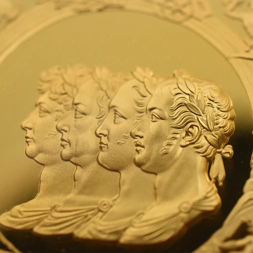 ©The Royal Mint コイン彫刻家の第一人者として名を馳せたピストゥルッチでしたが、イタリア人芸術家の独壇場でもあるカメオ細工の技法を活かしたメダルの制作は、それにもまして精巧を極めていました。過去の歴史的なコインとメダルの傑作を現代に紹介する重要な使命を掲げるロイヤルミントによる「 偉大なる彫刻家シリーズ」は、貨幣史上に刻まれる傑作を創造したいにしえの名彫刻家たちに捧げられる感動のオマージュです。中でも第1弾「ウナとライオン」は、現時点におけるモダンコインの最高傑作として空前の人気を博しました。今回ご紹介させていただく作品は「偉大なる彫刻家シリーズ」の第6弾に当たる作品で、ピストゥルッチが制作したメダルの最高峰「ワーテルロー・メダル」が取り挙げられます。世界史上での歴史的な快挙とされるワーテルローの戦いでの英国軍の勝利ですが、ナポレオン率いるフランス軍の敗退によって再びヨーロッパ全体に平和がもたらされました。オリジナルメダルの表面のみを裏面として復刻するこのリマスター版ですが、現代作品ならではの造形美を金属の輝きが際立たせています。