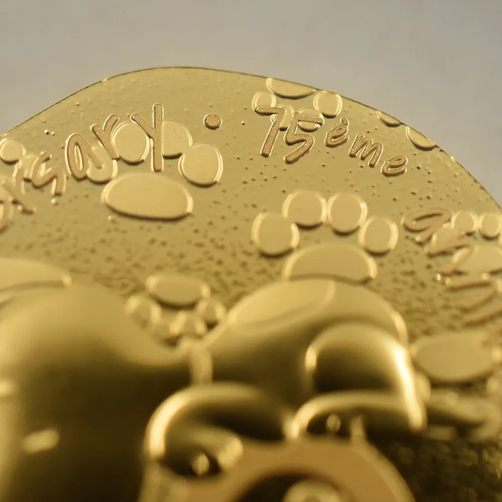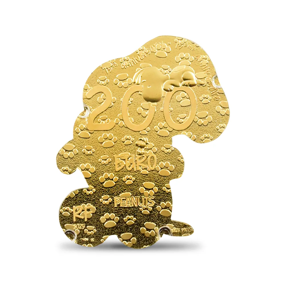 アメリカ合衆国出身の漫画家チャールズ・モンロー・シュルツが1950年に発表したスヌーピーは、漫画としてのみならず今や児童文学の傑作として、老若男女を問わず世界中のファンを魅了し続けています。シュルツが書いた漫画「ピーナッツ」に主人公のチャーリー・ブラウン少年のペットとして登場するスヌーピーですが、もともとは作者が13歳の時に飼っていたビーグル犬の雑種がモデルであったという逸話が残っています。また作中にてスポーツと小説の執筆が趣味という設定となっており、生まれた場所は少年が住む地域から近いデイジーヒル子犬園とのことです。漫画連載の初回においてのスヌーピーの登場は無かったものの、連載開始の2日後の1950年10月4日に初登場となったことが記録されています。今でこそ、あの白黒の可愛らしい姿で人気を博しているスヌーピーですが、初めて登場した時は完全に犬の姿で描写されており、連載が進むにしたがって姿を変え、現在われわれが見る姿へと変わっていきました。世界的に認知されているキャラクターであり、その可愛らしい風貌は日本でも絶大な人気を誇ります。また日本ではオリジナルの漫画「ピーナッツ」よりもスヌーピーの名によってより広く知られている感があり、漫画の代名詞となっているほどです。それ故に漫画の名前自体がスヌーピーだと思われていたり、あるいはスヌーピーが漫画の主人公だと誤解されるケースが多いことも事実です。当然のことながら漫画の主人公はチャーリー・ブラウンです。作中にて登場するスヌーピーはチャーリー・ブラウン少年の飼い犬という設定ですが、飼い主の名前をなかなか覚えようとしなかったり、何度も「丸頭の男の子」と呼んだりするシーンがあります。また少年に飼われ始めた当初は自分のことをチャーリーの主人だと勘違いすることもありました。チャーリーに飼われるようになるまでのスヌーピーはライラという少女に飼われていましたが、彼女の引っ越し先のマンションがペット禁止であったためにデイジーヒル子犬園に連れ戻されることから物語は幕を開けます。ある時チャーリーが近くの公園の砂場で一人で遊んでいるときに、見知らぬ子供からバケツ一杯の砂を頭から変えられるというハプニングに見舞われ、泣き出してしまいます。その翌日にチャーリーの両親は彼を車でデイジーヒル子犬園に連れて行ってくれます、そこでチャーリーが出会ったのが未だ子犬であった実に可愛らしいスヌーピーだったというのがお互いの出会いでした。またアニメ版「スヌーピー」では、学校から帰っても家には妹のサリーしかいないために寂しく思っていたところ、子犬園で飼い主を募集している子犬を5ドルで引き取ったというのが始まりです。かわいい姿によって多くのファンを持つスヌーピーですが、それだけではなくナルシストな一面を持ち合わせています。ある時、水面に映っている自分の姿に見入り、喉が渇いても水面に映る自分の姿が消えてしまうためにその水を飲むことをためらうというシーンがあるほどです。今回ご紹介のコインは、過去にも数多くの個性的なコインの発行によって称賛の対象となっているフランスのパリ造幣局の制作によるスヌーピー型の200ユーロ金貨です。1950年にこの愛すべきキャラクターが誕生してから2025年で75周年を迎えます。それを記念して誕生した当金貨には75周年に因む75という数字が刻まれたハートが挿入されています。コインといいますと丸型が定番ですが、このスヌーピー型の作品には200ユーロという貨幣価値が付帯しますので、いわゆる貨幣価値を持つ本格的なコインということになります。過去にも幾つかの変形コインの発行によって注目を集めたパリ造幣局ですが、今回のスヌーピー型のコインは理想を形にしたコインの代表作として、スヌーピーファンを始め、より多くの人々に愛されることでしょう。