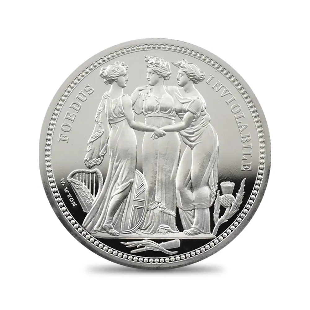 全世界的な脚光を浴び、貨幣史上空前の人気を誇ったロイヤルミントによる2019年「偉大なる芸術家シリーズ」の「ウナとライオン」に続く第2弾の満を持しての登場です。今回選定されたのは前回と同じく19世紀最高のコイン彫刻家ウィリアム・ワイオンによる最初期の傑作「スリーグレーセス」です。ワーテルローの戦いによって閉幕したナポレオン戦争後の英国社会の安定と平和を背景とする三人の女神たちの無言の対話を描くデザインによって称賛され続けています。ギリシャ神話に材を求めて描かれた三美神は、それぞれ若さ・歓喜・気品を象徴しており、崇高な空気を醸し出しています。19世紀初頭に頂点を極めた新古典様式を基調として描かれる三人の姿は、足元に見られるそれぞれの国家のシンボルと共に連合王国の確固たる統一を暗示しています。当銀貨最大のメッセージは三美神の繊細優雅な趣と、その背後に厳然として存在する英国の政治的宿願ではないでしょうか。