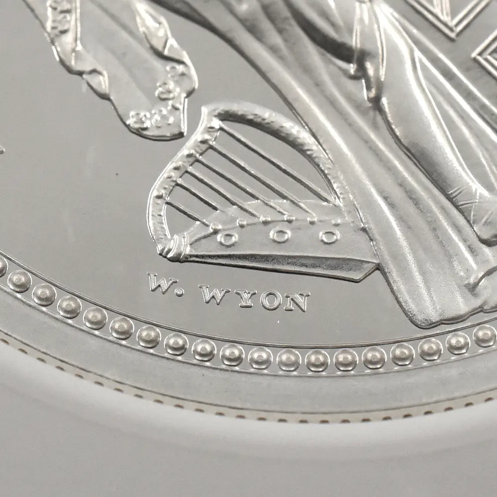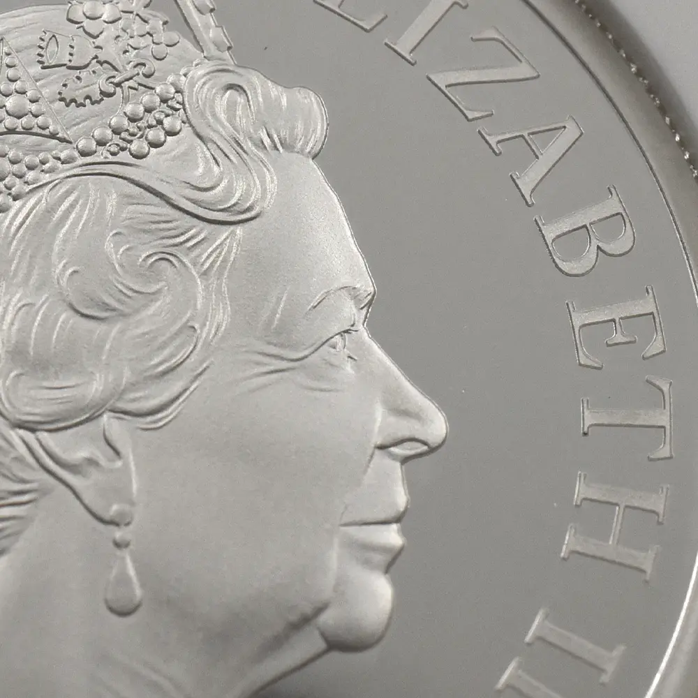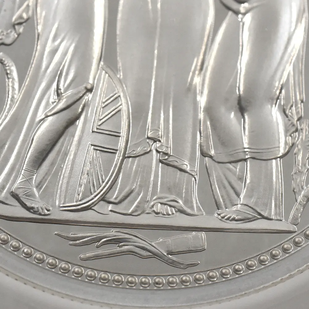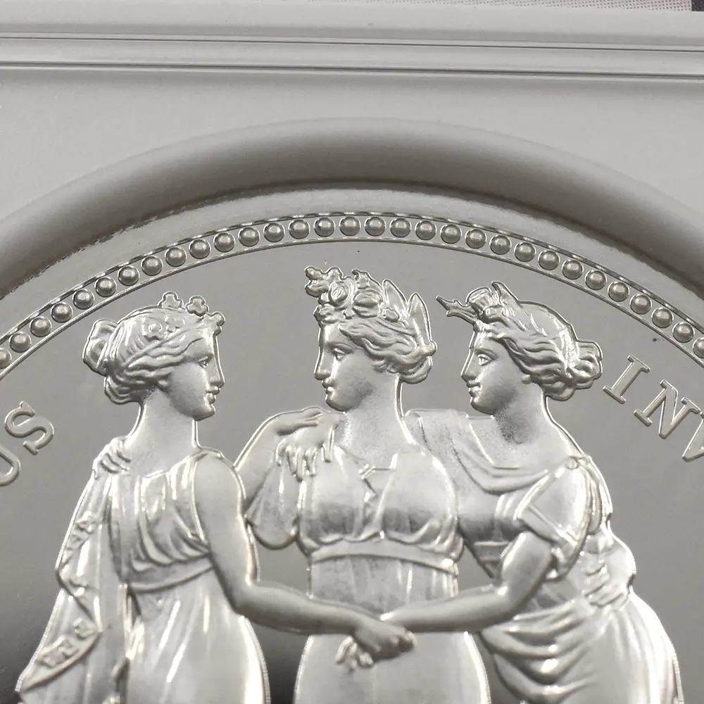 当銀貨表面に描かれているエリザベス二世の格調高いポートレートは現代を代表するロイヤルミントのデザイナー、ジョディ―・クラークの最高傑作です。女王の頭部を飾る英国王室屈指の至宝「ステート・ダイアモンド・ダイアデム」は、シルバーの素材感によって驚異的な重厚感を醸し出しています。ワイオンの手による数ある名品の中でも最も柔らかな質感を表現し尽くしている「スリーグレーセス」の意匠ですが、シルバープルーフの新鮮な輝きが三美神の柔らかな肢体と流れるようなドレープの美しさを最大限強調しており、見どころの多さがその特徴となっています。コインの表裏にそれぞれの時代の傑作を頂く当銀貨は、ロイヤルミントによる貨幣製造技術の粋を極めた完成度の高さによって現代に蘇った奇跡的名貨です。三美神に代表される英国の理想は艶やかなシルバーの輝きと共に永久不滅となりました。