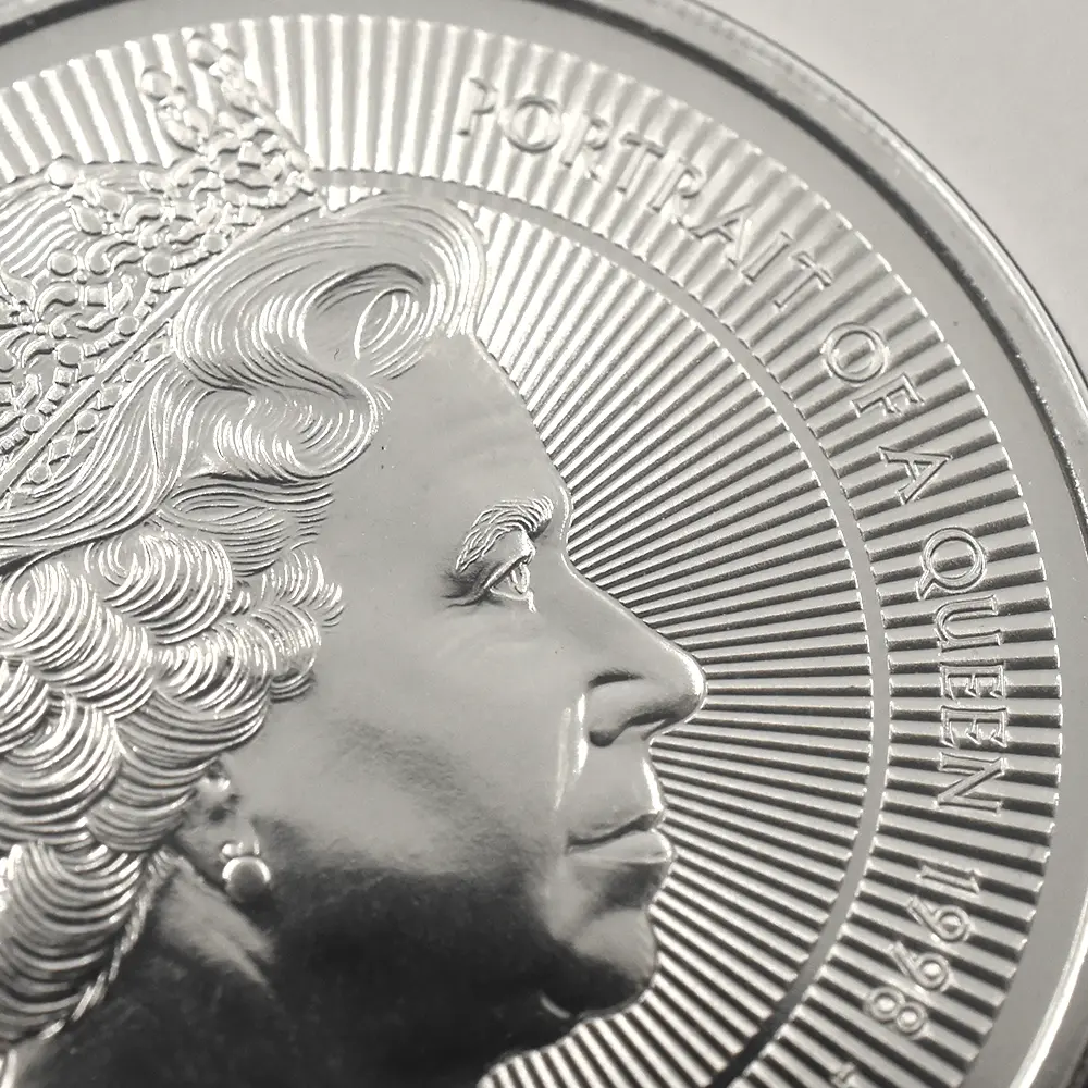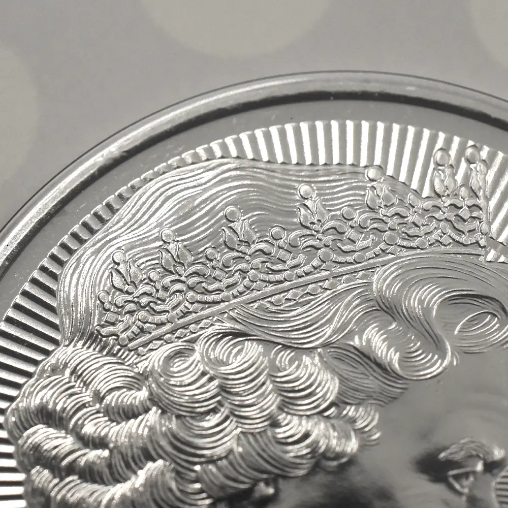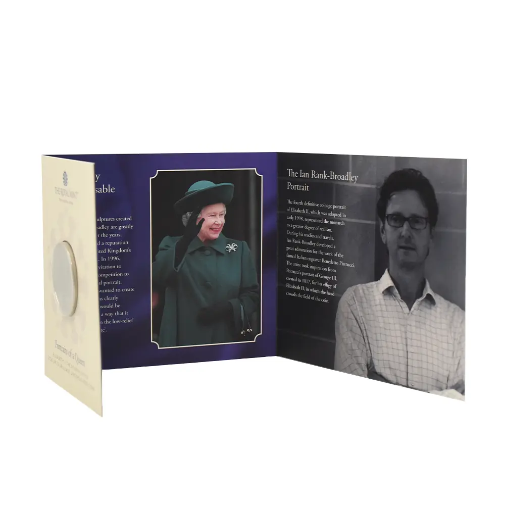 70年以上に及ぶ記録的な長期在位期間によって、イギリス連合王国のエリザベス2世(1926-2022)は過去のどの英国君主にも増して圧倒的存在感を歴史上に誇示しました。その栄光の70年間に発表された公式コイン肖像は全5種を数えますが、そのどれもがそれぞれの時代のイギリスのシンボルとして重要な役割を果たし、今なお世界中の多くの人々に記憶されていることと思われます。1952年、ジョージ6世の突然の崩御によってイギリス連合王国全体が深い悲しみに包まれる中、王位継承順位第1位のエリザベス王女が「エリザベス2世」として王位を継承しました。19世紀の伝説の君主ヴィクトリア女王の即位から115年目にして初めて誕生したこの女性君主の即位に連合王国全体が一筋の光明を見出し、第2次世界大戦後の荒廃からの完全なる脱却を果たした思いでした。翌1953年6月2日にロンドンのウェストミンスター寺院で開催された新女王の戴冠式は今日半ば伝説化していますが、時同じくして女王の治世初の公式コイン肖像が発表され大きな話題を呼びました。イギリス連合王国内で流通する全ての流通貨と記念コインの表面を飾るに相応しい出来栄えを誇るコイン上のポートレートは、当時20代後半に差し掛かったばかりの颯爽たる女王の横顔を浮かび上がらせていたからです。「ヤングヤング・エリザベス」の愛称で知られるこの気高い作品は、1950年代初頭のロイヤルミントで活躍していたベテラン彫刻家メアリー・ギリック最晩年の大作として知られています。作品制作の過程において女王自身がギリック女史のアトリエを訪問することはなかったそうですが、女王の代わりに夫のフィリップ王子(エディンバラ公爵)が数回にわたって女史を訪問したとの記録が残っています。王子は当時大家とされていたギリック氏の出来栄えを高く評価していましたが、同時に幾つかの変更を女史にリクエストされたそうです。まず王子は全体的により若々しく描くことを提案したそうで、発行後の肖像は大分変更が加えられた後のものとなります。そしてもう一つは、肖像の頸部を若干縮小するということで女史の同意を得たとのことでした。王子の意向が反映された上で完成した作品は、少女の面影を残す意気揚々たる若き日の女王の姿を忠実に表現する完成されたポートレートとして日の目を見ました。その後、1968年には「公式第2コイン肖像(通称ヤング・エリザベス)」が、また1985年には「公式第3コイン肖像(通称ミドル・エリザベス)」が発表され、そのどちらもがそれぞれの時代の女王の人間味溢れる情感を映し出し好評を博しました。そして第3肖像から13年の歳月を経て発表されたのが、イギリスを代表する偉大な彫刻家として国際的な知名度の高いイアン・ランク・ブロードリーによる「公式第4コイン肖像」でした。当時72歳になったばかりの女王を描くこの崇高な作品は、女王の生涯にリリースされた全5作の中でもひと際写実性に優れていることが最大の特徴です。老境に到達した女王の峻厳な横顔には一寸の憂いも無く、母国イギリスの偉大なる過去と輝ける未来を直視しているかのような威厳すら感じ取れるほどです。今回ご紹介させていただくコインは、前3作によって絶対的評価を確立した人気モダンコインシリーズ「エリザベス2世の公式コイン肖像コレクション」の第4弾に当たる最新作です。女王の頭上には第2肖像と同じく英国王室所蔵の秘宝「大英帝国とアイルランドの少女たちのティアラ」が挿入されています。これはヴィクトリア朝末期の1893年に、アイルランドに本拠を置く女性会員のみの慈善団体が、女王の祖母に当たるメアリー・オブ・テック(後のジョージ5世妃)のためにロンドンの王室御用達宝石店「ガラード」に発注し、王室に献上したと伝えられる屈指の名品です。オリジナルを忠実に再現する当コインは、今や伝説と化したエリザベス2世の栄光の追憶に捧げられる記念品であり、英国コインならではの終わりなき感動をコレクターに約束するモダンコインの極め付きです。