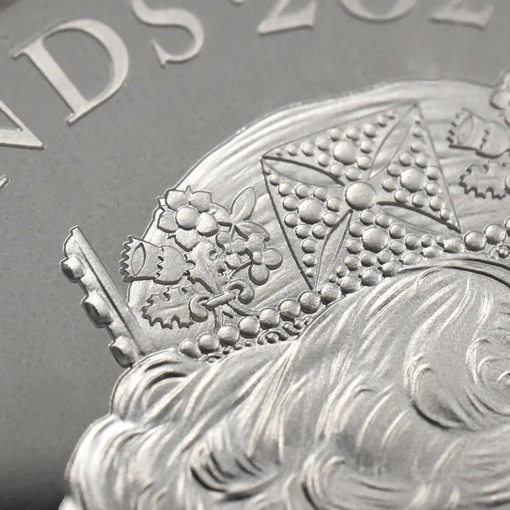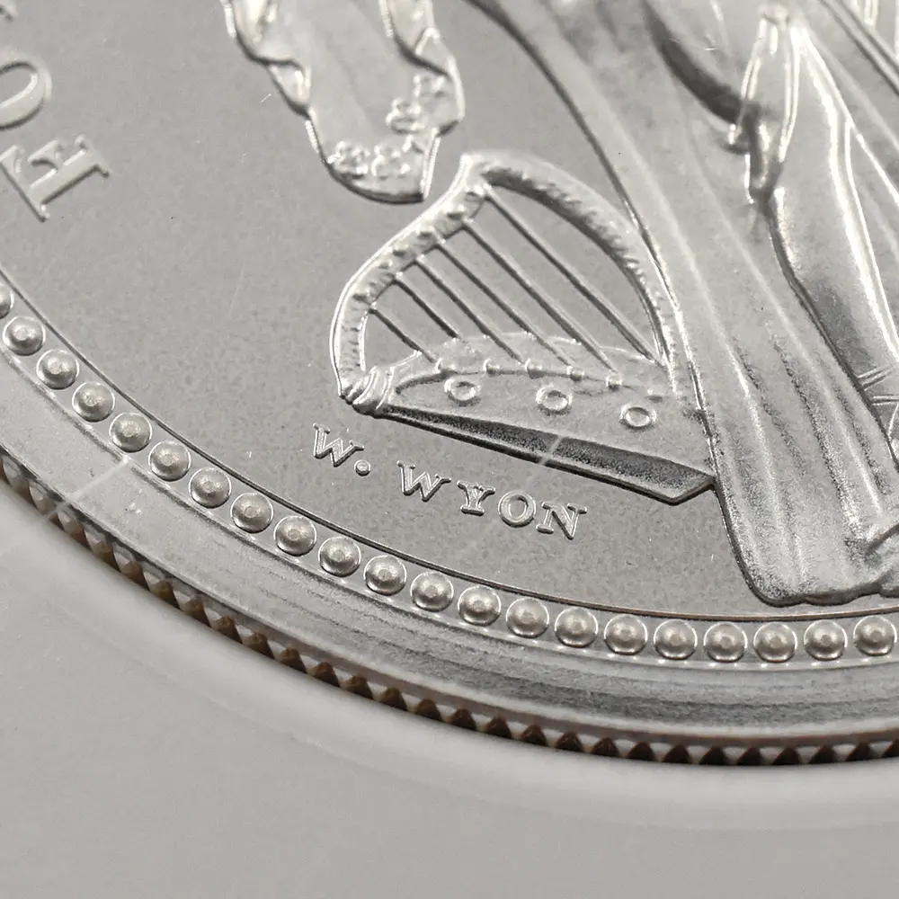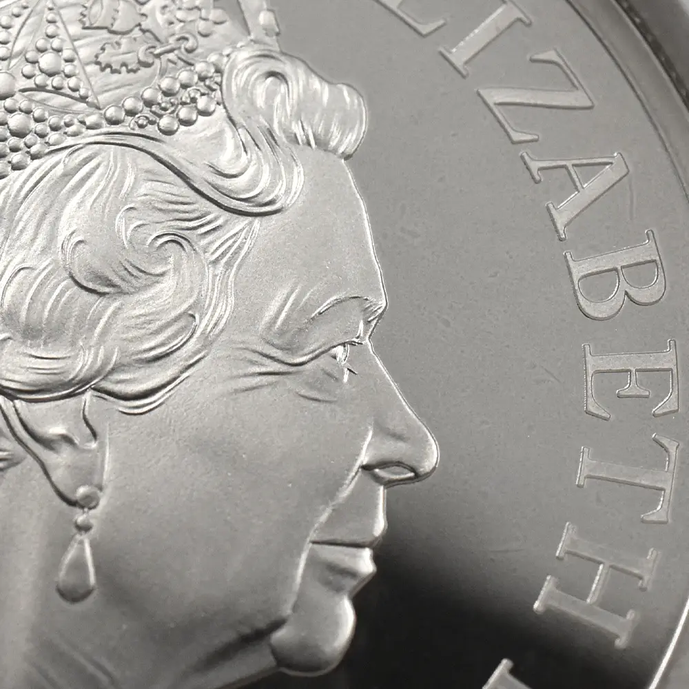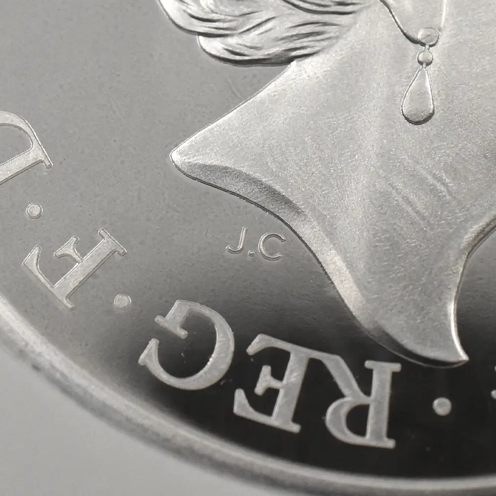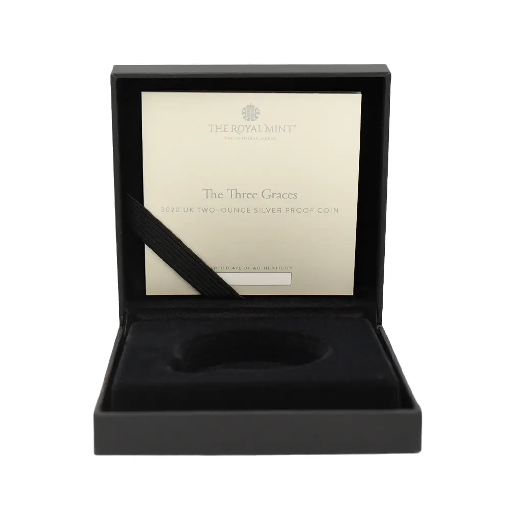 当銀貨表面に描かれているエリザベス二世の格調高いポートレートは現代を代表するロイヤルミントのデザイナー、ジョディ―・クラークの最高傑作です。女王の頭部を飾る英国王室屈指の至宝「ステート・ダイアモンド・ダイアデム」は、シルバーの素材感によって驚異的な重厚感を醸し出しています。ワイオンの手による数ある名品の中でも最も柔らかな質感を表現し尽くしている「スリーグレーセス」の意匠ですが、シルバープルーフの新鮮な輝きが三美神の柔らかな肢体と流れるようなドレープの美しさを最大限強調しており、見どころの多さがその特徴となっています。コインの表裏にそれぞれの時代の傑作を頂く当銀貨は、ロイヤルミントによる貨幣製造技術の粋を極めた完成度の高さによって現代に蘇った奇跡的名貨です。三美神に代表される英国の理想は艶やかなシルバーの輝きと共に永久不滅となりました。