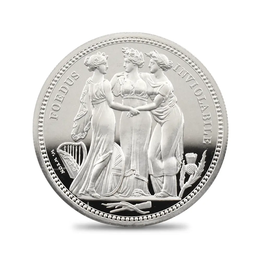 全世界的な脚光を浴び、貨幣史上空前の人気を誇ったロイヤルミントによる2019年「偉大なる芸術家シリーズ」の「ウナとライオン」に続く第2弾の満を持しての登場です。今回選定されたのは前回と同じく19世紀最高のコイン彫刻家ウィリアム・ワイオンによる最初期の傑作「スリーグレーセス」です。ワーテルローの戦いによって閉幕したナポレオン戦争後の英国社会の安定と平和を背景とする三人の女神たちの無言の対話を描くデザインによって称賛され続けています。ギリシャ神話に材を求めて描かれた三美神は、それぞれ若さ・歓喜・気品を象徴しており、崇高な空気を醸し出しています。19世紀初頭に頂点を極めた新古典様式を基調として描かれる三人の姿は、足元に見られるそれぞれの国家のシンボルと共に連合王国の確固たる統一を暗示しています。当銀貨最大のメッセージは三美神の繊細優雅な趣と、その背後に厳然として存在する英国の政治的宿願ではないでしょうか。