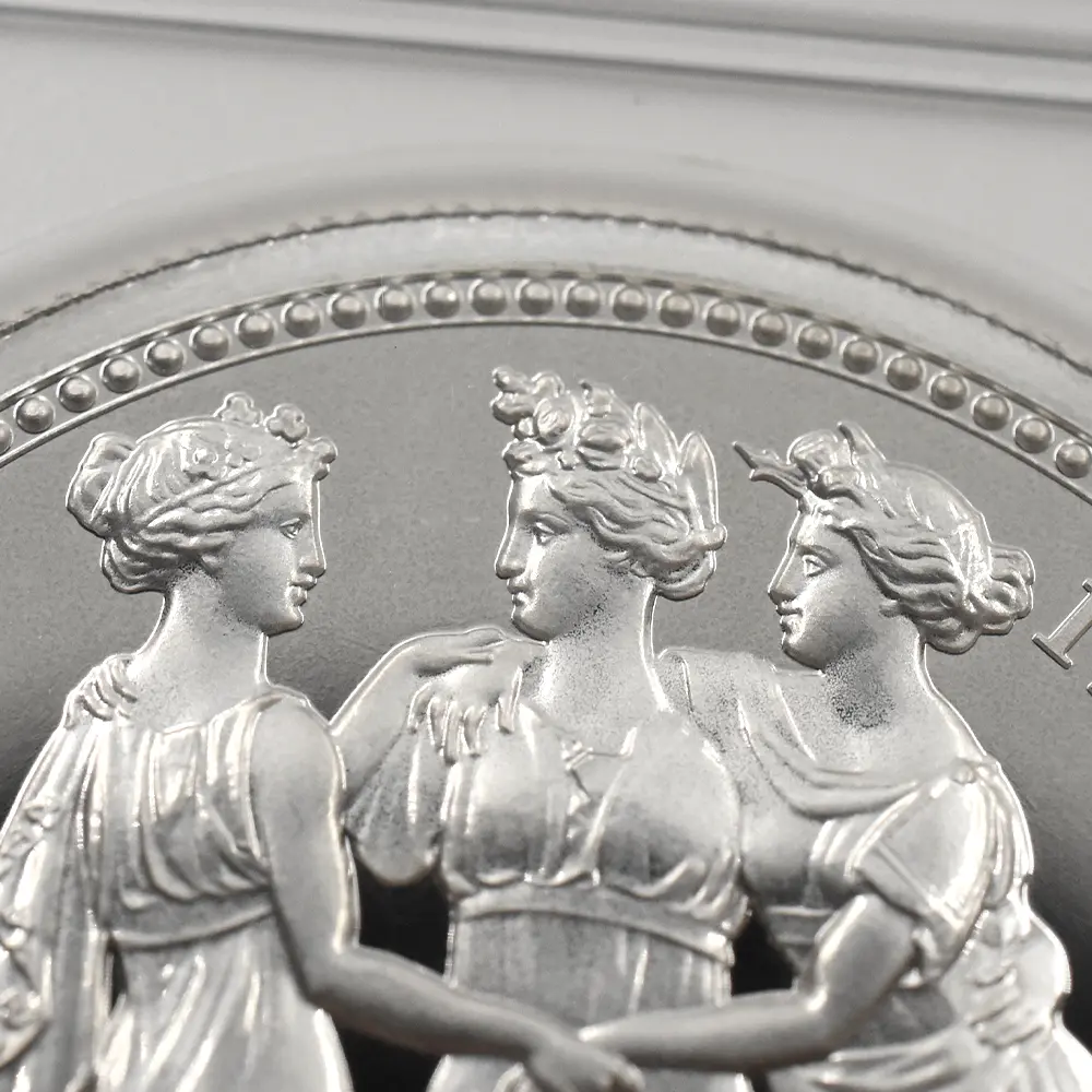 2020年版「スリーグレーセス」はワイオンによるオリジナルの意匠はそのままに、現代のテクノロジーを結集して制作された21世紀ならではの「スリーグレーセス」となっています。例えば、センサーを用いてのオリジナル金型内部のスキャニング作業が挙げられます。1817年のオリジナルの希少価値は高く現在世界に数十枚の現存が確認されているに過ぎませんが、発行された当時のプルーフ状態での銀貨を発見することはまずあり得ないと思われます。このため、2020年度版「スリーグレーセス」リマスター銀貨こそ最高のコンディションゆえに今後の価格変動を大いに期待することが出来る真の実物資産であると断言できます。