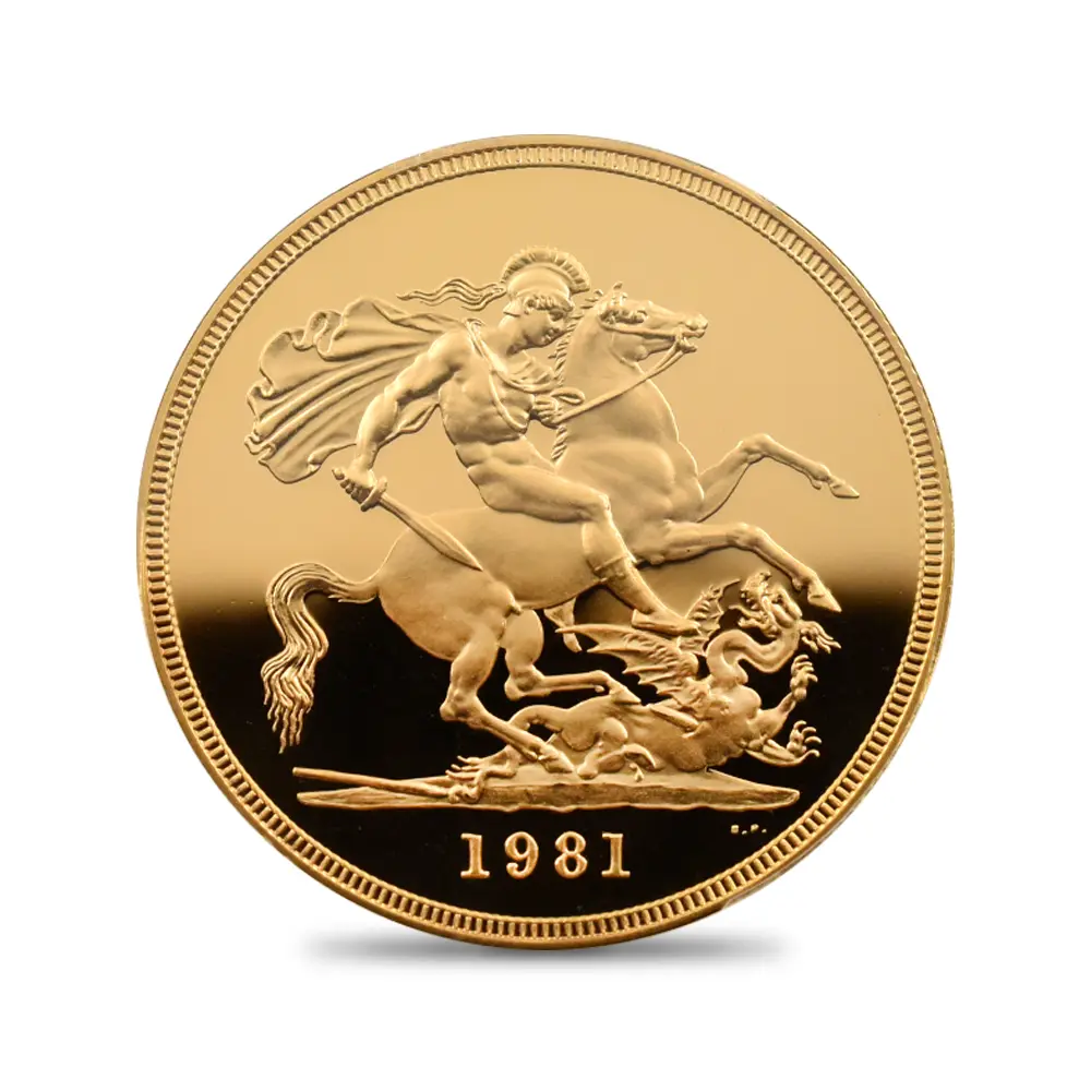1980年から4年間(1983年度版のみ未発行)にわたって発行された英国女王エリザベス2世の治世を代表するこのソブリン金貨は、その稀少性と豊かな芸術性によって英国モダンコイン最大の人気作として不動の地位を築きました。その人気の源は表面に刻まれた英国女王エリザベス2世若き日の気品あふれる肖像で、1970年代のロイヤルミントを代表するコイン・デザイナーにして英国を代表する名彫刻家として名を馳せたアーノルド・メイチンの人生を代表する大作とされているものです。細長く引き伸ばされた胸部から頭部にかけての頸筋は、若くして大国に君臨する運命を担うことになったエリザベス2世の凛として美しくも気高いオーラを醸し出しています。女王の頭部を彩る宝飾品は「大英帝国とアイルランドの少女たち」という華麗な名を冠する英国王室屈指の名品で、女王お気に入りのティアラであることからメディアに映し出される機会の多いものでもあります。崇高な趣を湛えた女王の胸像の周囲には「神の恩寵によるエリザベス2世・女王にして忠誠の守護者」と厳かな文言が続きます。ジョージ3世の治世下に彗星の如く現れ、瞬く間にロンドンのコイン制作界の寵児となった稀代の才人ベネデット・ピストルッチ。その有り余る才能を駆使して生み出したのが英国コインの永遠のテーマである「聖ジョージの竜退治」です。この優れた意匠を裏面に描く当ソブリン金貨は、英国における伝統の継承がコイン界においても例外ではないことを証明して見せました。過去200年以上にわたり、国王の至高の王権の象徴として数々のソブリン貨の裏面を彩ってきたこの屈指の名作は、4年間にわたって発行されたエリザベス2世のためのソブリン金貨に捧げられるだけの正当性を併せ持つものです。馬に跨って敵対する悪の権化であるドラゴンを一撃の如く退治する聖ジョージの勇壮な姿は、全世界に広がるイギリス連邦を宗主として牽引し、全ての臣民の頂点に立つ馬上のエリザベス女王を想起させるものです。これらのコインのうち1981年と1982年に発行されたコインは特に希少性が高く、モダンコイン界において稀に見る限定的な発行枚数がこれら一連のコイン発行の付加価値となっている事実に驚かされます。初年度1980年の発行枚数は10000枚と若干多かったものの、翌年1981年度版は5400枚、さらに1982年度版に至っては2500枚しか発行されておらず、最終発行であった1984年度版の8000枚と比較するとその極端な希少性が浮かび上がってきます。しかしこれらの金貨の真価はその稀少性のみによって論じられる種類の物ではありません。どの時代にもその時代の顔と呼べる秀逸な金貨が必ず存在します。そしてこれらのソブリン金貨こそは、エリザベス2世の栄光の治世を恒久化するべく誕生した時代の顔として語り継がれて行くべき真の伝説に違いありません。