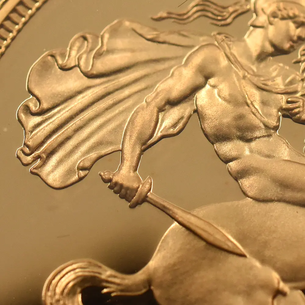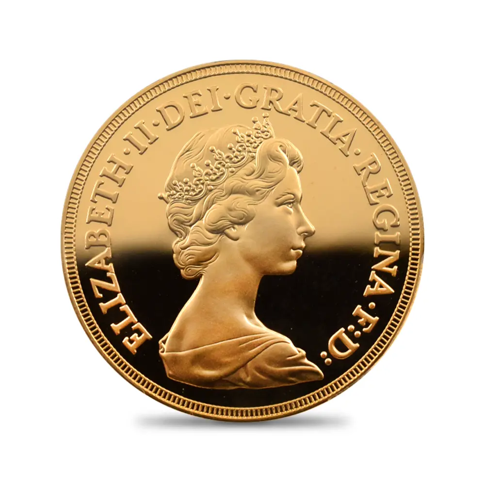 1980年から4年間(1983年度版のみ未発行)にわたって発行された英国女王エリザベス2世の治世を代表するこのソブリン金貨は、その稀少性と豊かな芸術性によって英国モダンコイン最大の人気作として不動の地位を築きました。その人気の源は表面に刻まれた英国女王エリザベス2世若き日の気品あふれる肖像で、1970年代のロイヤルミントを代表するコイン・デザイナーにして英国を代表する名彫刻家として名を馳せたアーノルド・メイチンの人生を代表する大作とされているものです。細長く引き伸ばされた胸部から頭部にかけての頸筋は、若くして大国に君臨する運命を担うことになったエリザベス2世の凛として美しくも気高いオーラを醸し出しています。女王の頭部を彩る宝飾品は「大英帝国とアイルランドの少女たち」という華麗な名を冠する英国王室屈指の名品で、女王お気に入りのティアラであることからメディアに映し出される機会の多いものでもあります。崇高な趣を湛えた女王の胸像の周囲には「神の恩寵によるエリザベス2世・女王にして忠誠の守護者」と厳かな文言が続きます。ジョージ3世の治世下に彗星の如く現れ、瞬く間にロンドンのコイン制作界の寵児となった稀代の才人ベネデット・ピストルッチ。その有り余る才能を駆使して生み出したのが英国コインの永遠のテーマである「聖ジョージの竜退治」です。この優れた意匠を裏面に描く当ソブリン金貨は、英国における伝統の継承がコイン界においても例外ではないことを証明して見せました。過去200年以上にわたり、国王の至高の王権の象徴として数々のソブリン貨の裏面を彩ってきたこの屈指の名作は、4年間にわたって発行されたエリザベス2世のためのソブリン金貨に捧げられるだけの正当性を併せ持つものです。馬に跨って敵対する悪の権化であるドラゴンを一撃の如く退治する聖ジョージの勇壮な姿は、全世界に広がるイギリス連邦を宗主として牽引し、全ての臣民の頂点に立つ馬上のエリザベス女王を想起させるものです。これらのコインのうち1981年と1982年に発行されたコインは特に希少性が高く、モダンコイン界において稀に見る限定的な発行枚数がこれら一連のコイン発行の付加価値となっている事実に驚かされます。初年度1980年の発行枚数は10000枚と若干多かったものの、翌年1981年度版は5400枚、さらに1982年度版に至っては2500枚しか発行されておらず、最終発行であった1984年度版の8000枚と比較するとその極端な希少性が浮かび上がってきます。しかしこれらの金貨の真価はその稀少性のみによって論じられる種類の物ではありません。どの時代にもその時代の顔と呼べる秀逸な金貨が必ず存在します。そしてこれらのソブリン金貨こそは、エリザベス2世の栄光の治世を恒久化するべく誕生した時代の顔として語り継がれて行くべき真の伝説に違いありません。