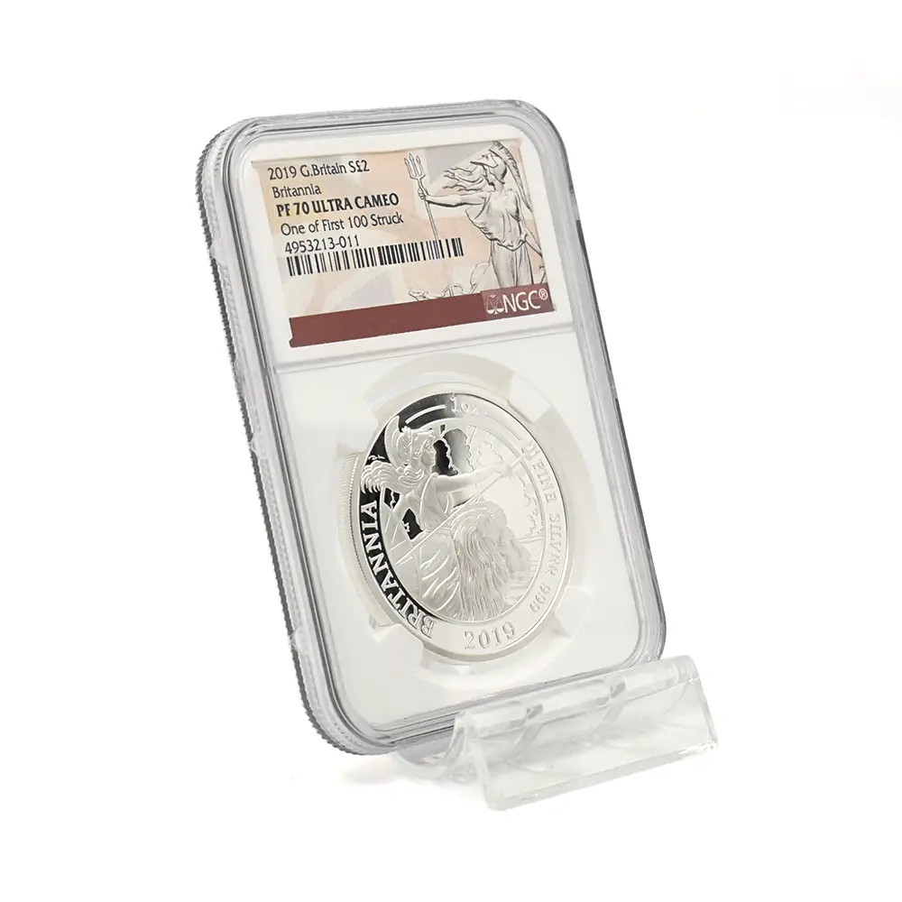 イギリス 2019 エリザベス2世 ブリタニア 2ポンド1オンス銀貨 ファースト100ストラック NGC PF70UC COA付き