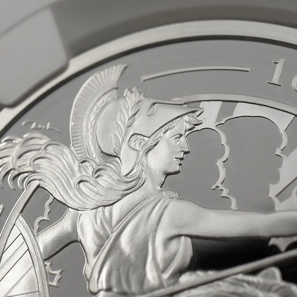 擬人化された英国そのものと評される女戦士ブリタニアの存在ほどに、英国コインの題材として相応しい表象は無いことと思われるほどです。古代ローマ帝国の属州であった現在のグレートブリテン島ですが、当時はまだ北海沿岸の孤島に過ぎず、国家としての基盤は未だ構築されていませんでした。しかし無限の発展性を秘めたこの美しい島に憧れを抱き、いつしかその大地を「ブリタニア」と呼ぶようになり、女神の姿になぞらえたのもまた誇り高きローマ人達でした。フランスのマリアンヌやドイツのゲルマニアと並んで国家を象徴する女神として描かれることの多いブリタニアですが、その由来は最も古く、また過去に発表された文芸作品のインスピレーションの源であった期間はそのどれよりも長く、深遠な歴史的背景を持ちます。三又の槍トライデントを携え、盾を掲げるブリタニアは女戦士の姿で描かれているものの、直接的に争いを賛美したり象徴するわけではありません。むしろ平和と調和の象徴と捉えられる傾向が強く、その点もブリタニアが広く愛される所以であると思われます。
